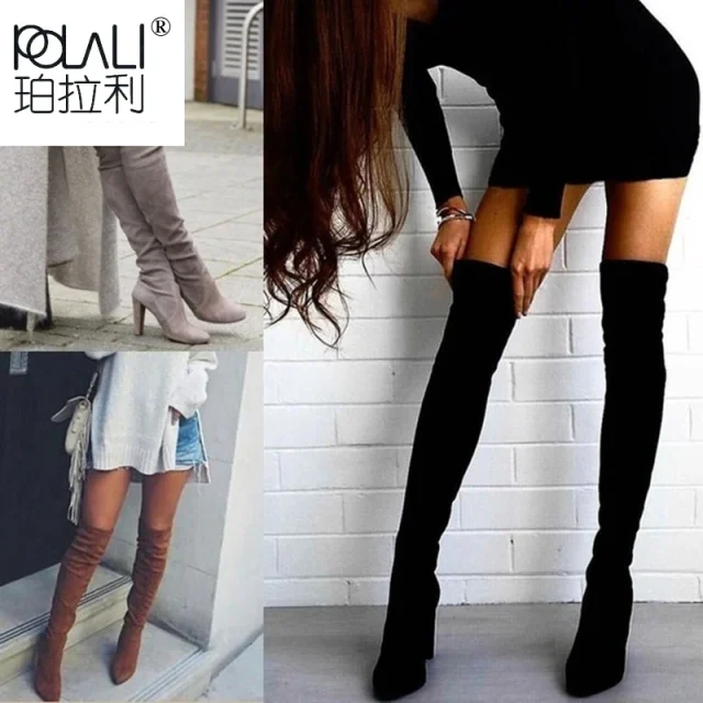 POLALI 2020 New Flock Leather Women Over The Knee Boots Lace Up Sexy High Heels Autumn Woman Shoes Winter Women Boots Size 34-43