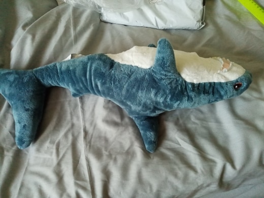 It looks exactly like the picture, I was a little worried that it wouldn't look like the IKEA shark but it genuinely does. It was a good size and it's really soft and doesn't smell :) the delivery was also great for aliexpress standards and I definitely reccomend :D