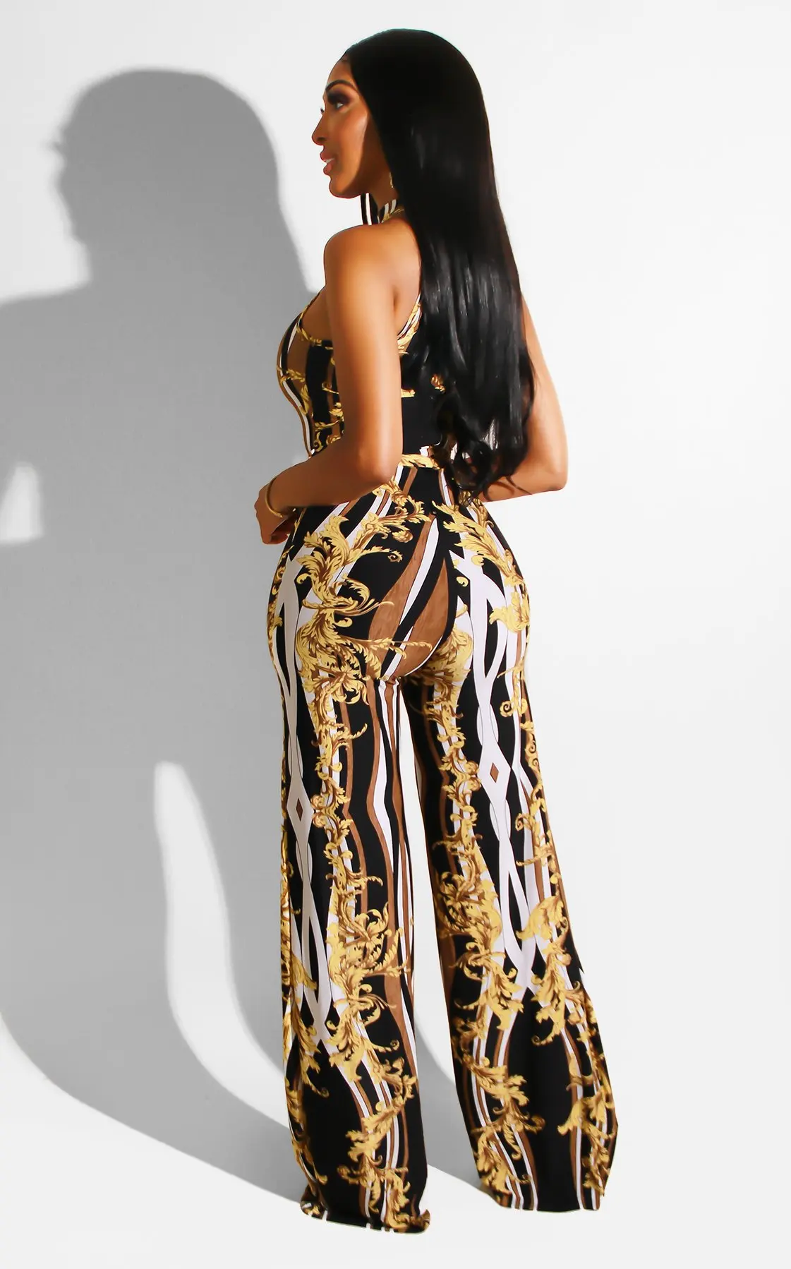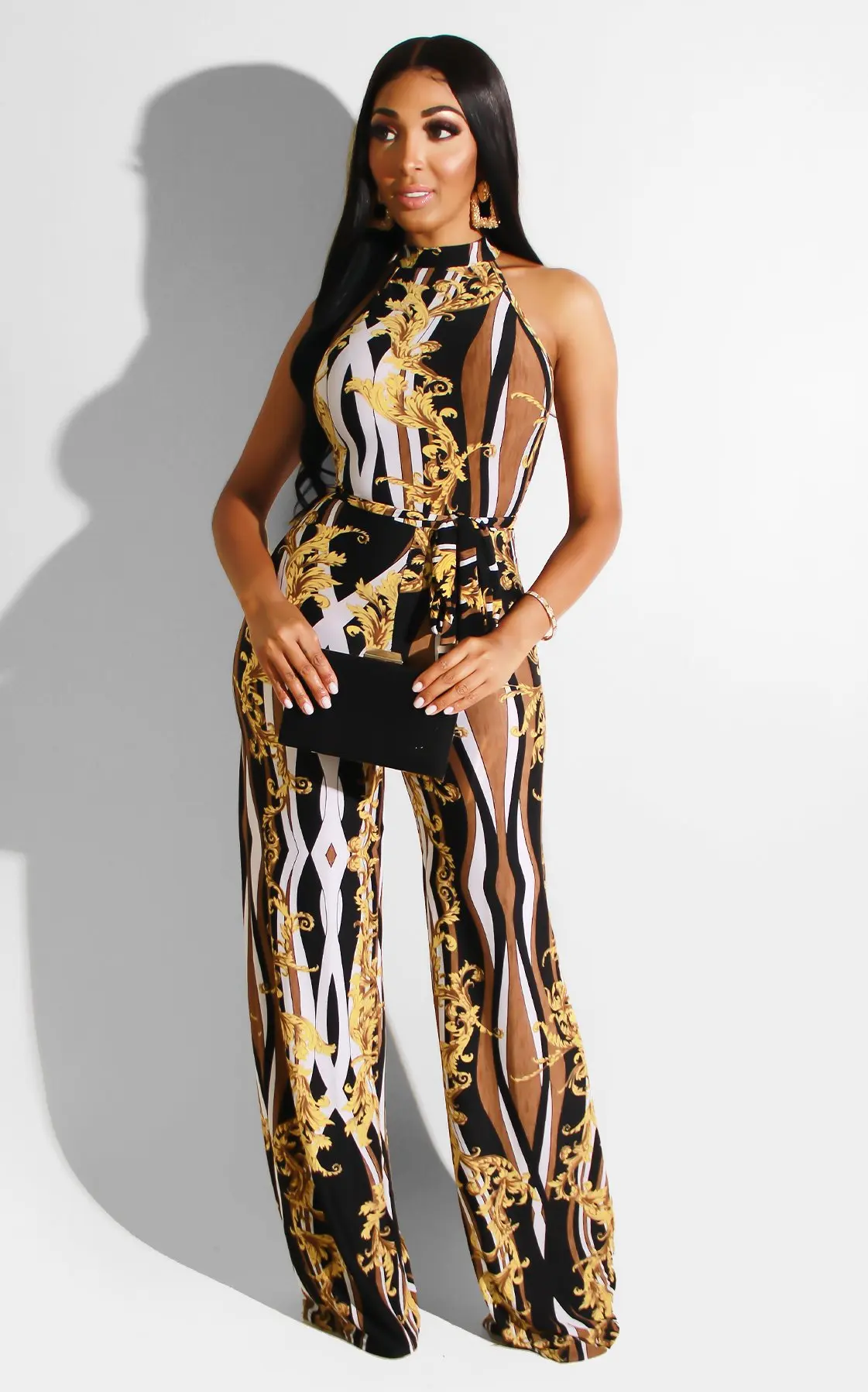 2019 women summer chain vintage print sleeveless high waist jumpsuit night club party romper beach streetwear playsuit GLR6216
