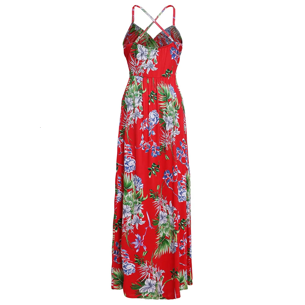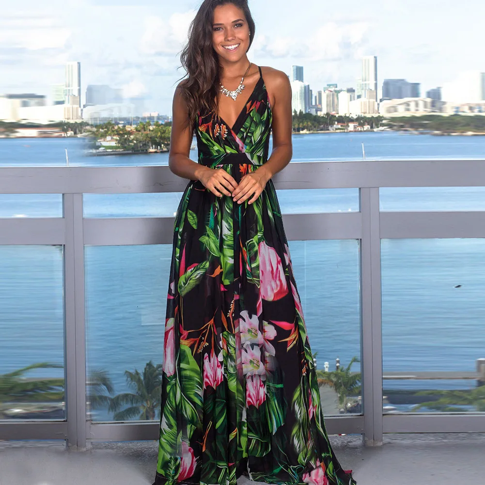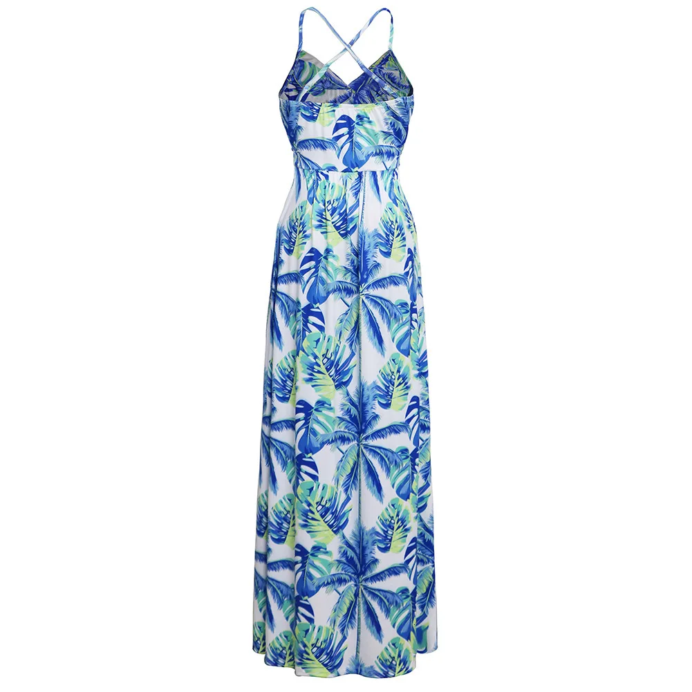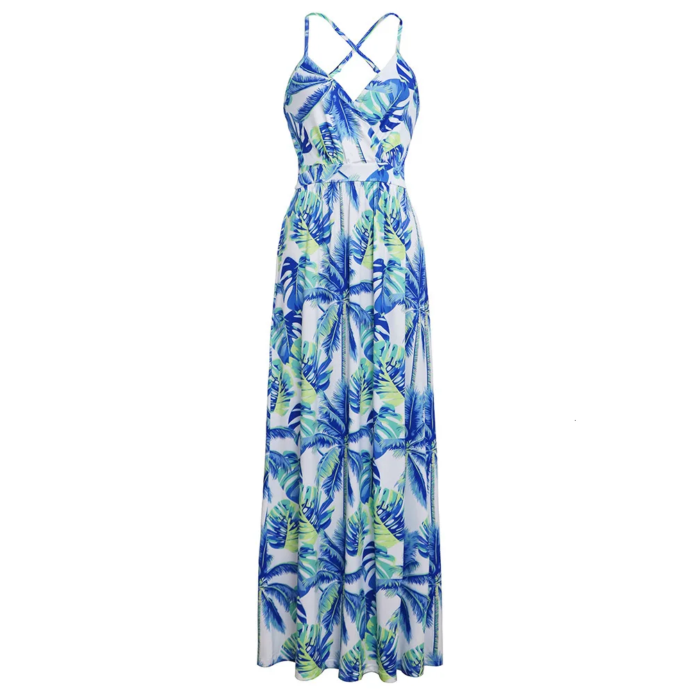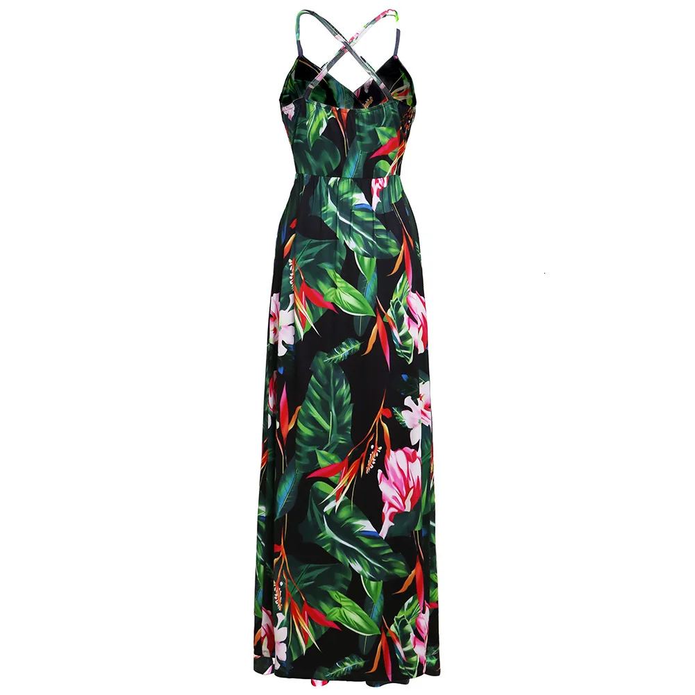 2020 Multicolor Tropical Jungle Leaf Boho Long Dress Sling Cross Back Women V neck Party Night Elegant Sexy Maxi Summer Dresses
