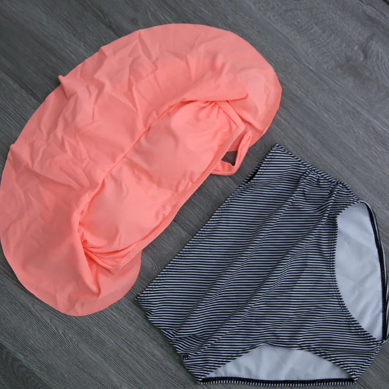 nice swimsuit, Top will need some alterations as it is very small and the bottom hem is cut wider than the top hem so it doesn't support your chest at all. quick shipping, nice fabric.
