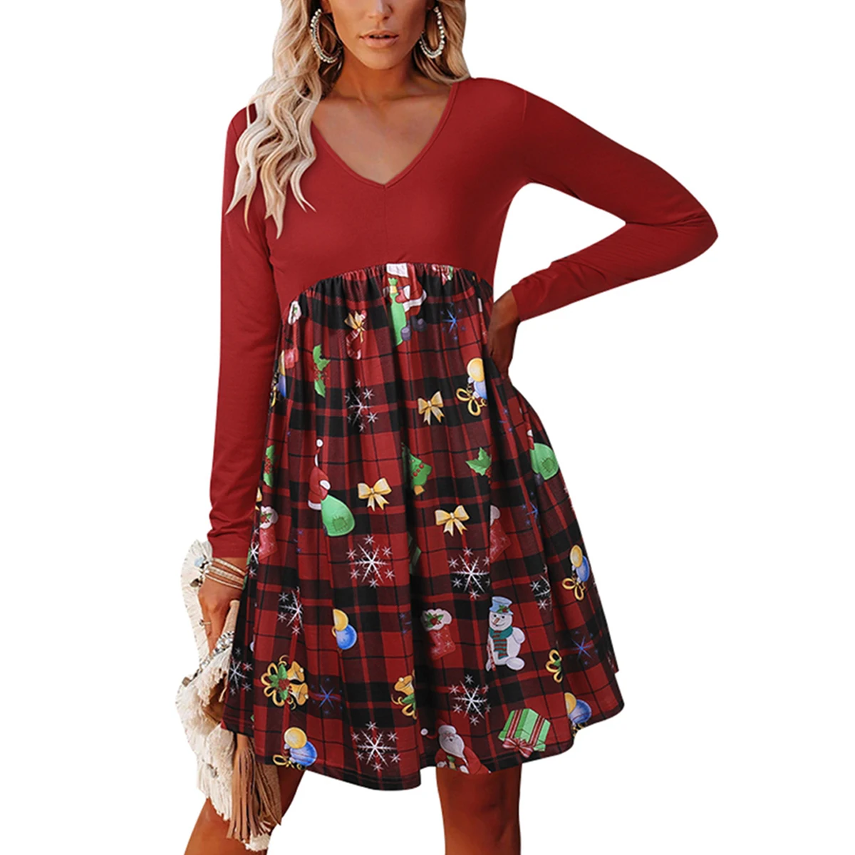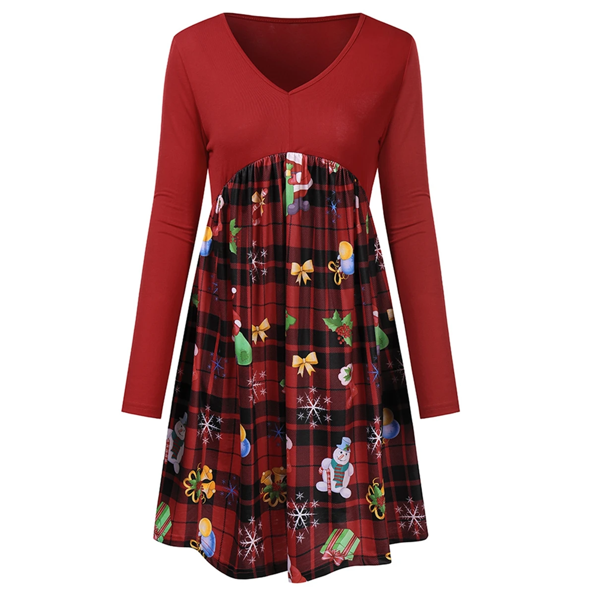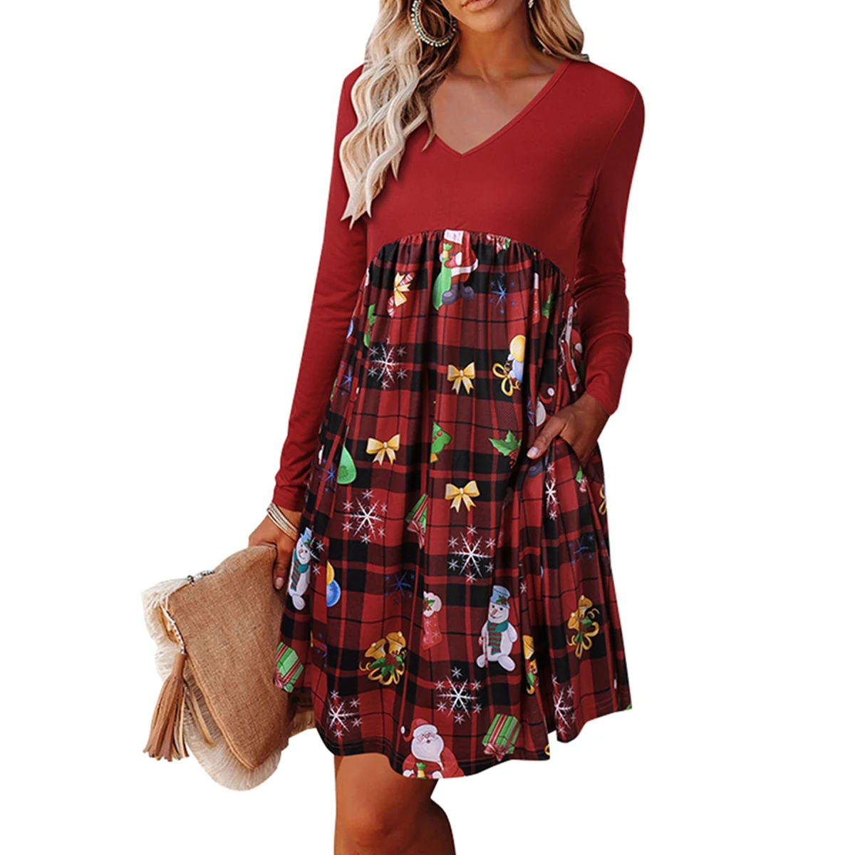 2020 Winter Womens Dress Long Sleeve V Neck Loose Casual Dress Cute Santa Claus Printed Christmas Dresses A-line Dress Vestidos
