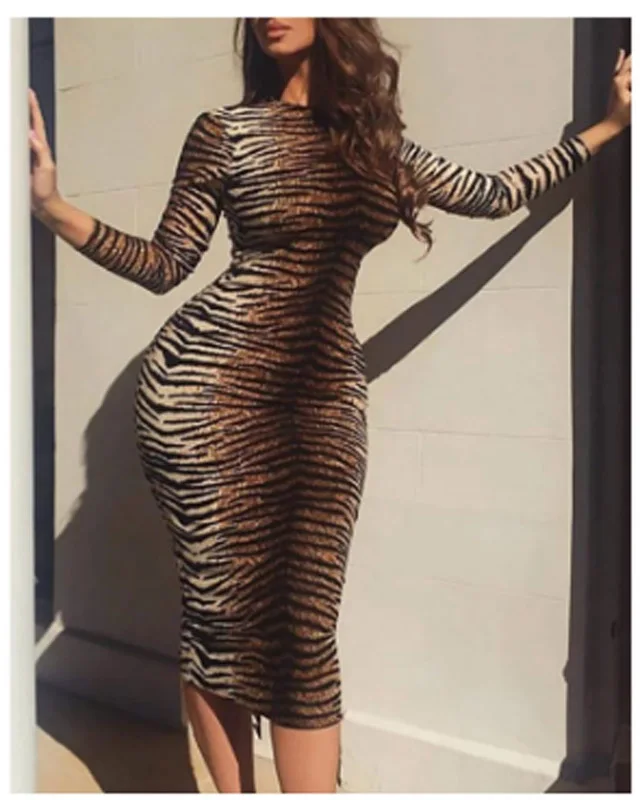 2020 Woman Dress Sexy Slim Fit Long Sleeve Turtleneck Ladies Tiger Skin Printed Party Bodycon Clubwear Sheath Clothing