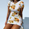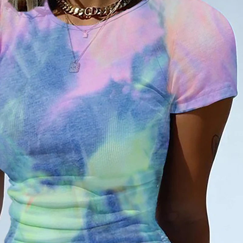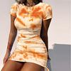 2020 Women Fashion Tie Dye Print Bodycon Dress Vestidos O Neck Short Sleeve Sexy Slim Fit Drawstring Dress Ruched Mini Dress