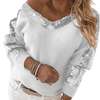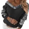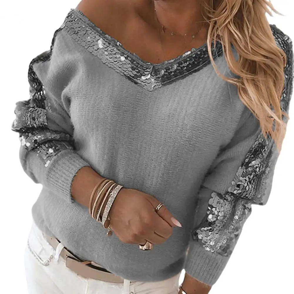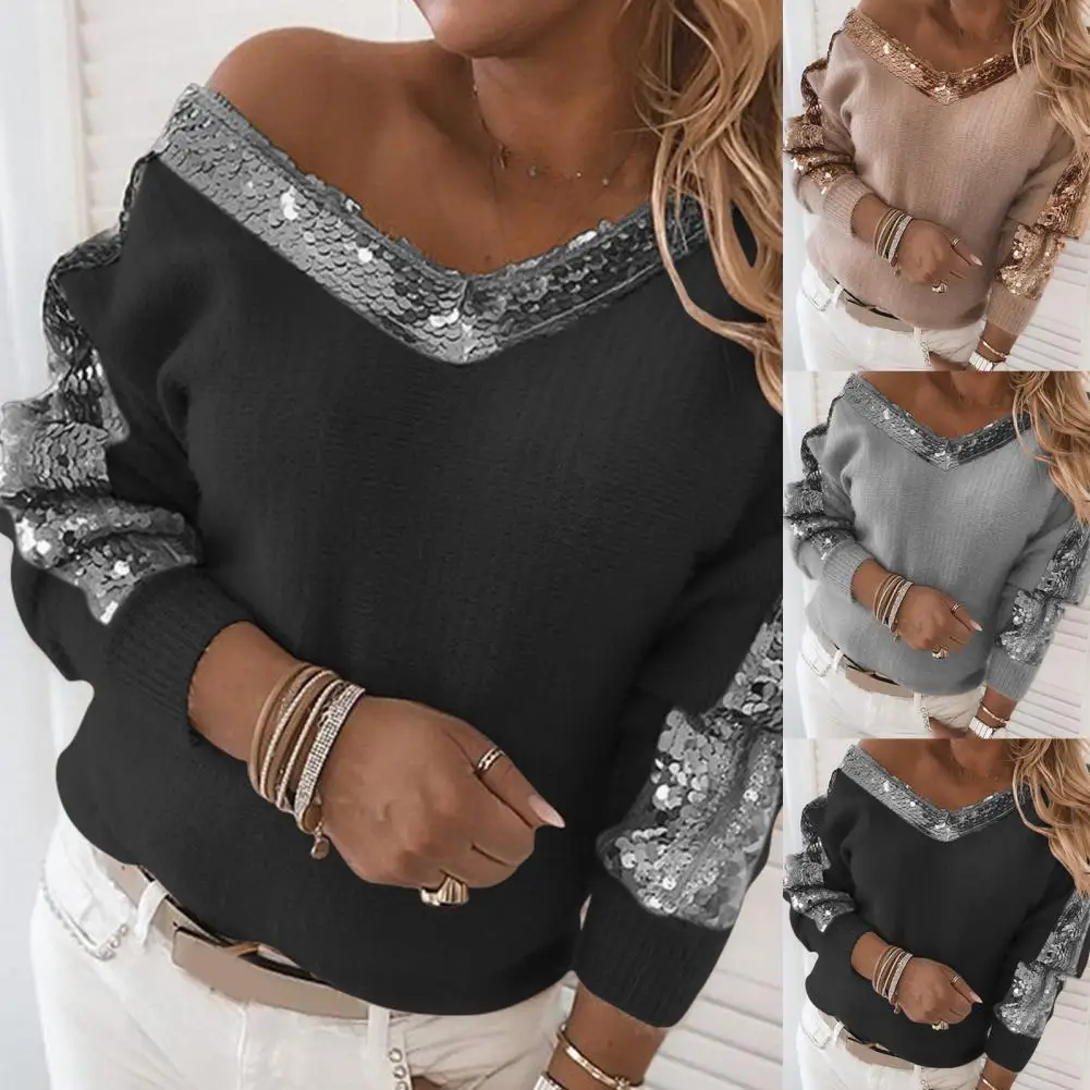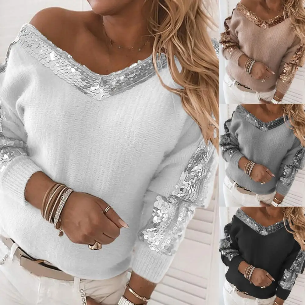 2021 Autumn Long Sleeve Sweater Women Casual Sexy V Neck Splice Sequins One Shoulder Ladies Blouse Vintage Loose Pullover Tops
