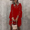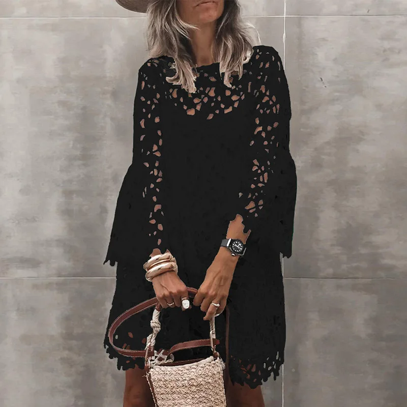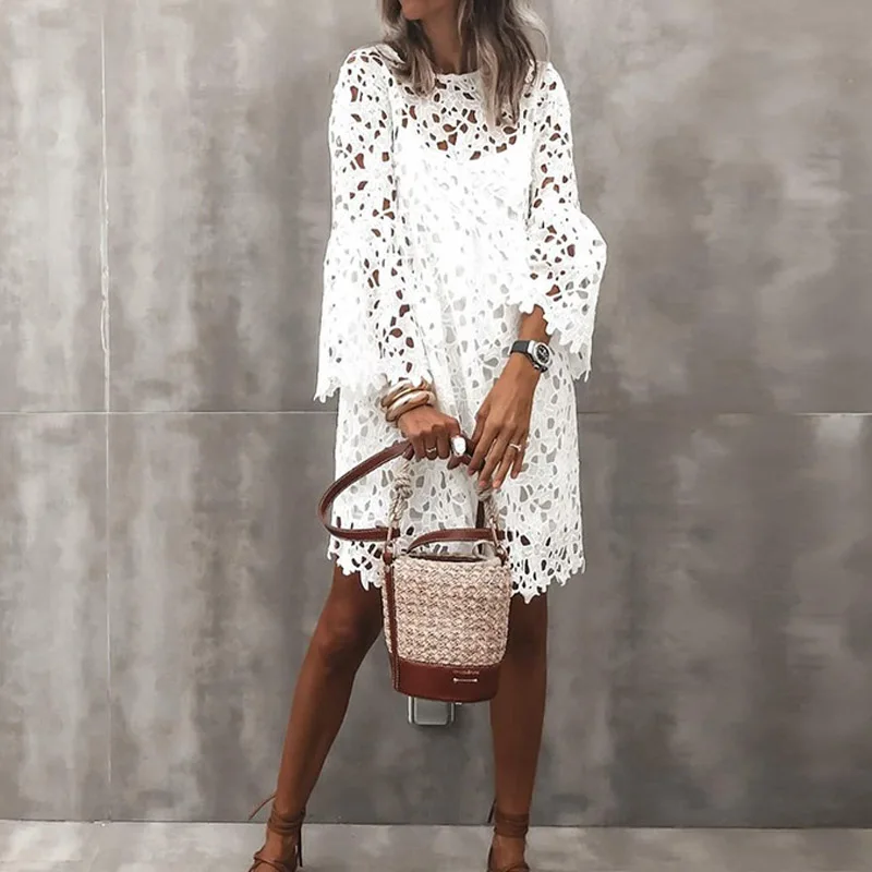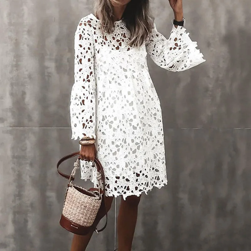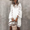 2021 Autumn Long-sleeved Dress Women O-neck Sexy Crochet Mesh Lace Lady Party Dress Fashion Solid Color Casual Loose Mini Dress