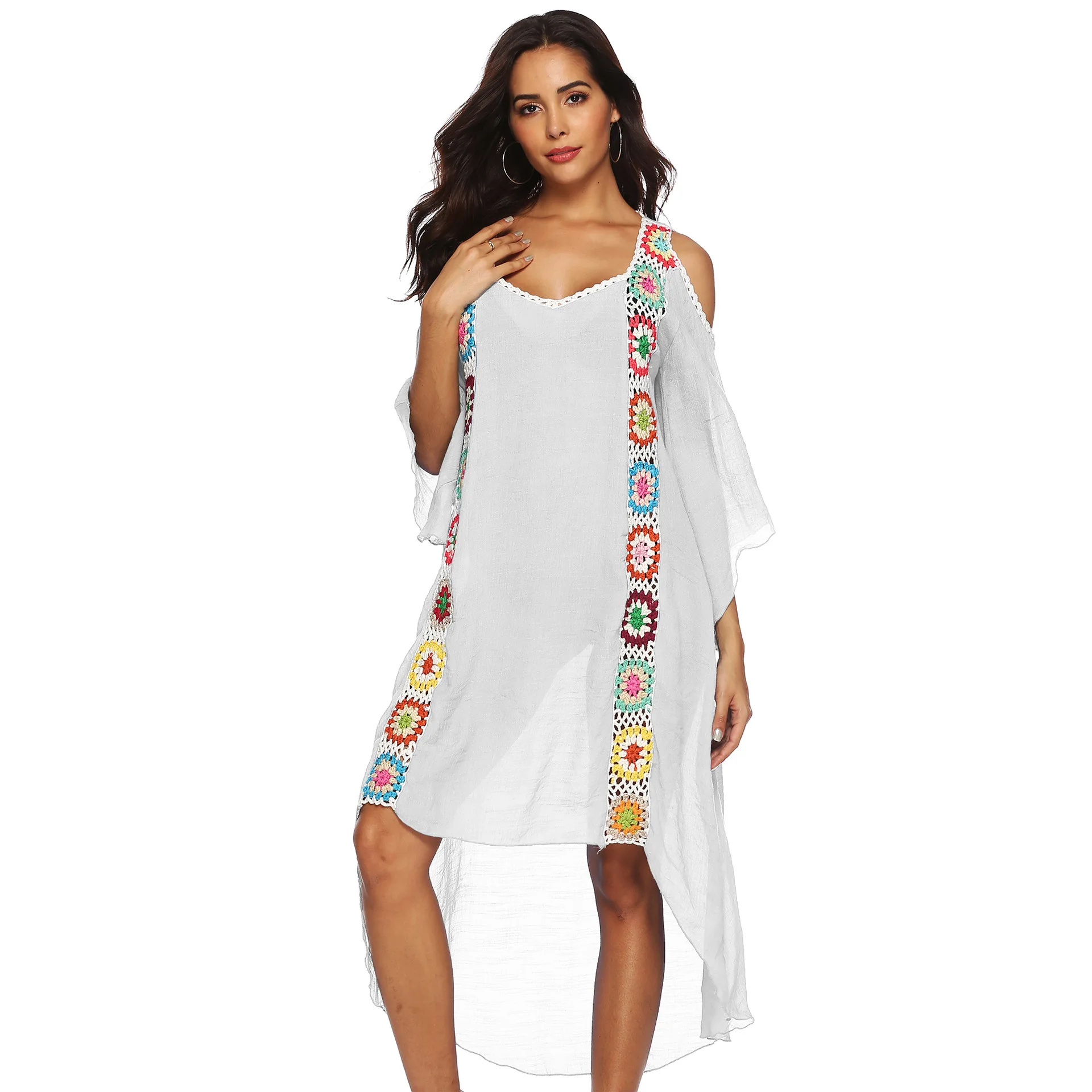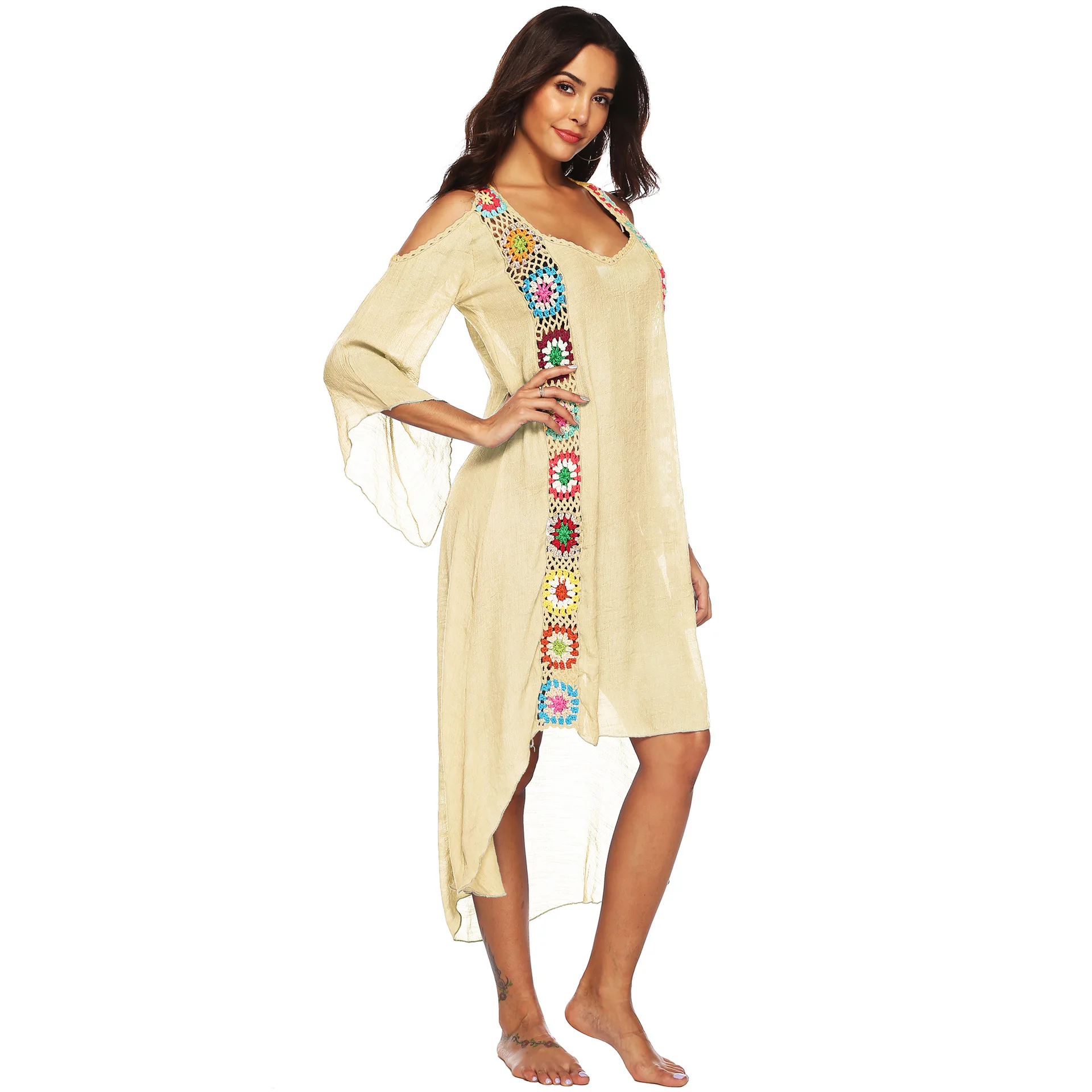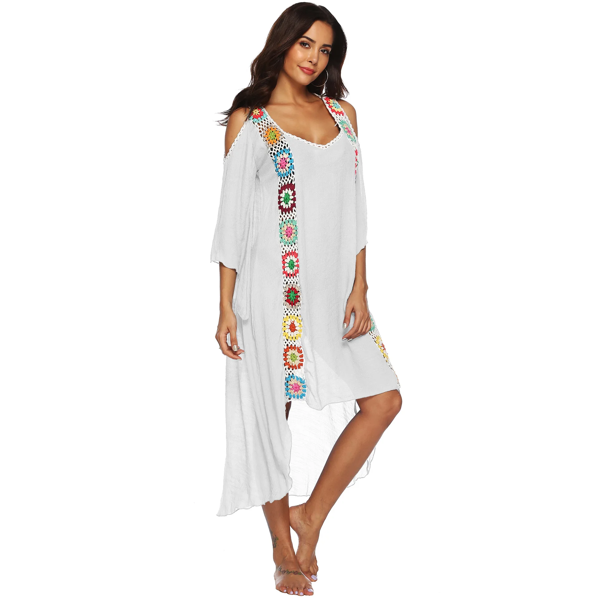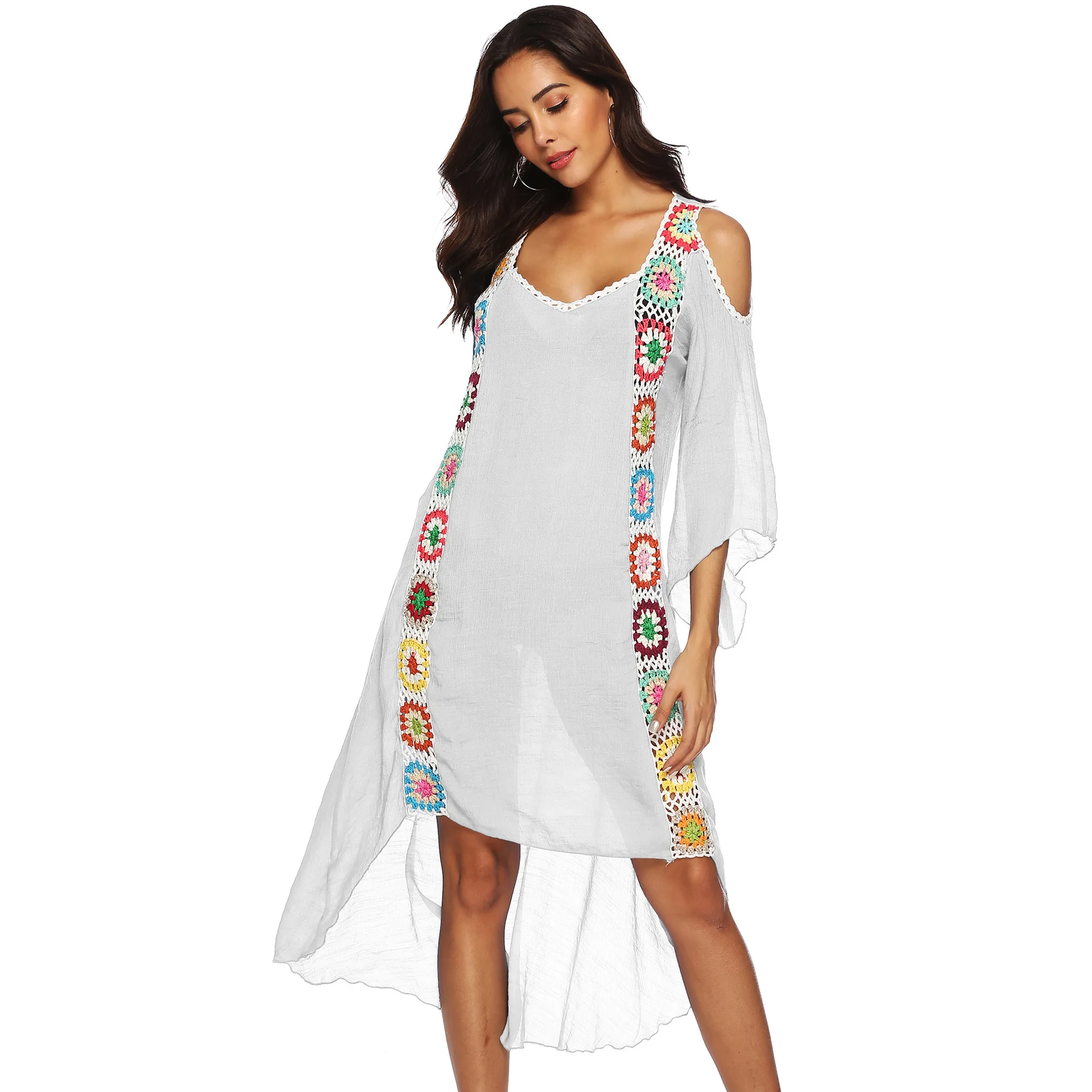 2021 Summer Multicolor Hand Hook Features Splice Shoulder Irregular Beach Smock Dress for Women