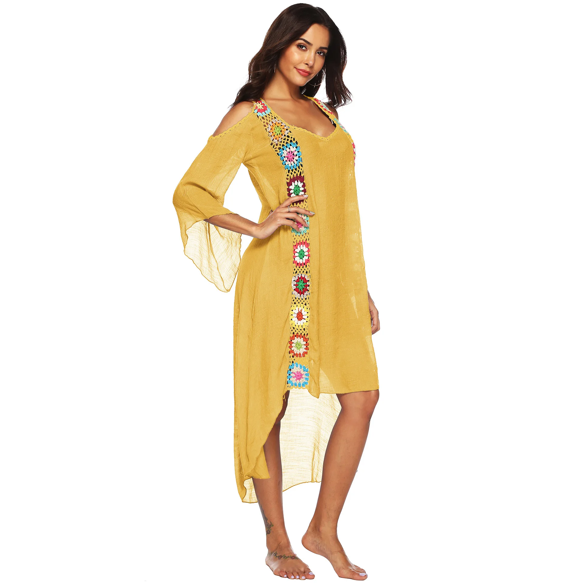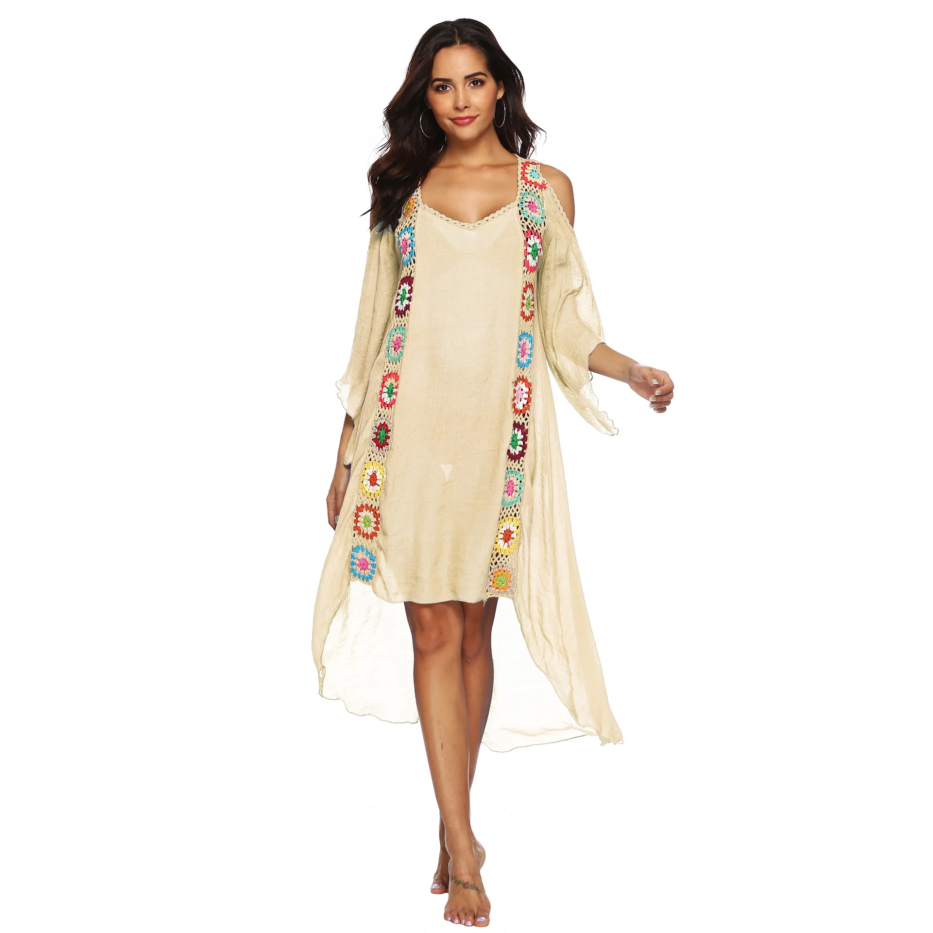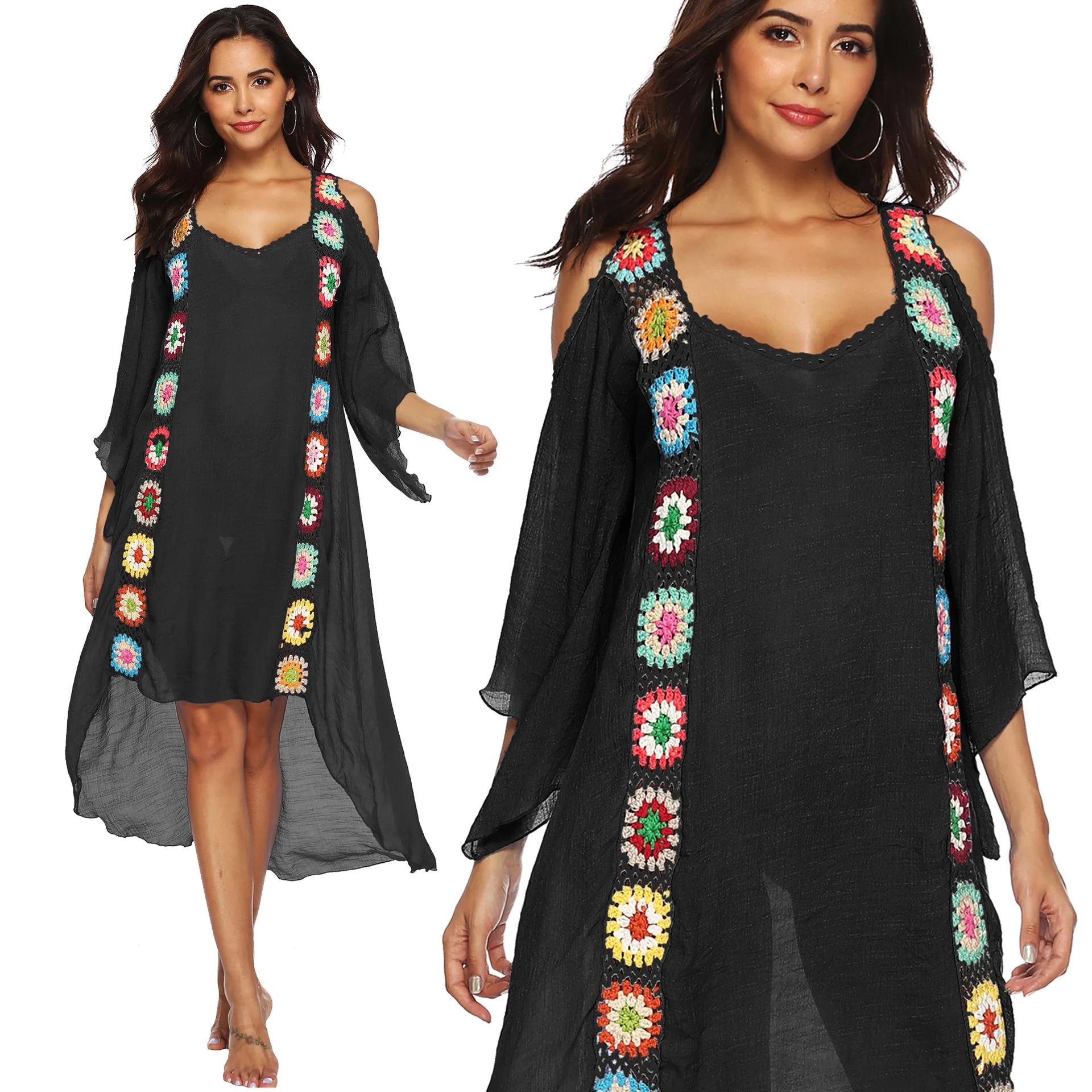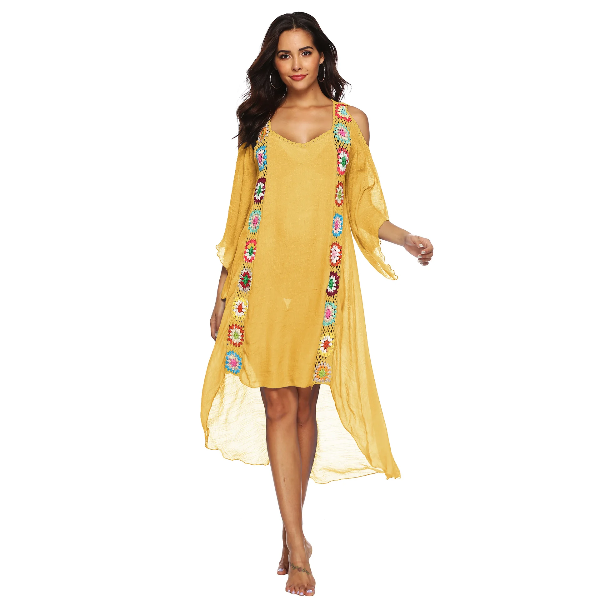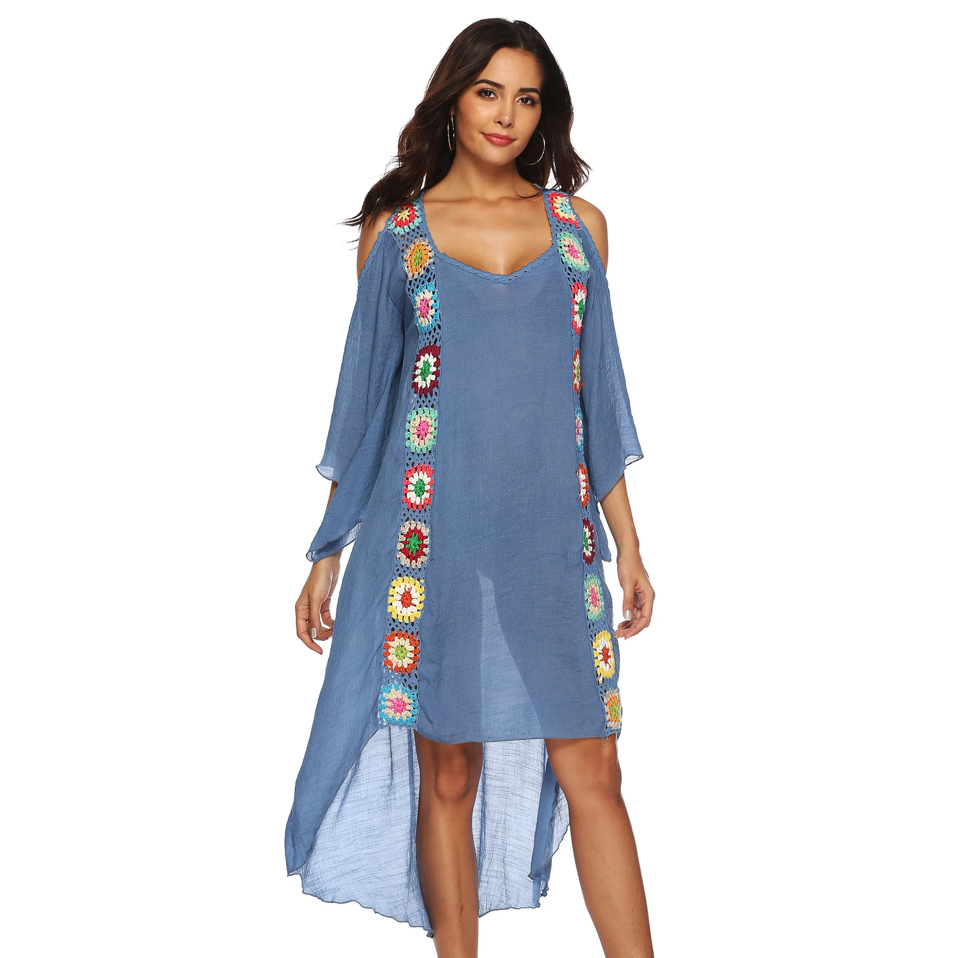 2021 Summer Multicolor Hand Hook Features Splice Shoulder Irregular Beach Smock Dress for Women