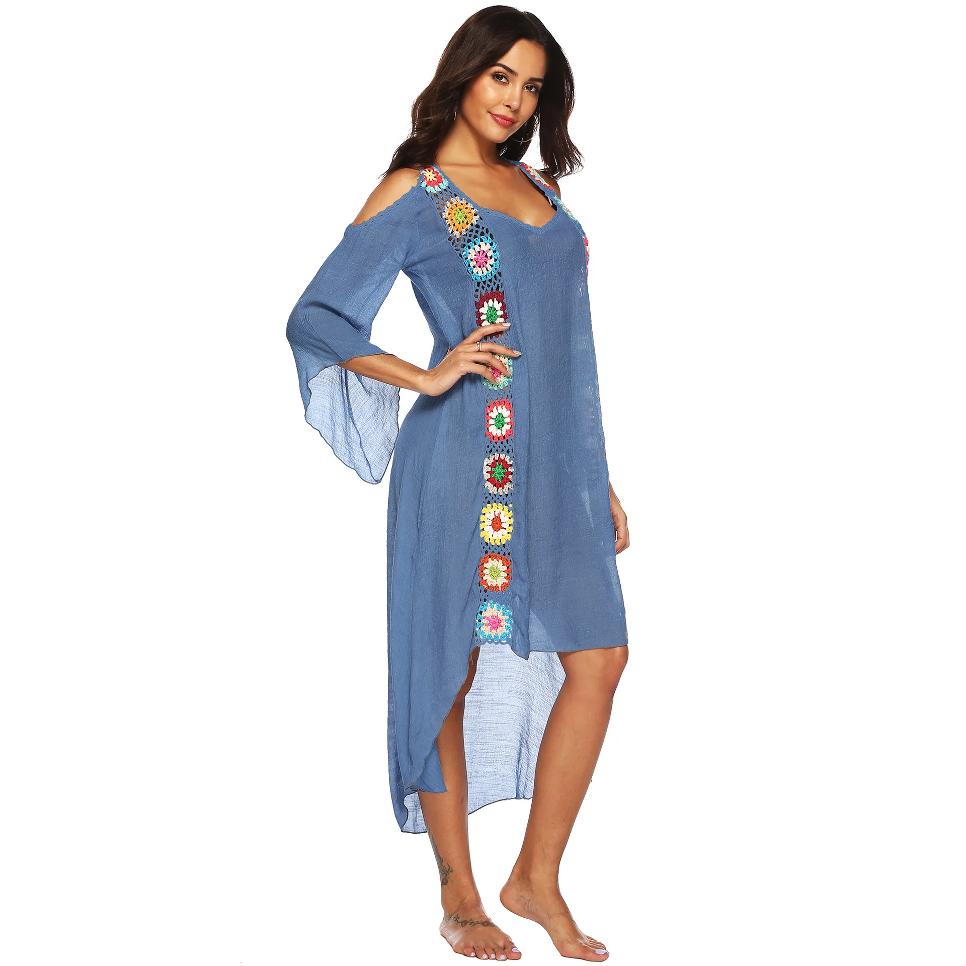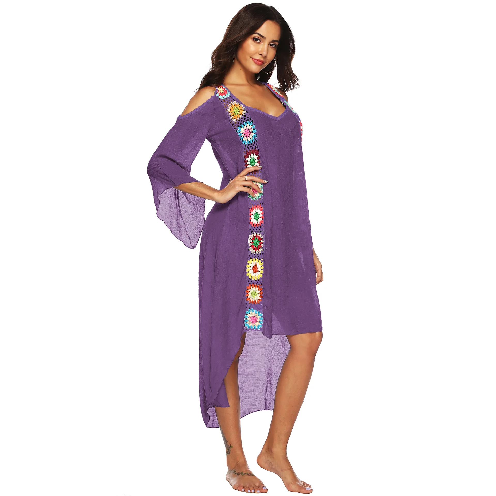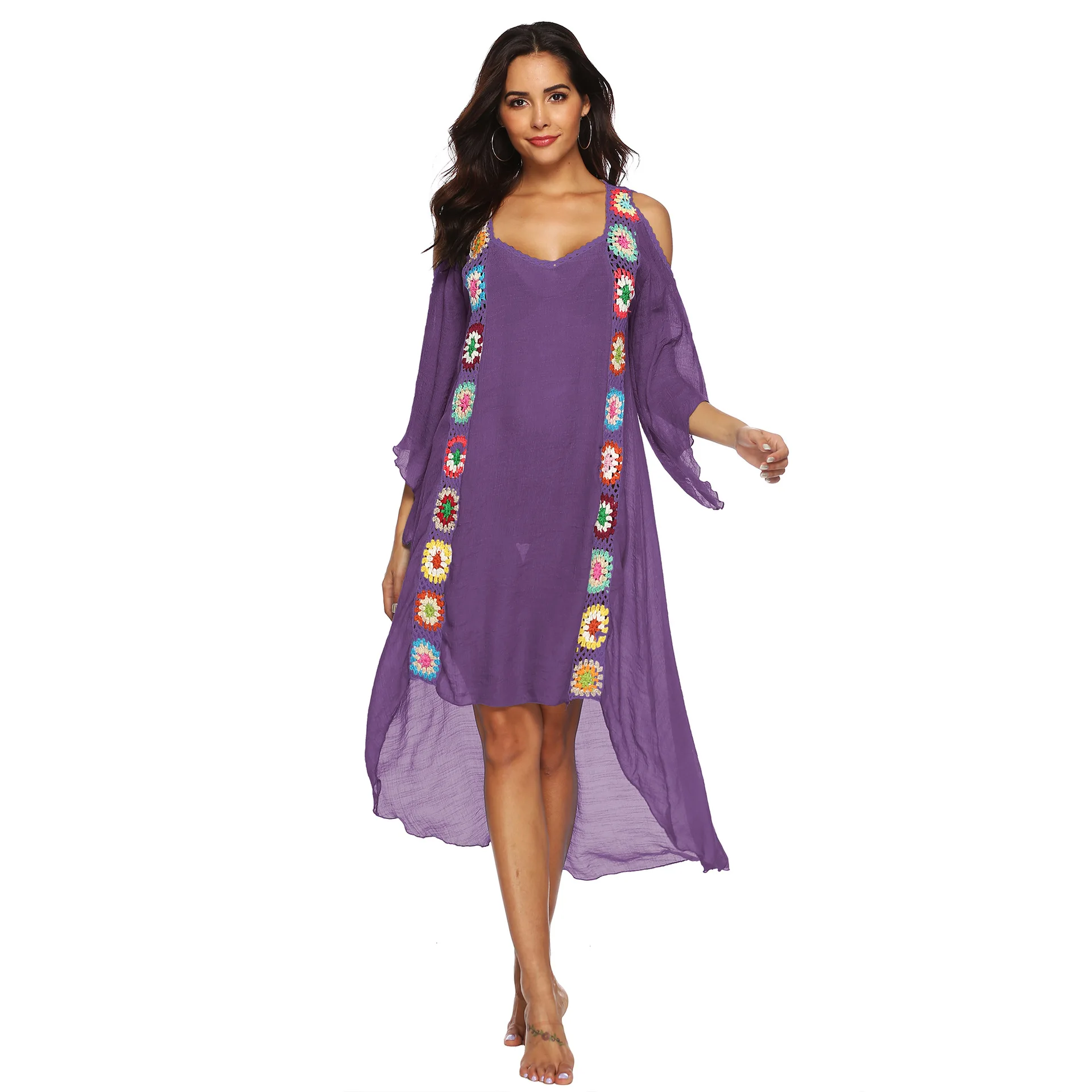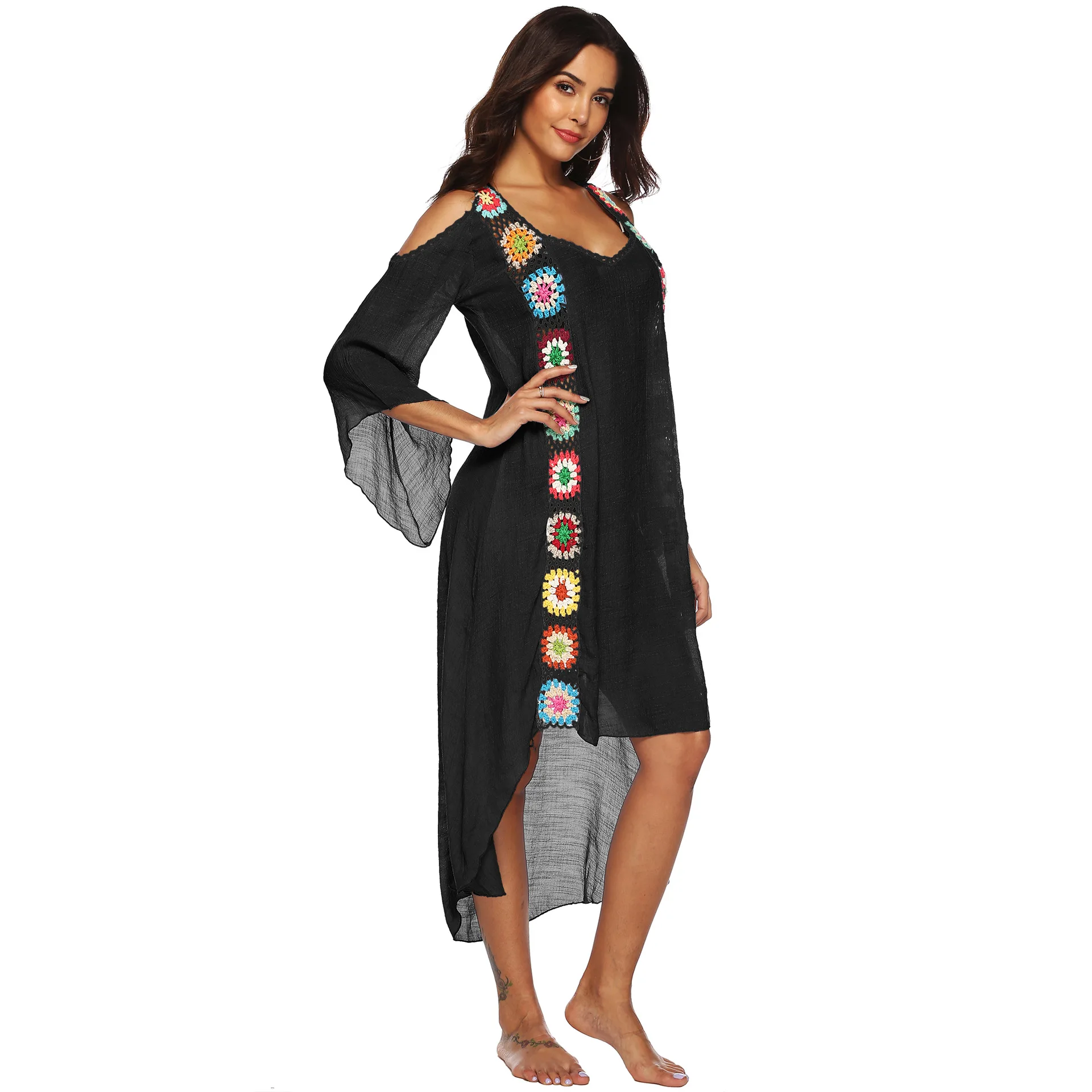 2021 Summer Multicolor Hand Hook Features Splice Shoulder Irregular Beach Smock Dress for Women