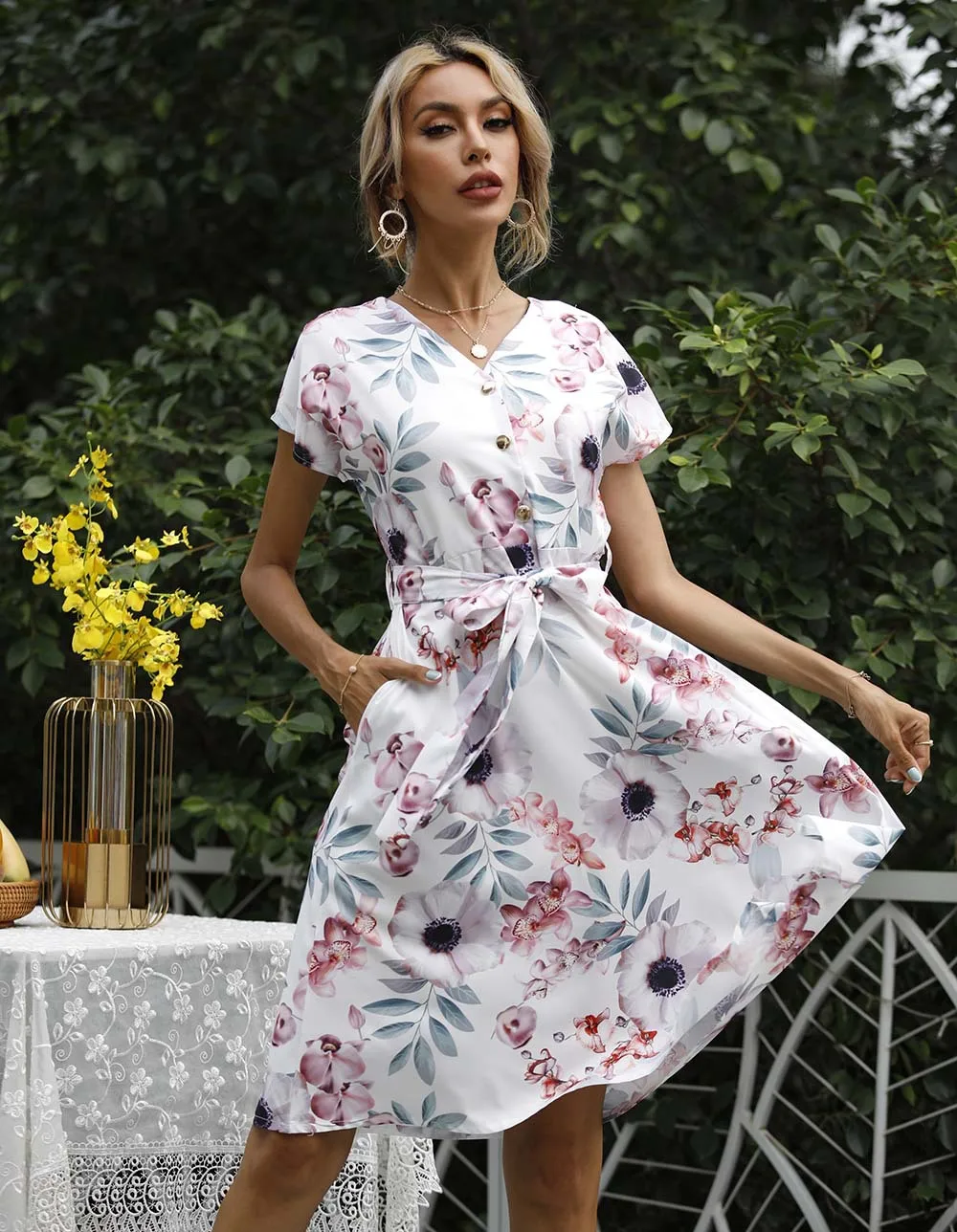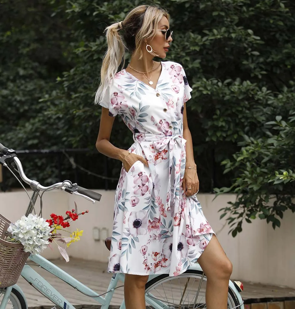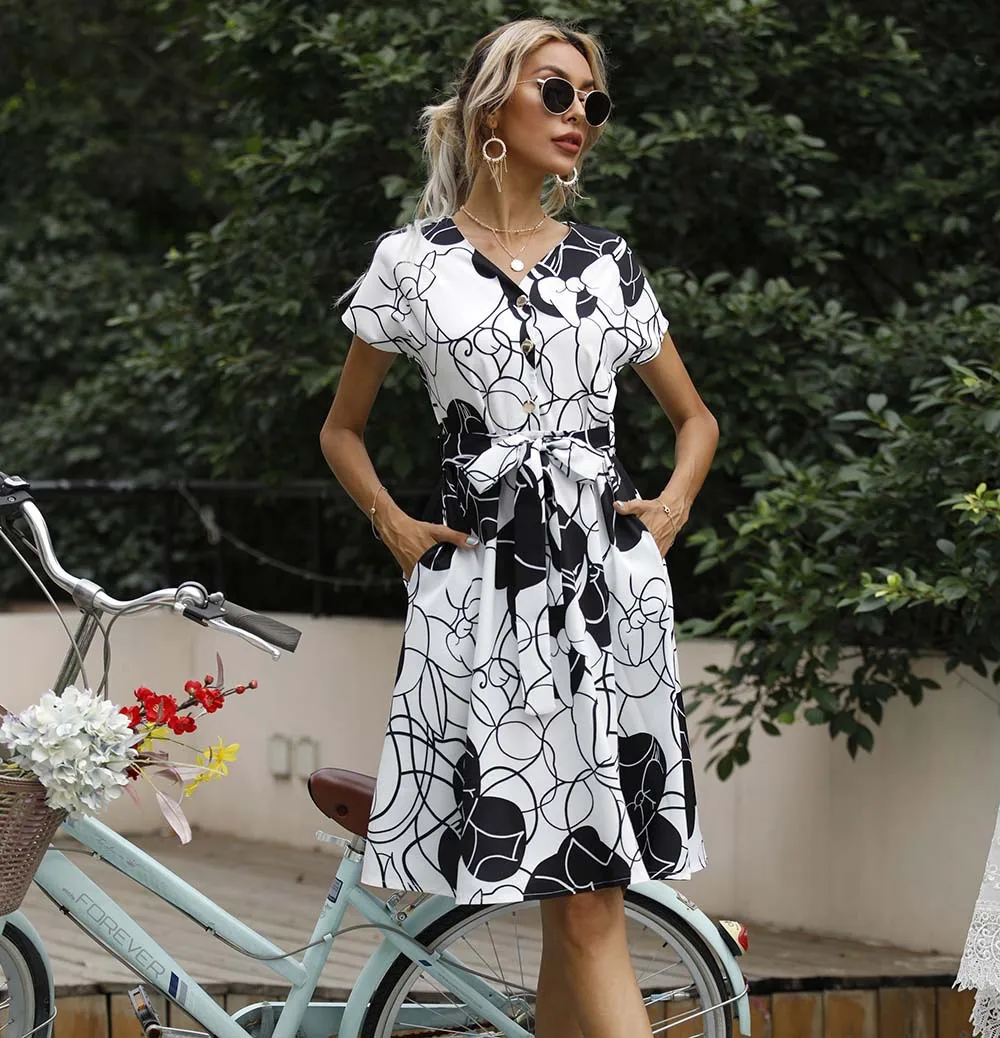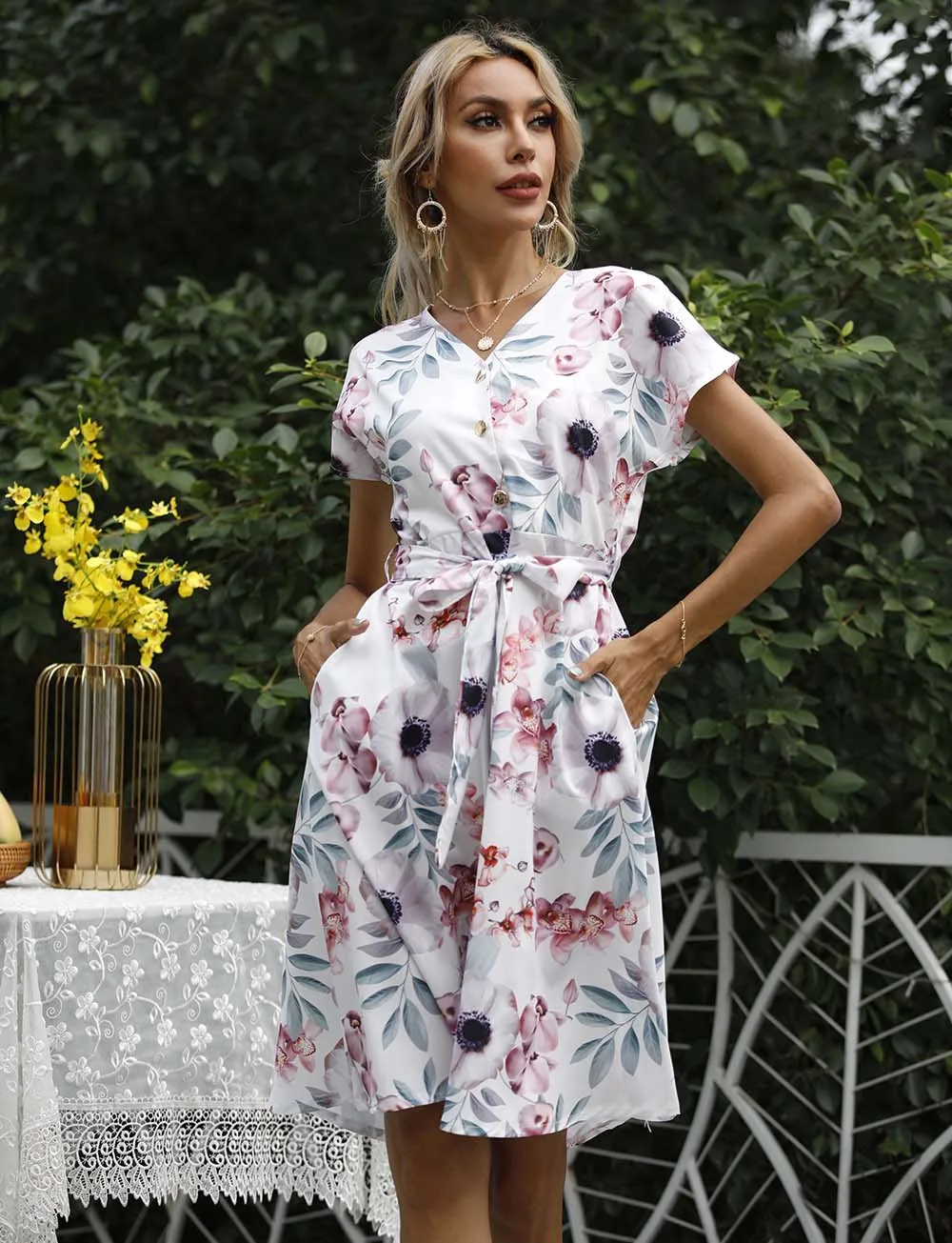 2021 Summer New Women's Fashion Sexy Print V Neck Short Sleeve Buttons Bandage Pockets Tunic Patchwork Ladies Knee Lenght Dress