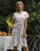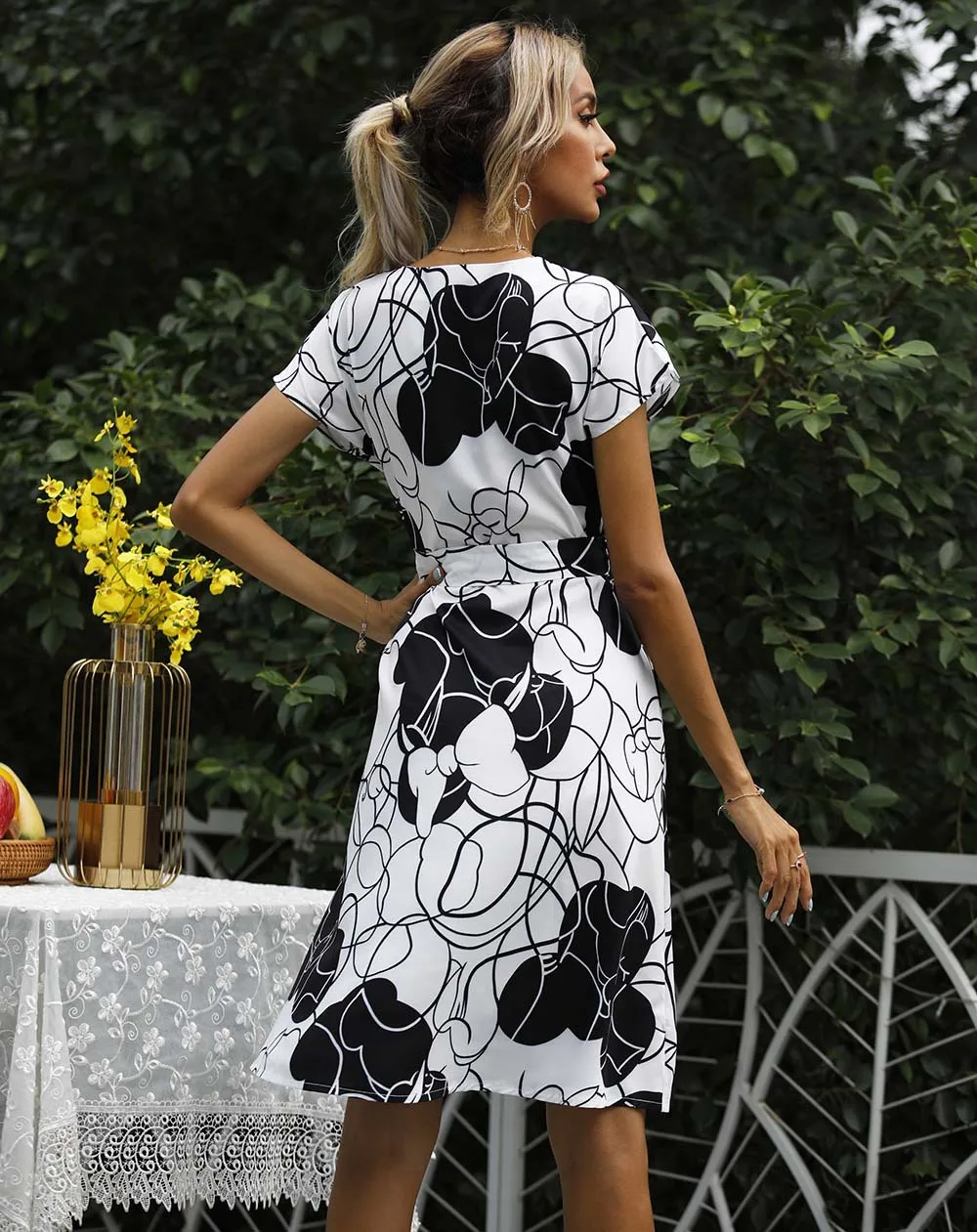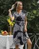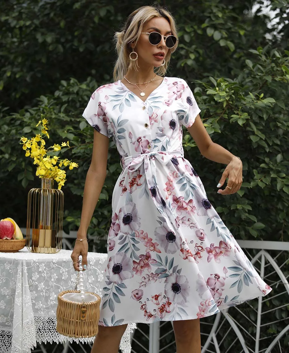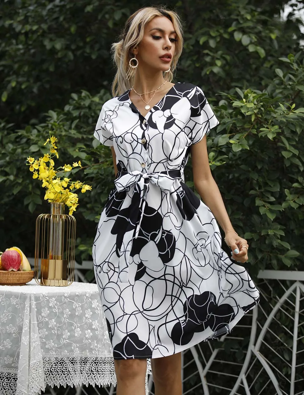 2021 Summer New Women's Fashion Sexy Print V Neck Short Sleeve Buttons Bandage Pockets Tunic Patchwork Ladies Knee Lenght Dress