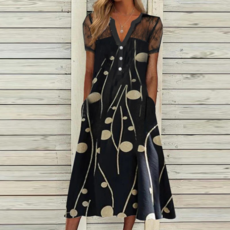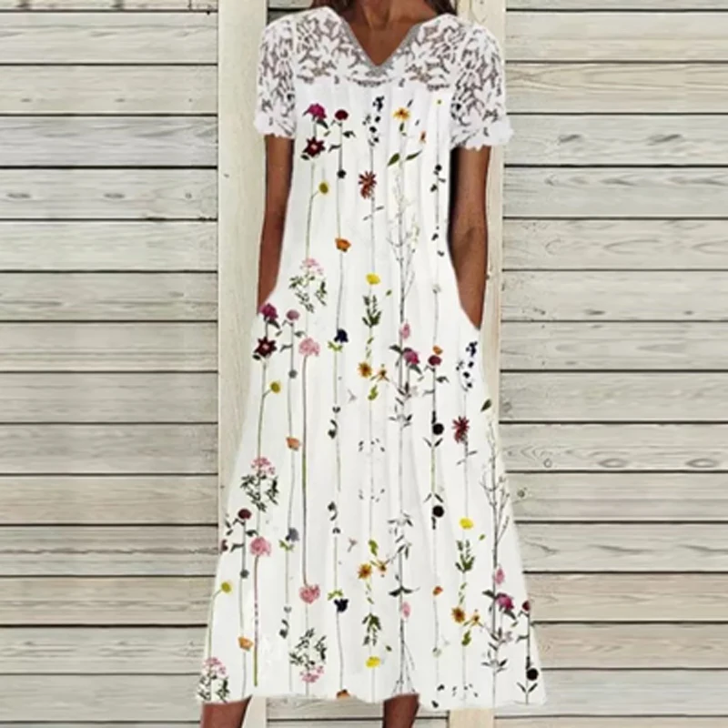 2021 Summer Short Sleeve Elegant Dress Fashion V Neck Floral Printed Ladies Long Dress Vintage Casual Loose Beach Dress Vestido