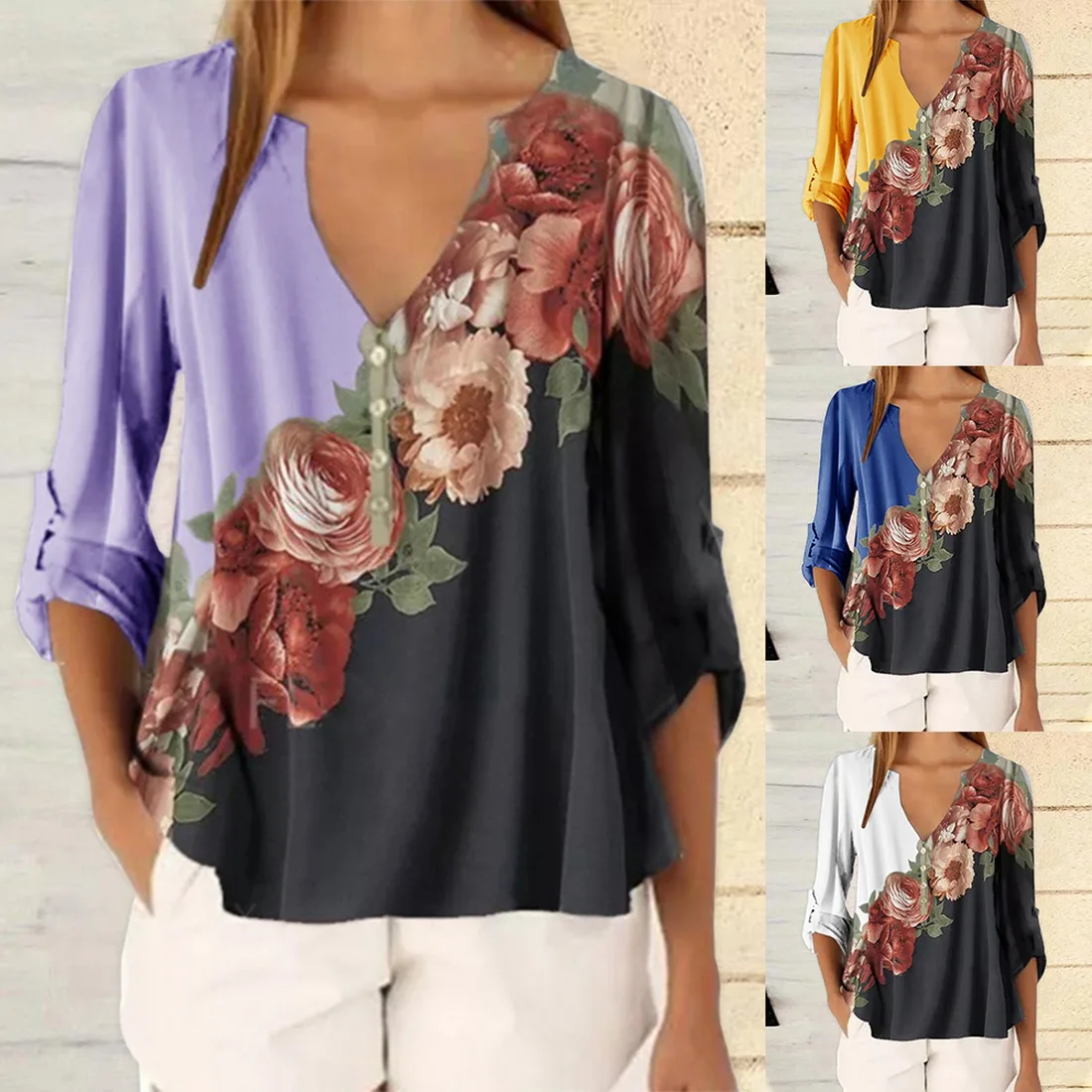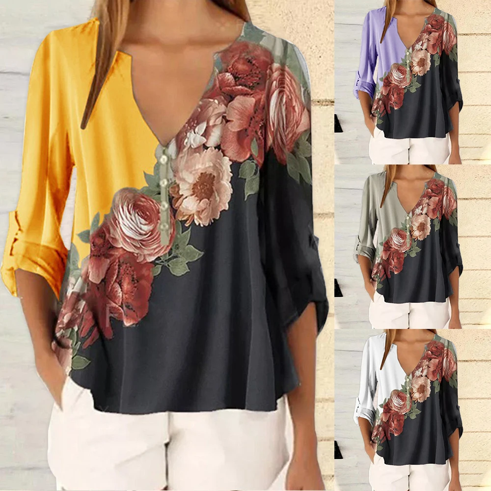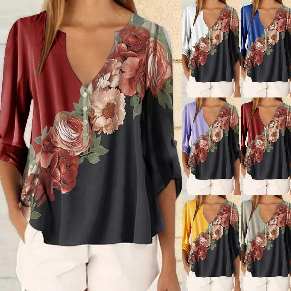 2021 Summer V-Neck Half Sleeve Office Work Shirts Floral Print Women T-Shirt Plus Size 5XL Beach Shirt Blusas Feminina Tops