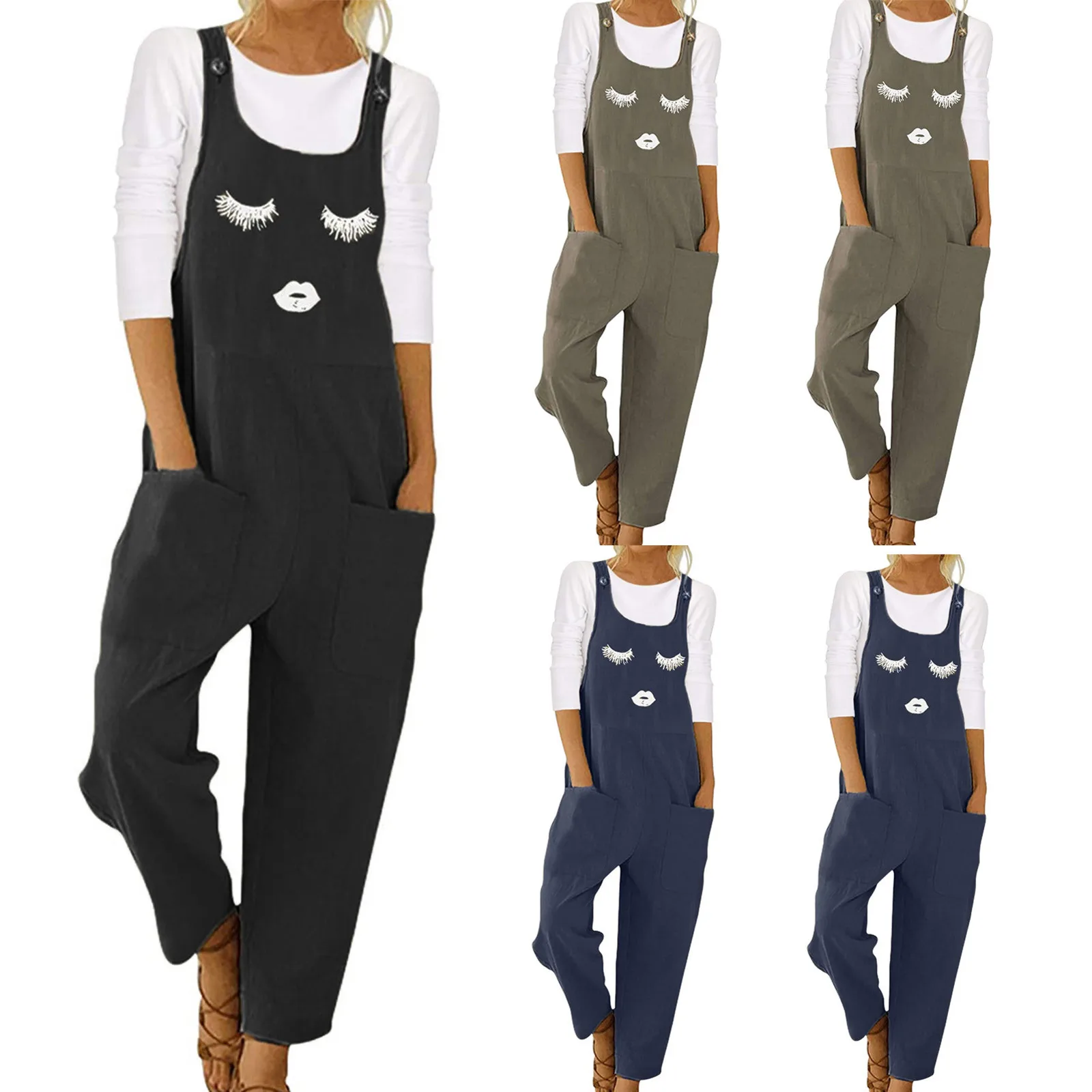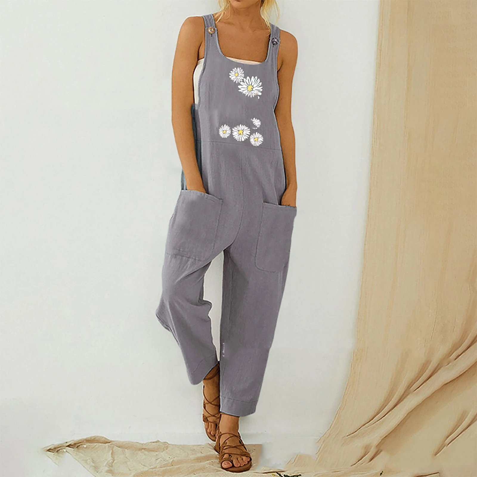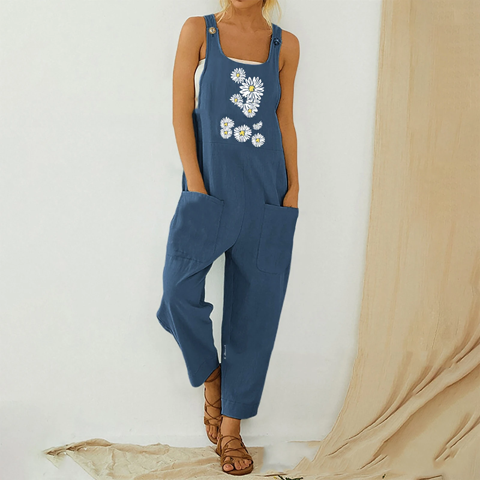 2021 Women Sleeveless Jumpsuits Summer Casual Pocket Overalls Wide Leg Pants Printed Playsuits Fashion Vintage Loose Rompers
