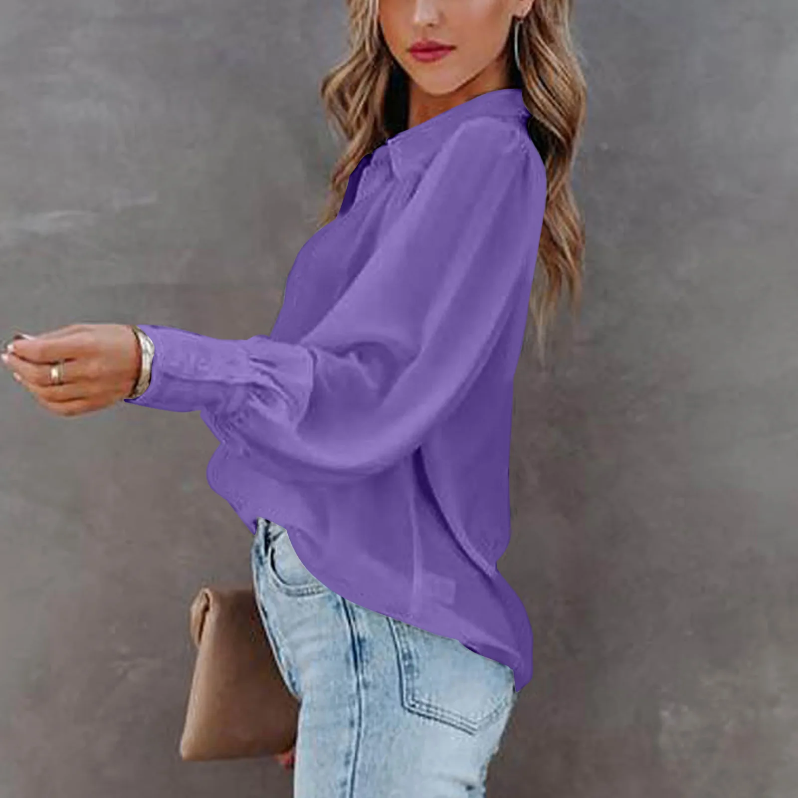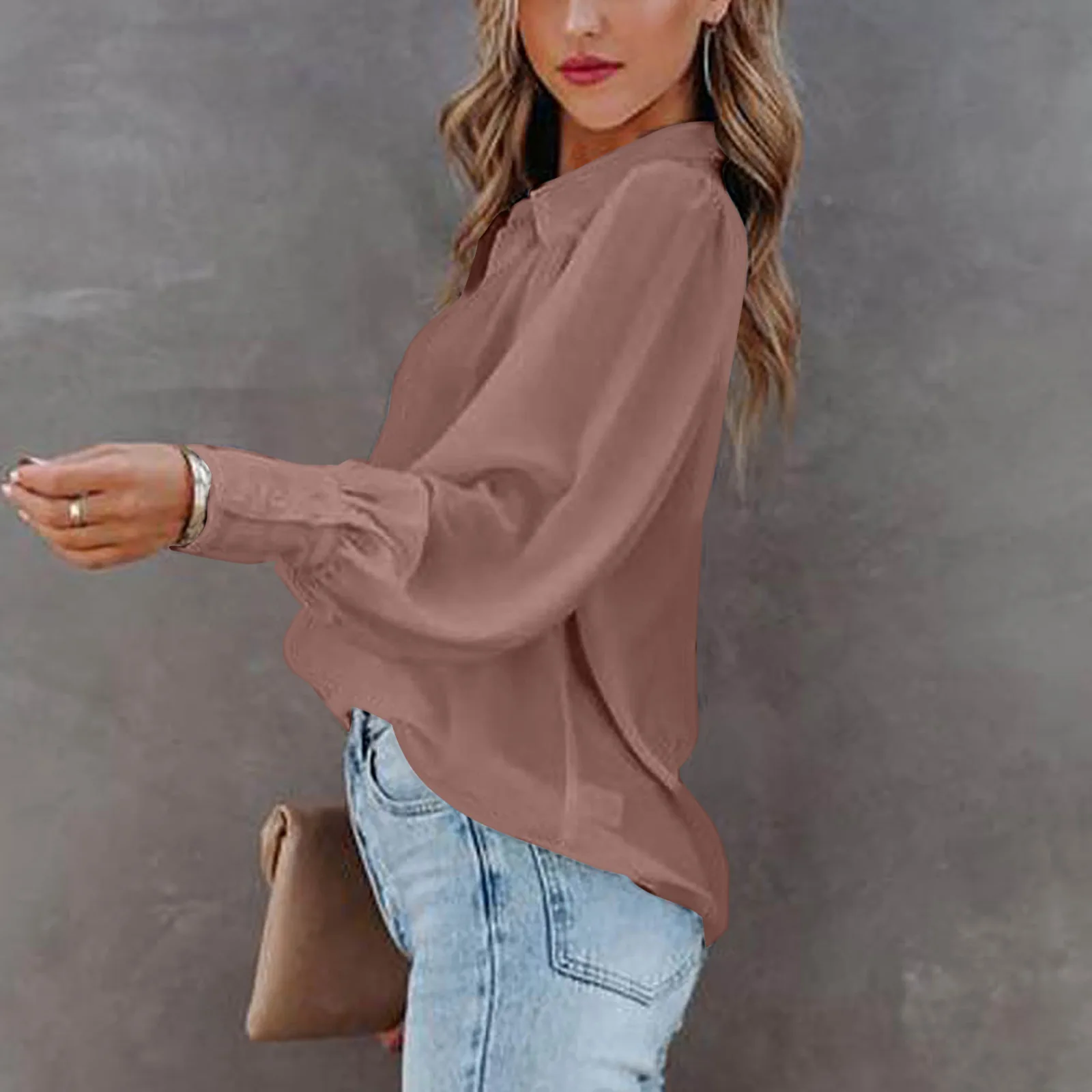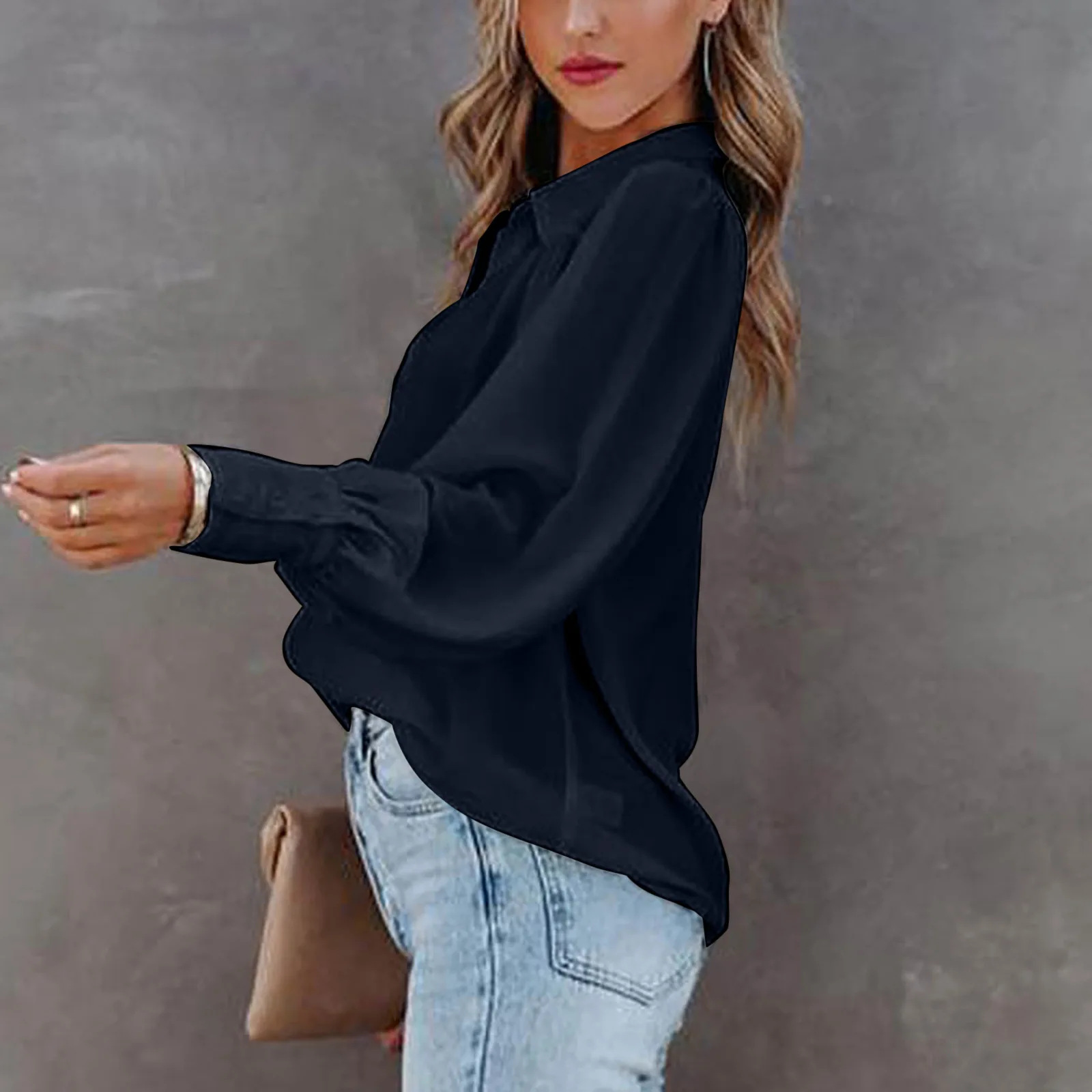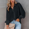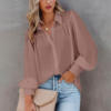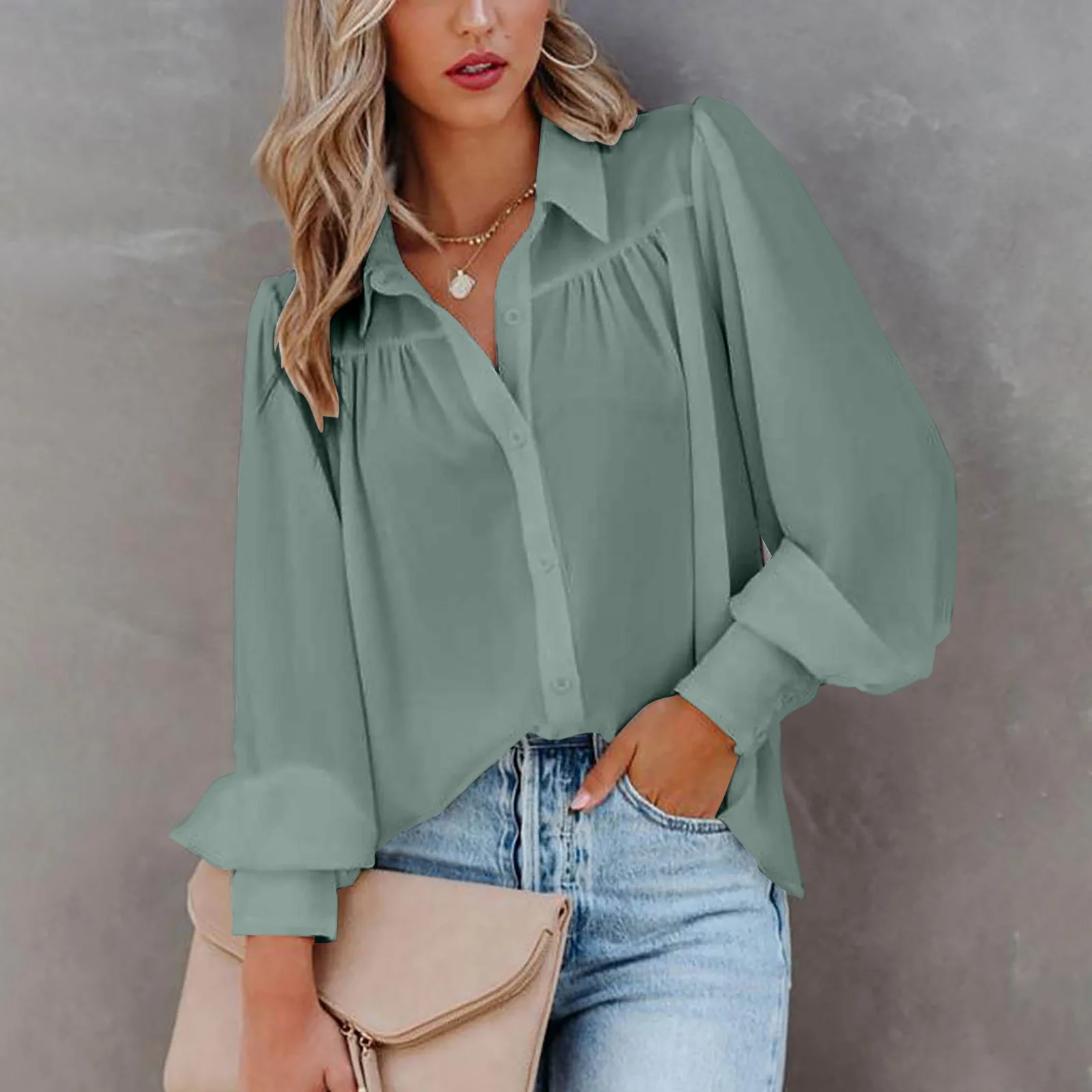 2022 Autumn Long-sleeved Button-up Top Lantern Sleeve Pleated Solid Color Stand Collar Loose Shirt Women's Clothing Femme Blusas