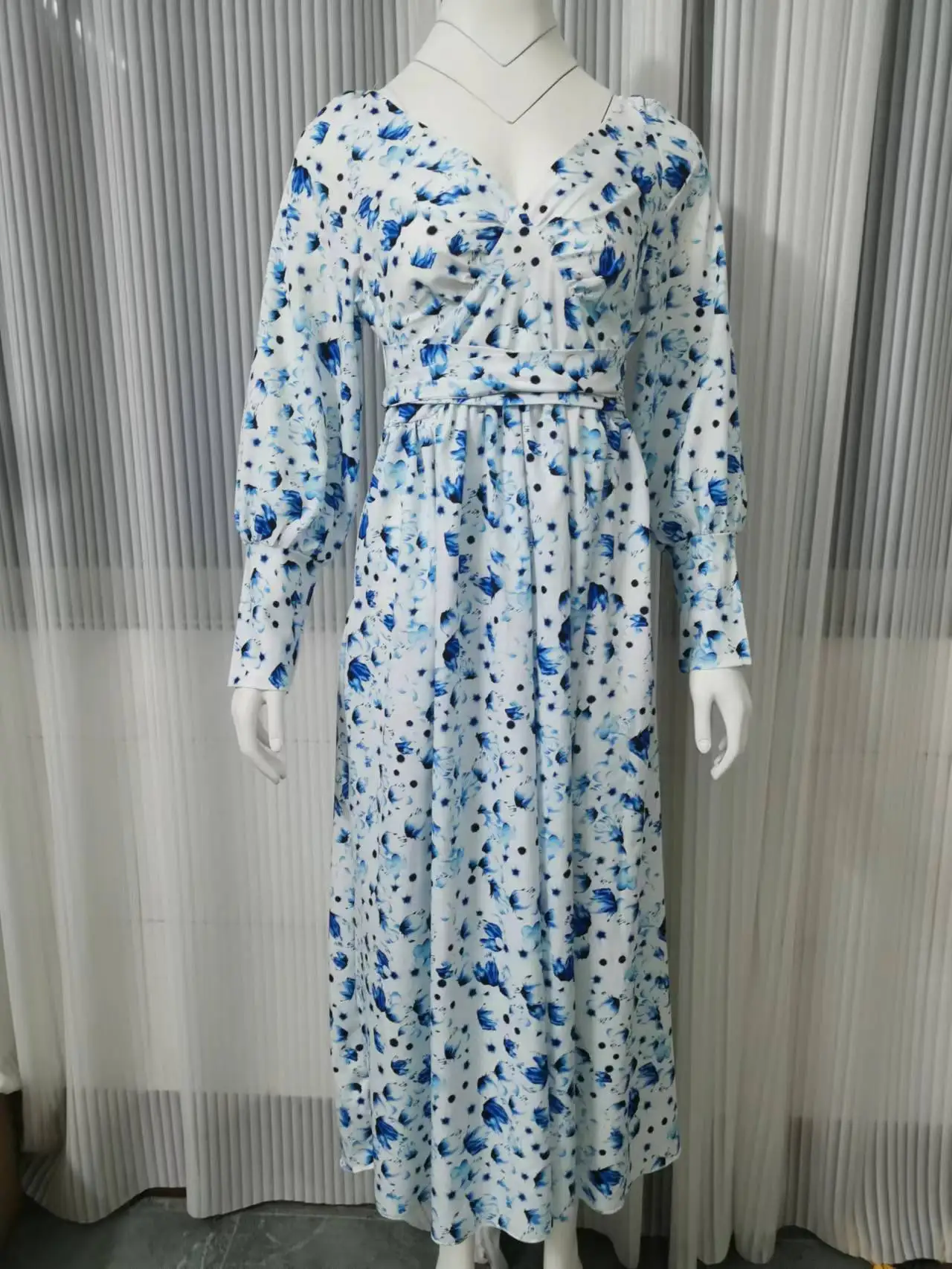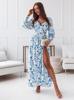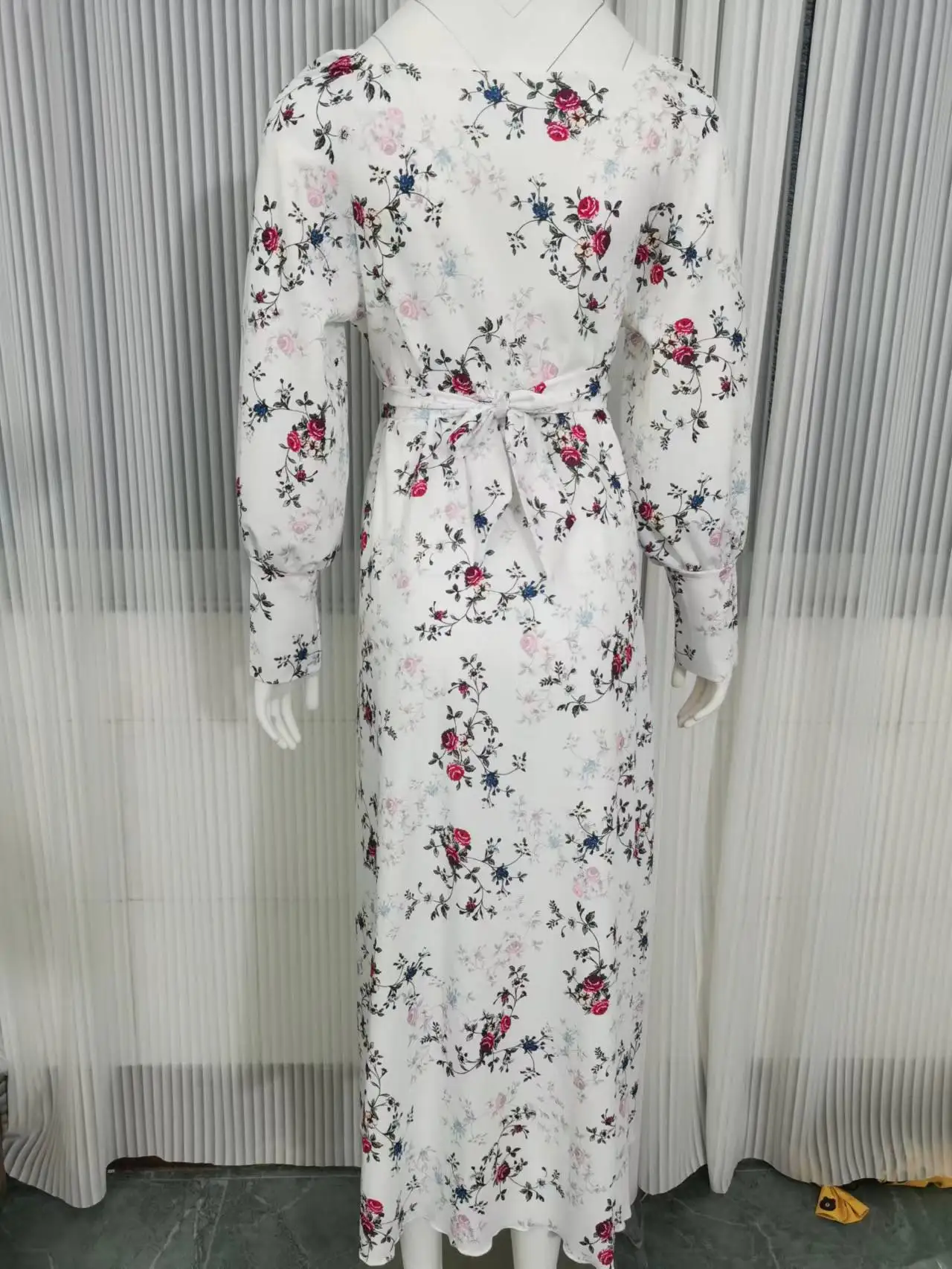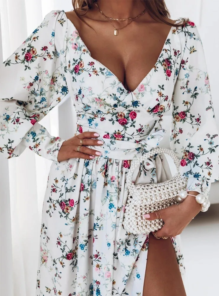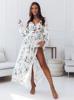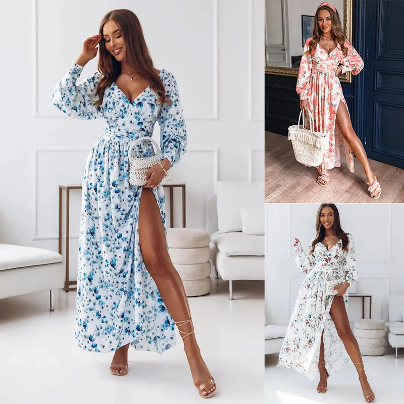 2022 Autumn New Sexy Deep V Neck Slit Long-sleeved Dress Women Fashion Floral Print High Waist Lantern Sleeve Maxi Dress Femme