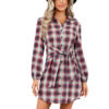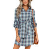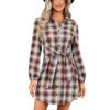 Women’s Long Sleeve Dress, Plaid Pattern Turn-Down Collar Waist Tie-Up Button-Down Dress