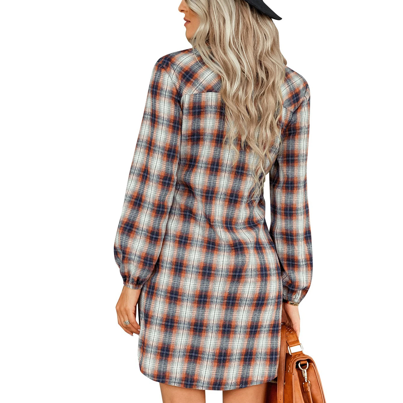 2022 Autumn Women's Long Sleeve Dress Ladies Casual Plaid Pattern Turn Down Collar Waist Tie Up Button Down Dresses