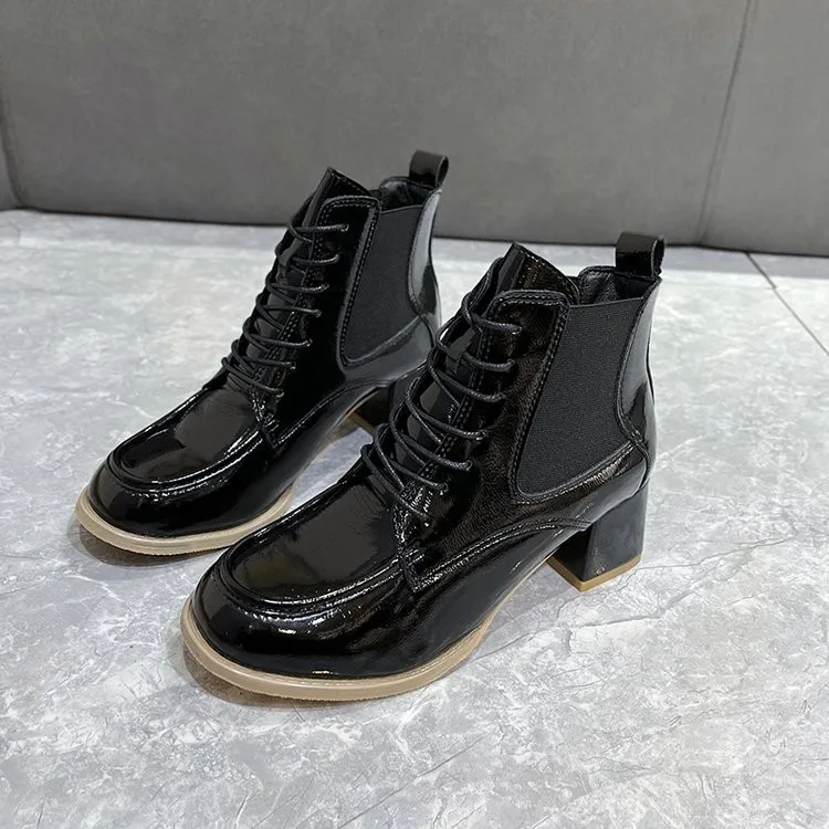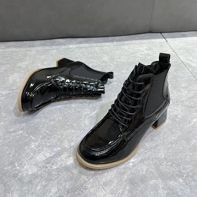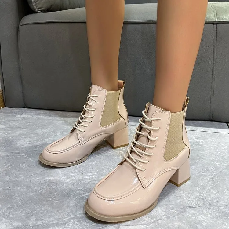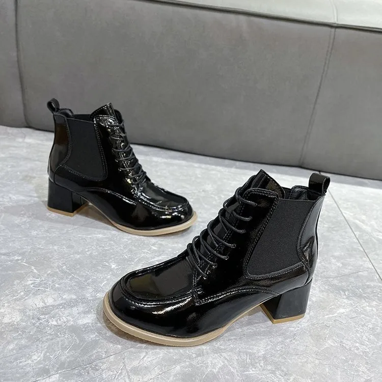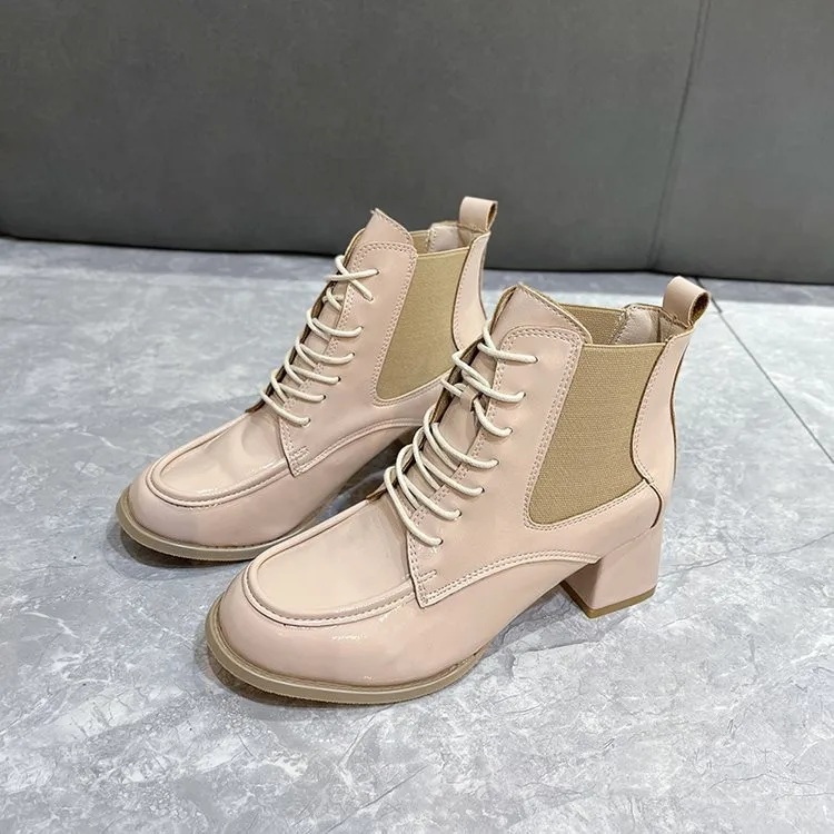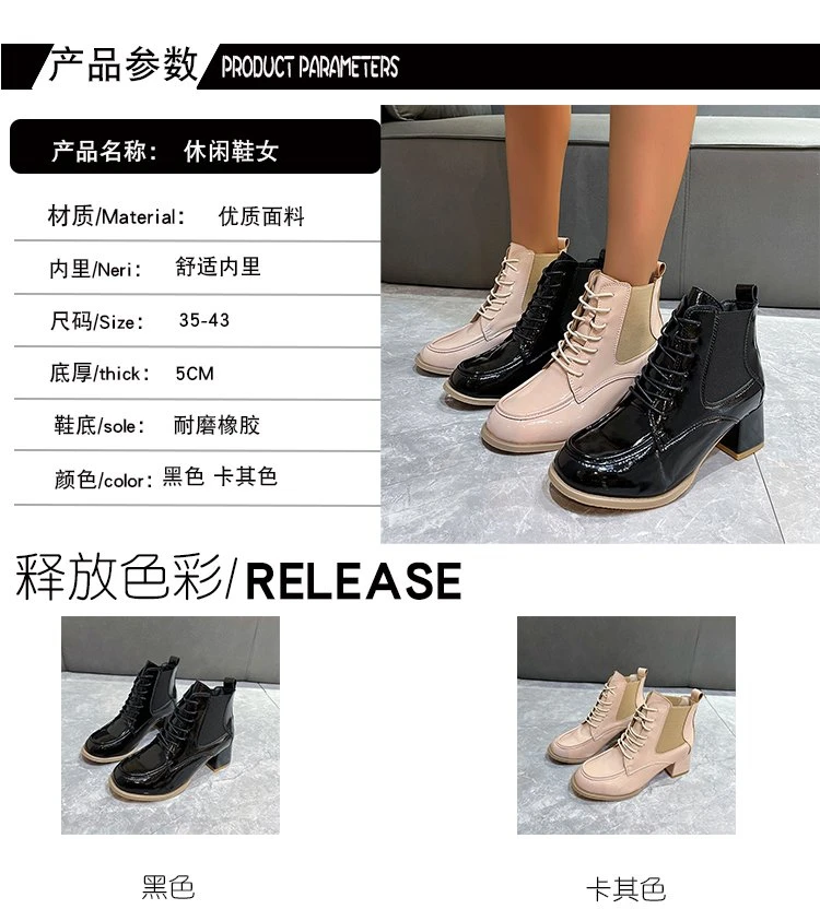 2022 British Style Women Casual Boots,Autumn Shoes,Ankle Botas,Front Lace-up,Square Toe,Black,Brown,Dropship