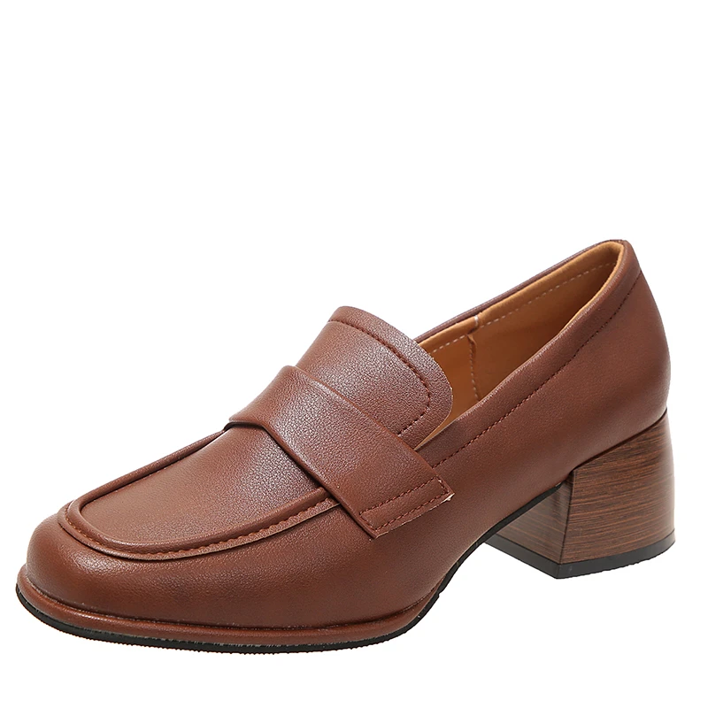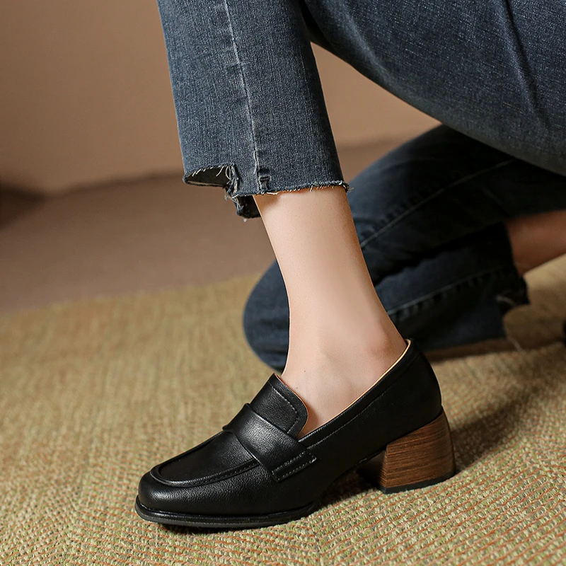 2022 Fall Shoes Genuine Leather Woman Shoes Square Toe Chunky Heel Shoes Slip-On Pumps Solid High Heels Classics Ladies Shoes