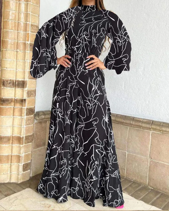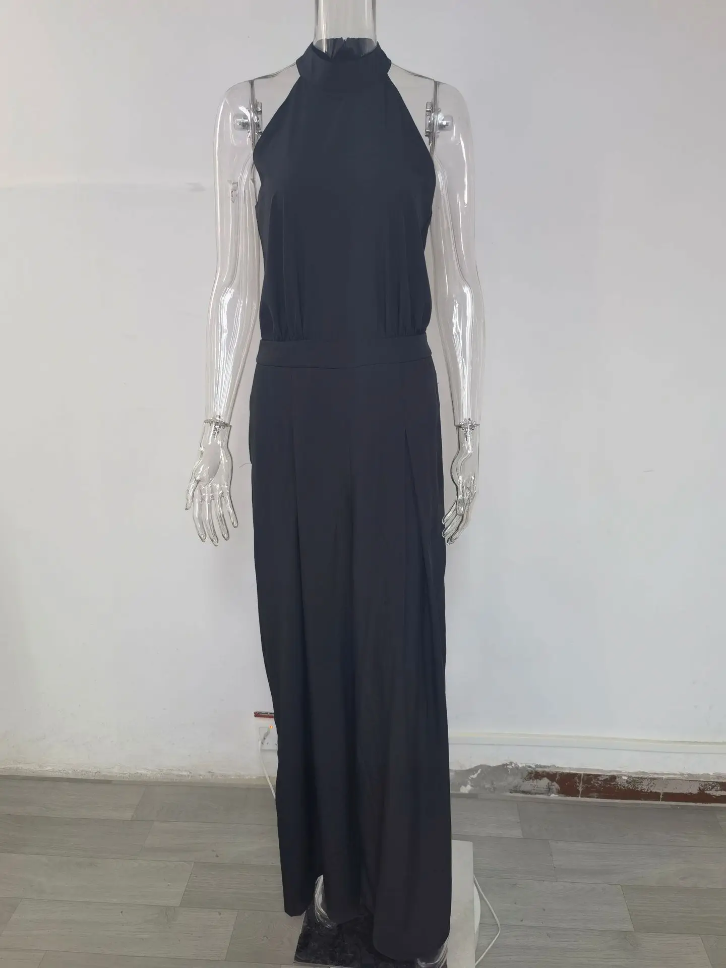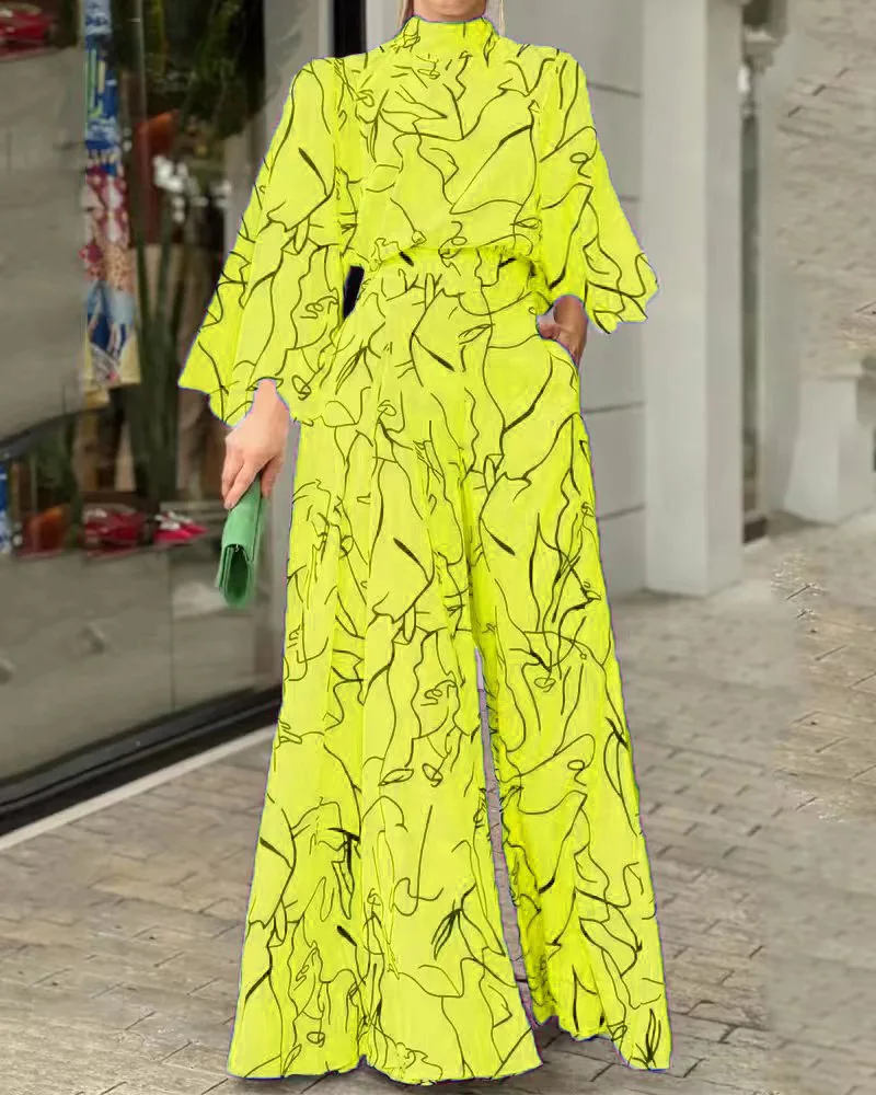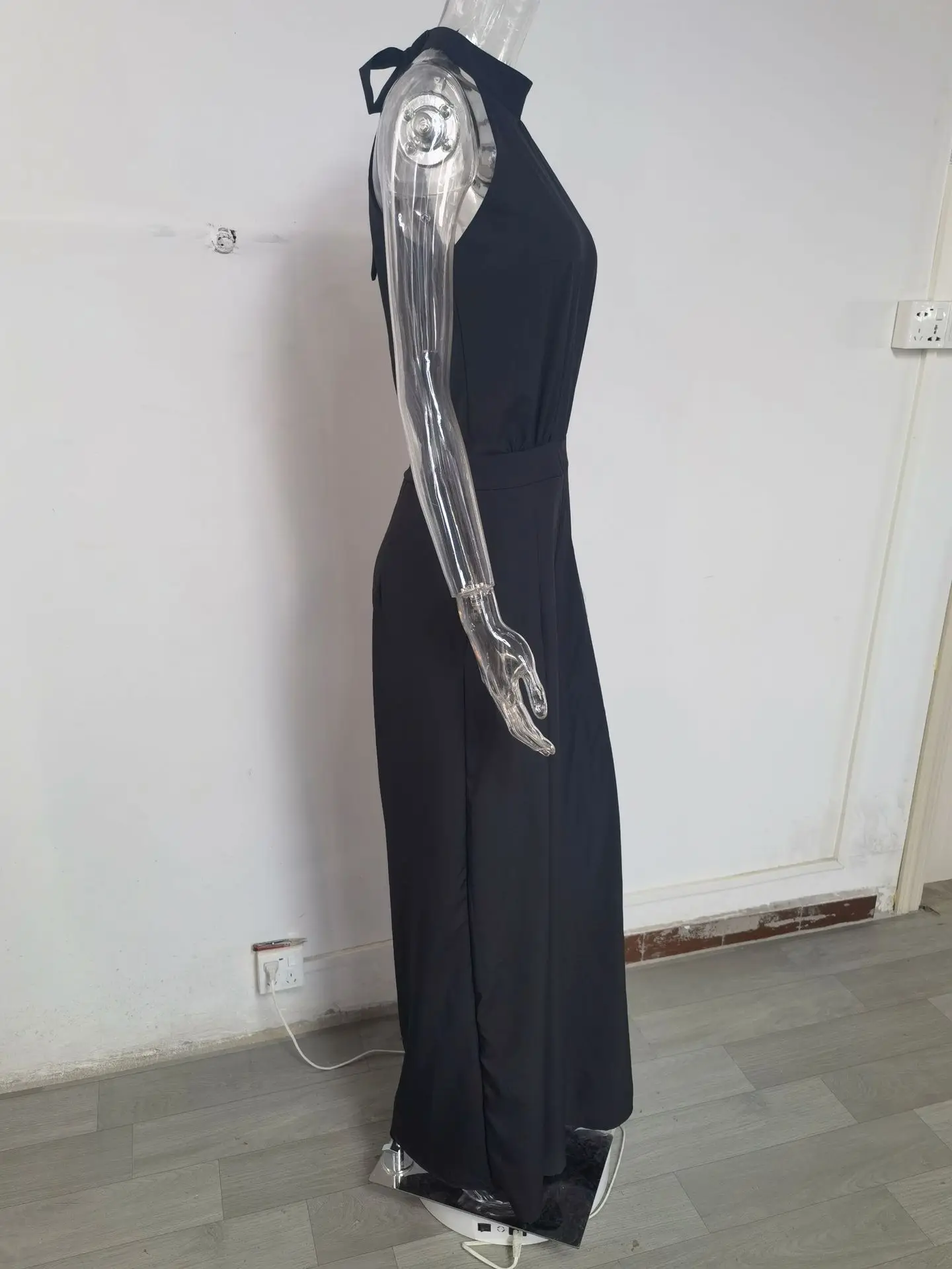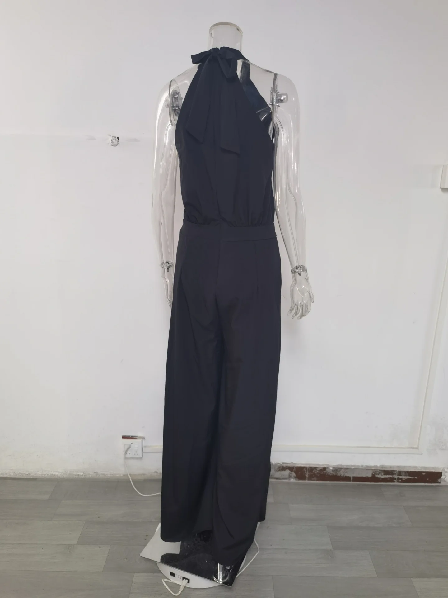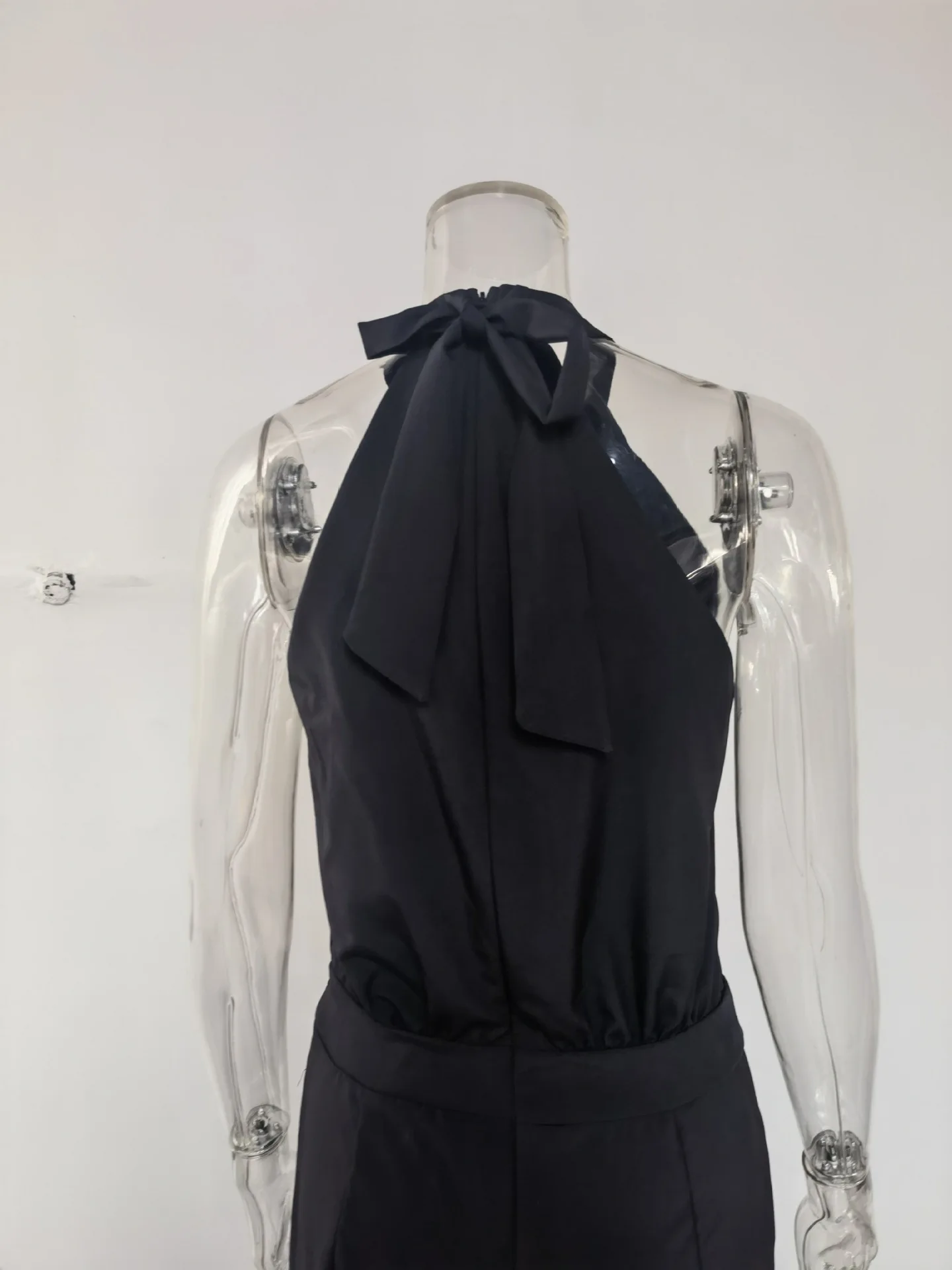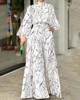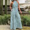 2022 Fall Women's Elegant Waist Tie Long Sleeve Halter Print Jumpsuit Fashion Pocket Stitching One Piece Pants Women Rompers