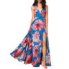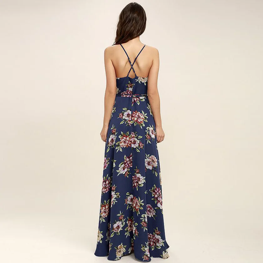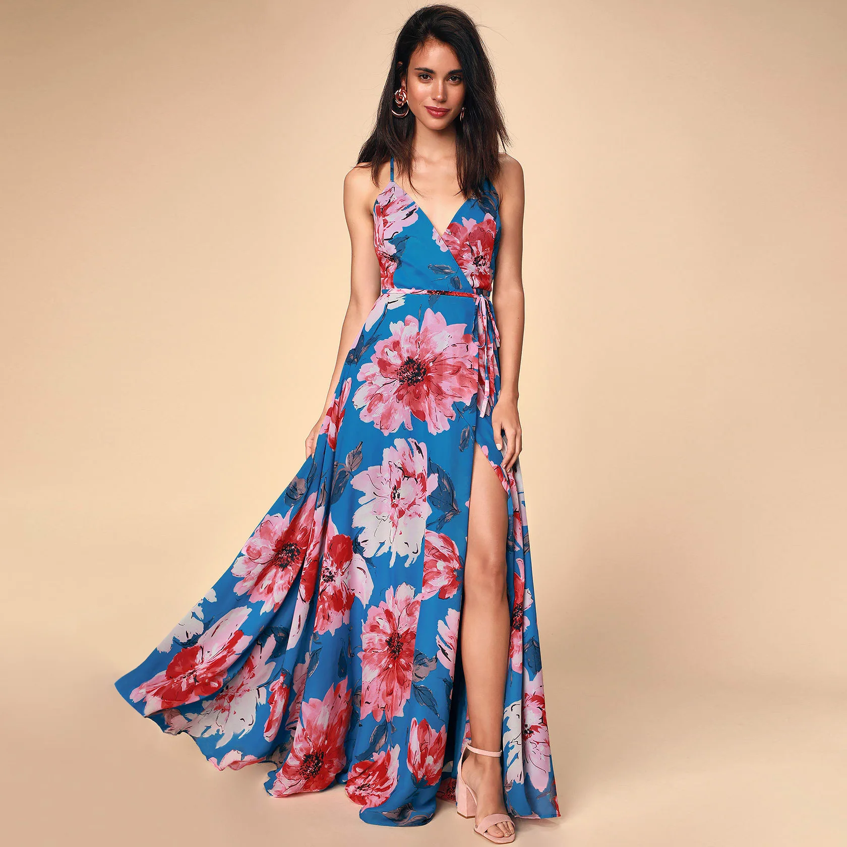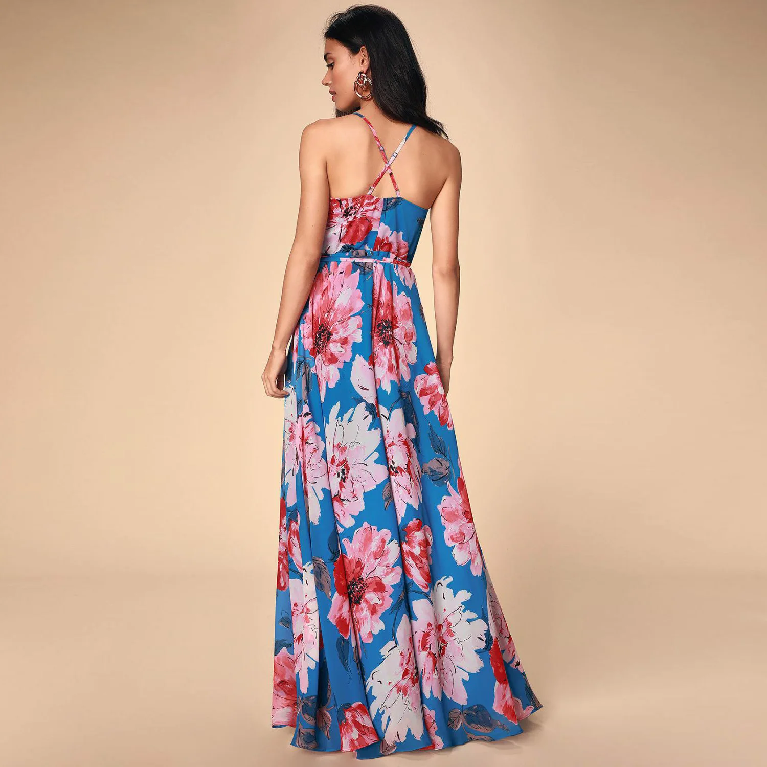 2022 Fashion Female Sleeveless Suspender Long Dress Women’s Casual Flower Print Tie-up Slit Large Swing Dress Bridesmaid Dresses