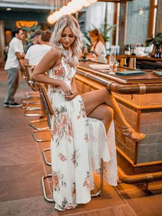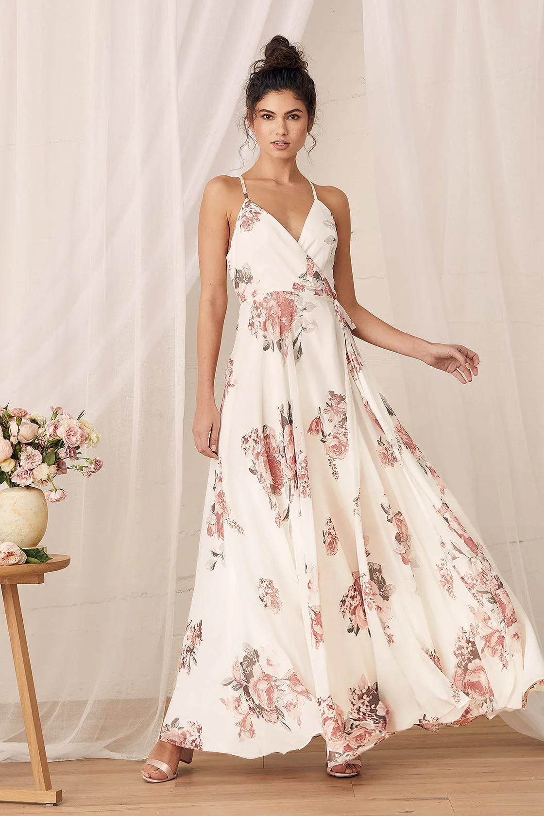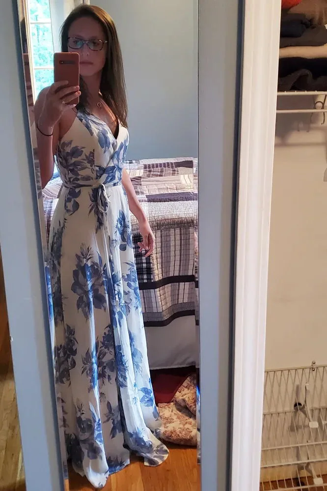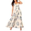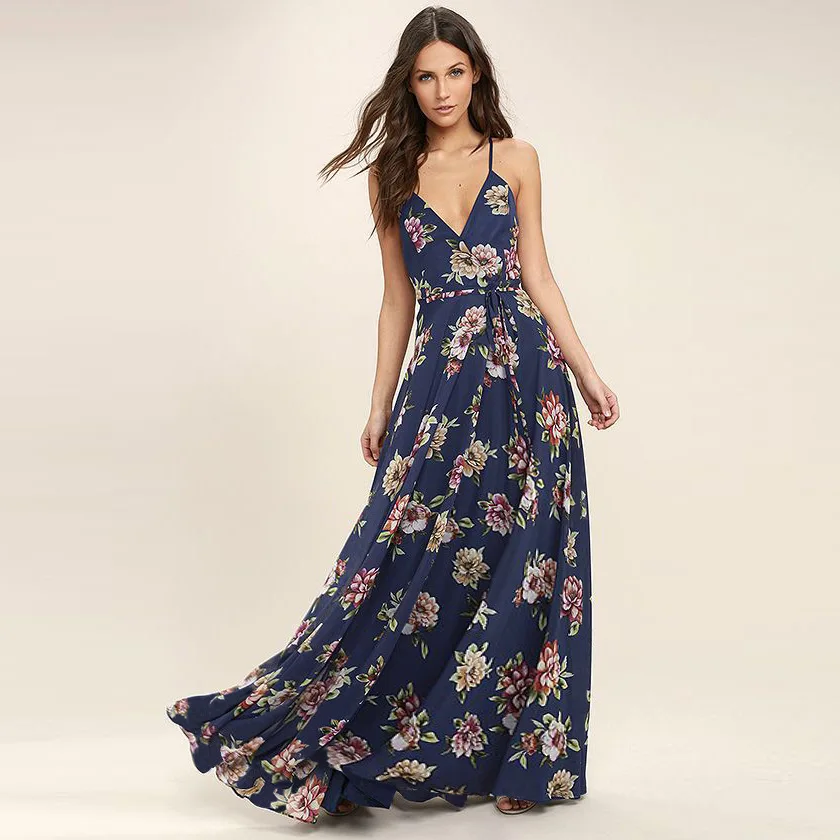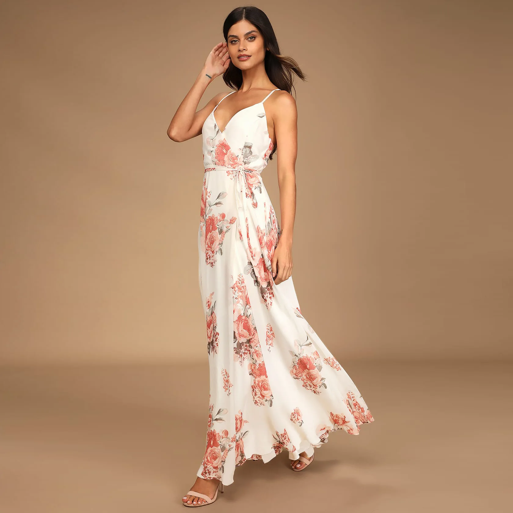 2022 Fashion Female Sleeveless Suspender Long Dress Women’s Casual Flower Print Tie-up Slit Large Swing Dress Bridesmaid Dresses