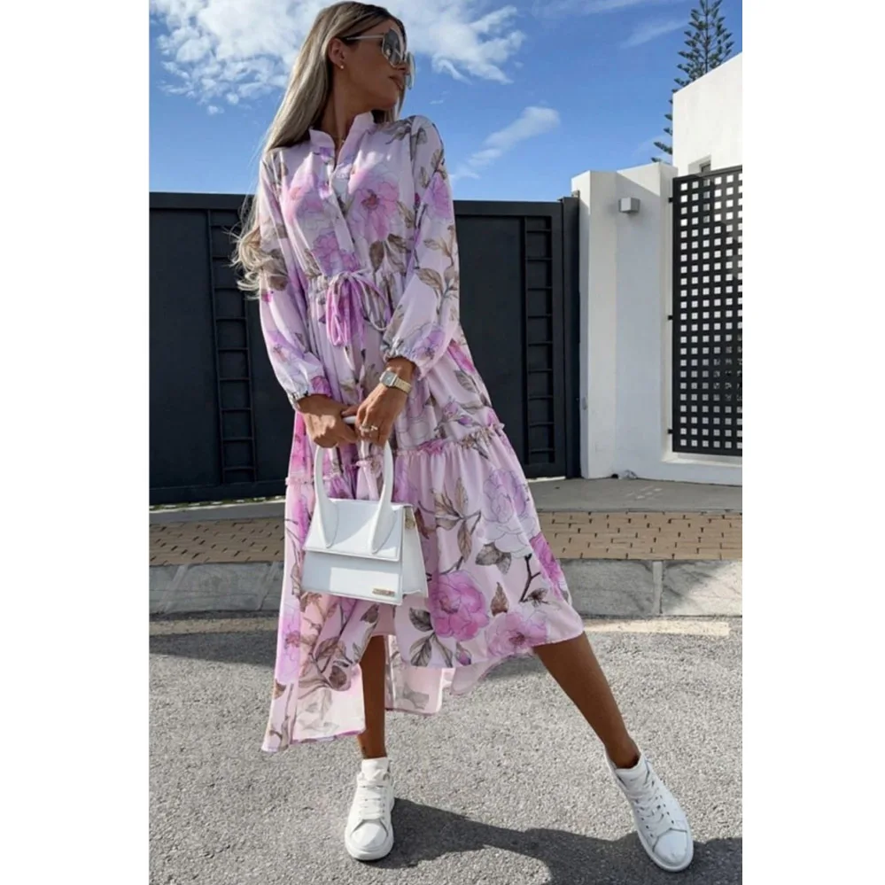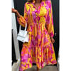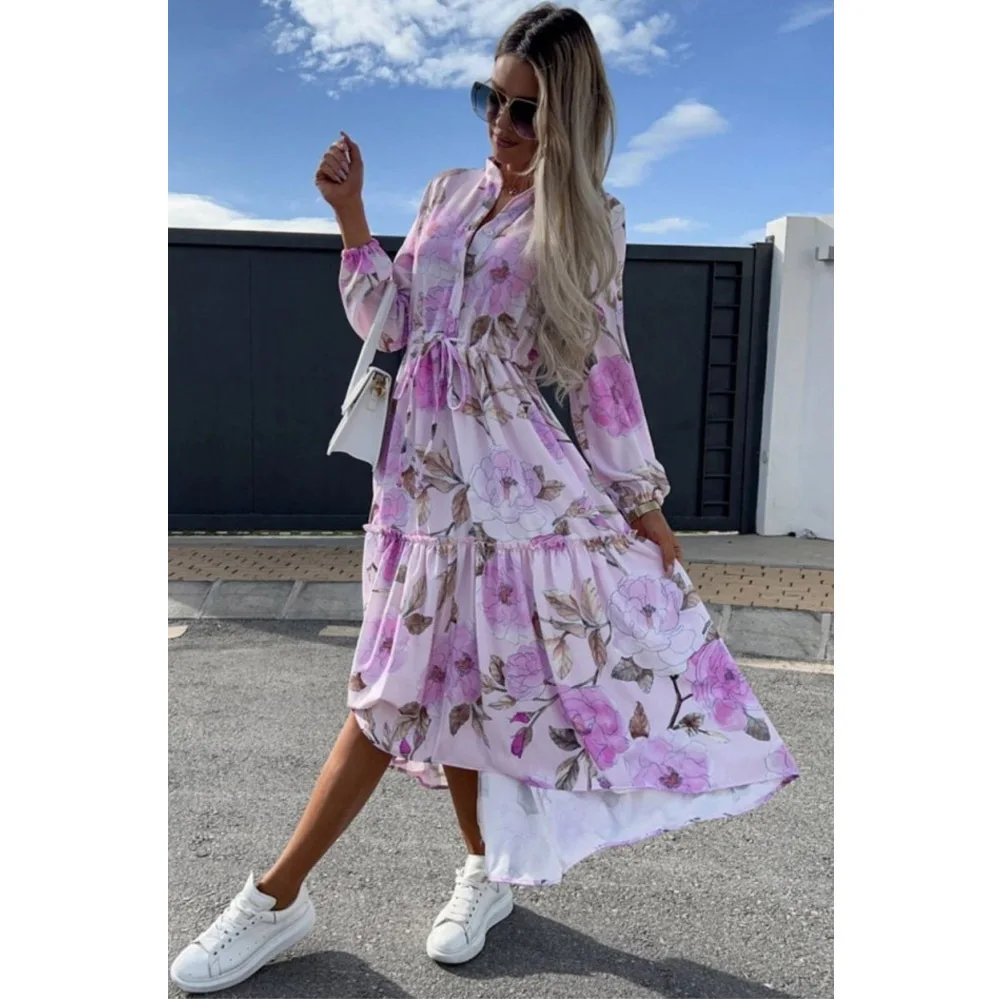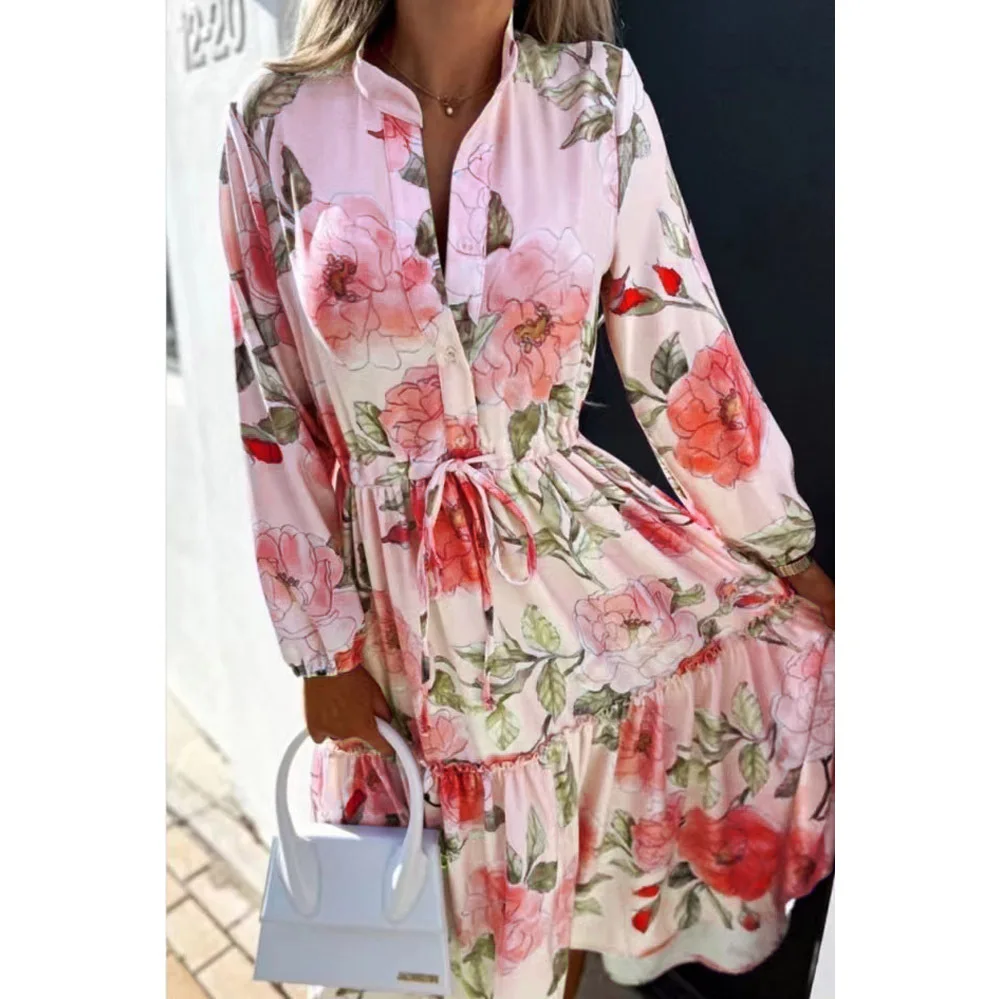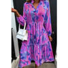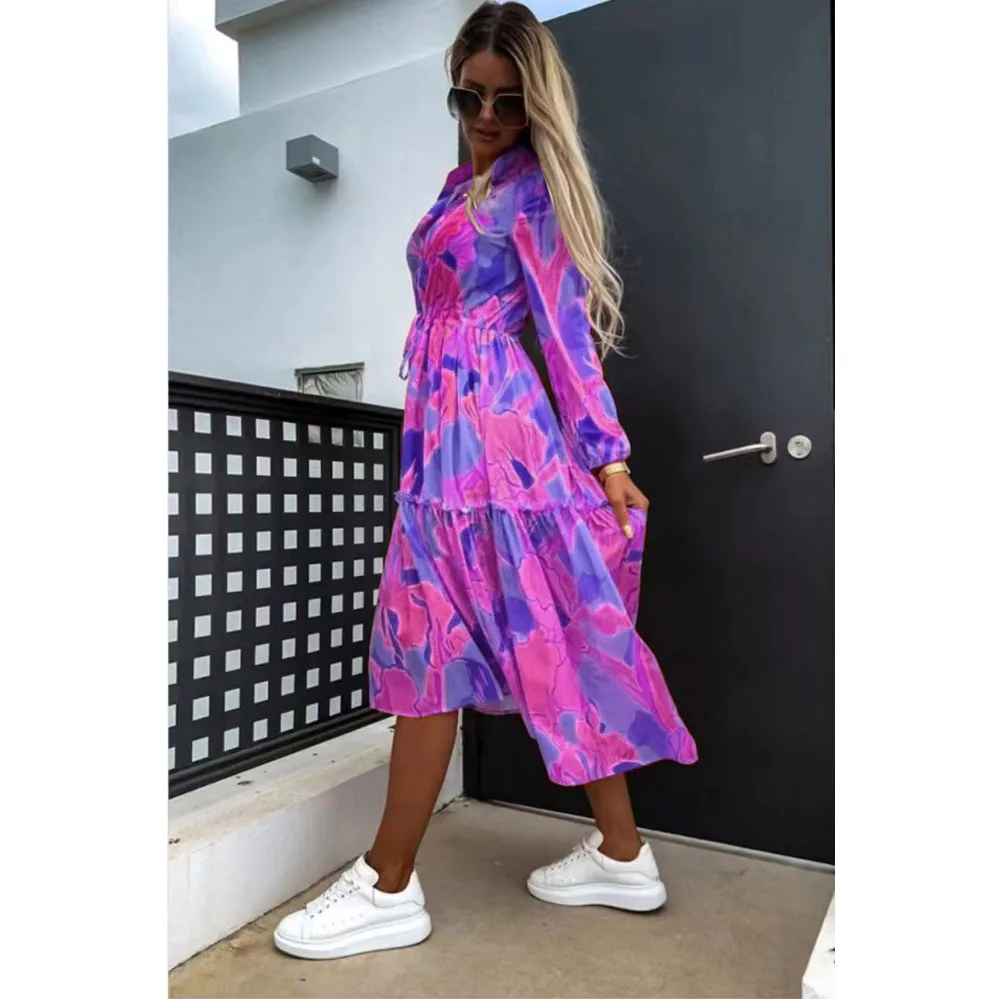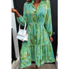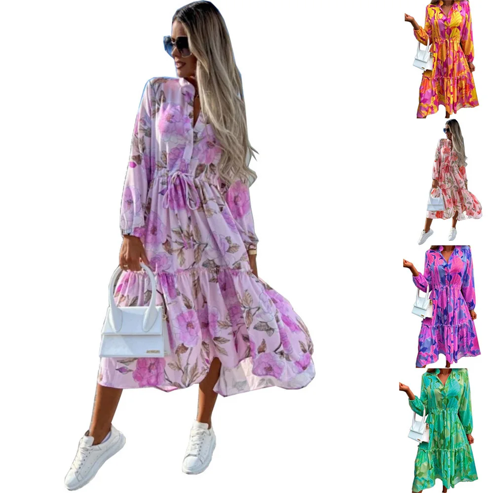 2022 Fashion Women's New Printed Loose Fashion Long Sleeve Dress Office Lady Turn Down Collar Ruffle Stitching Midi Dresses