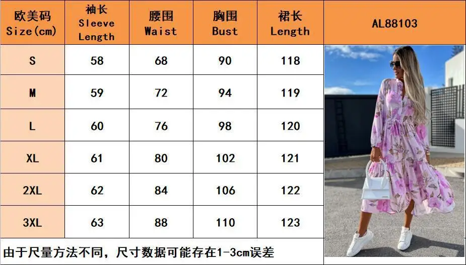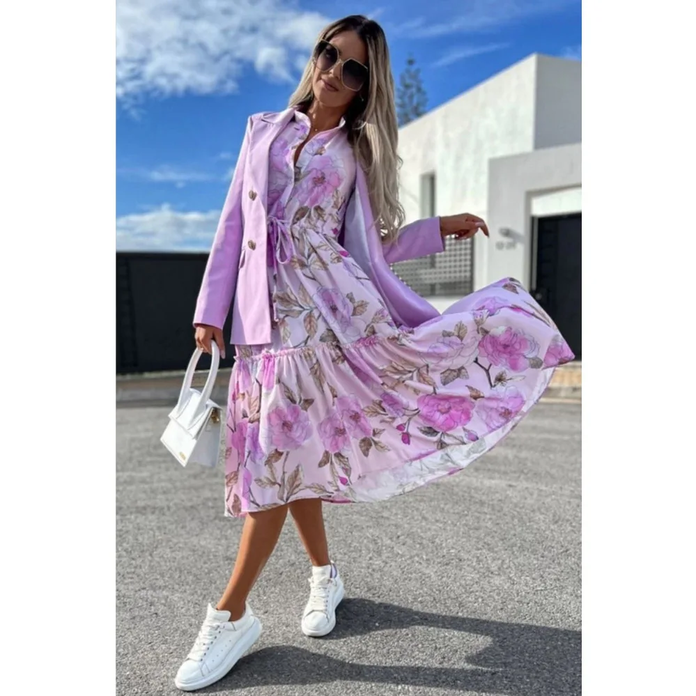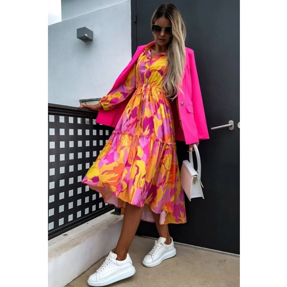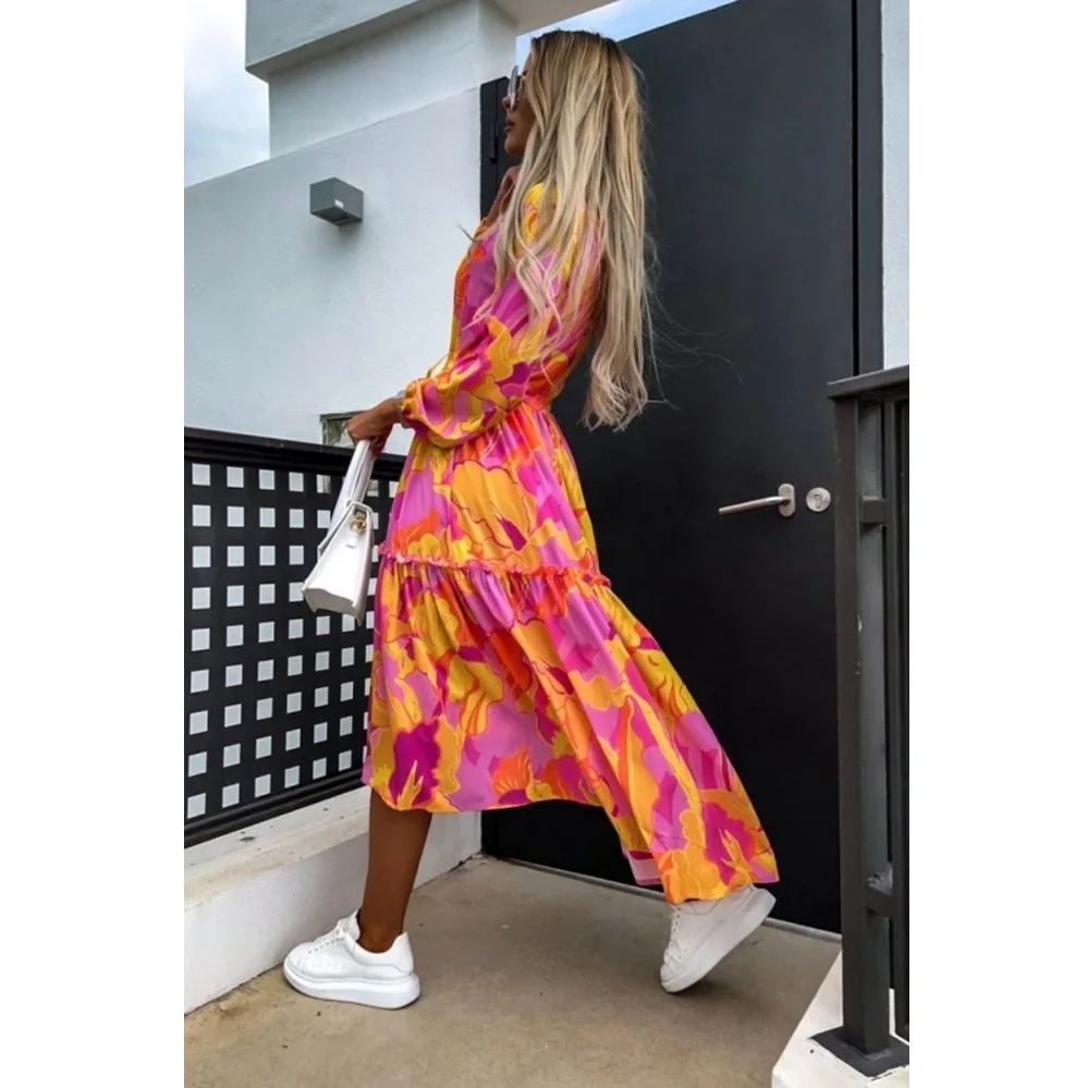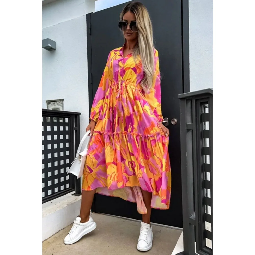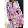 2022 Fashion Women's New Printed Loose Fashion Long Sleeve Dress Office Lady Turn Down Collar Ruffle Stitching Midi Dresses