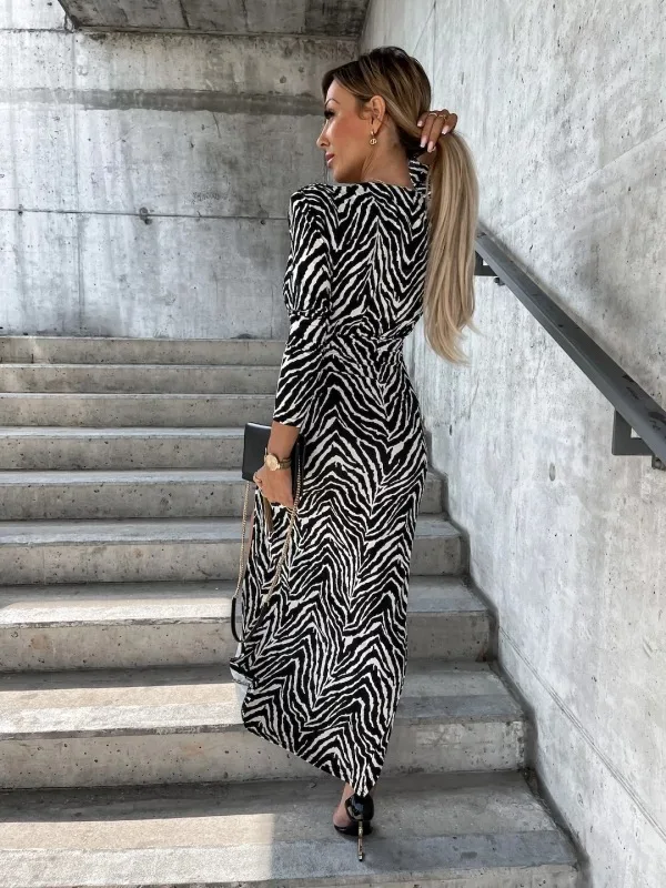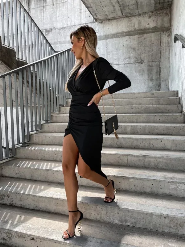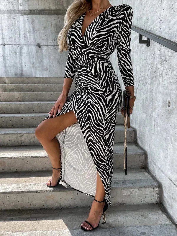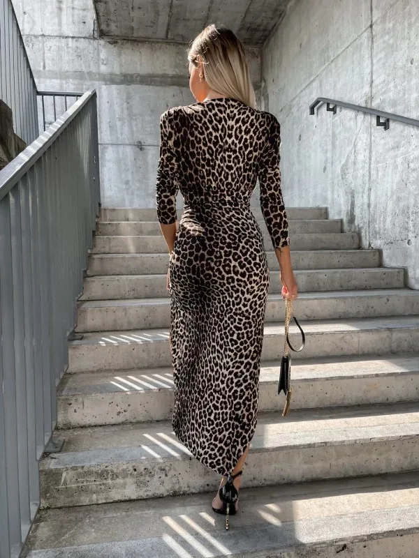 2022 Ladies Long Sleeve Leopard Print Slim Dress Women Sexy High Split Irregular Maxi Dresses Elegant Party Dress Vestido Negro