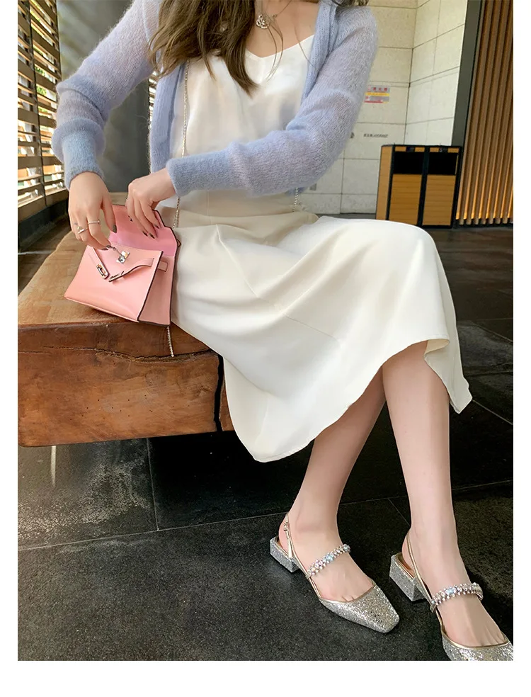 2022 Low Heel Square Toe Fashion Crystal Shoes Women Leather Pumps One-word Drill Belt Thick Heel Mary Jane Sandals Women Pumps