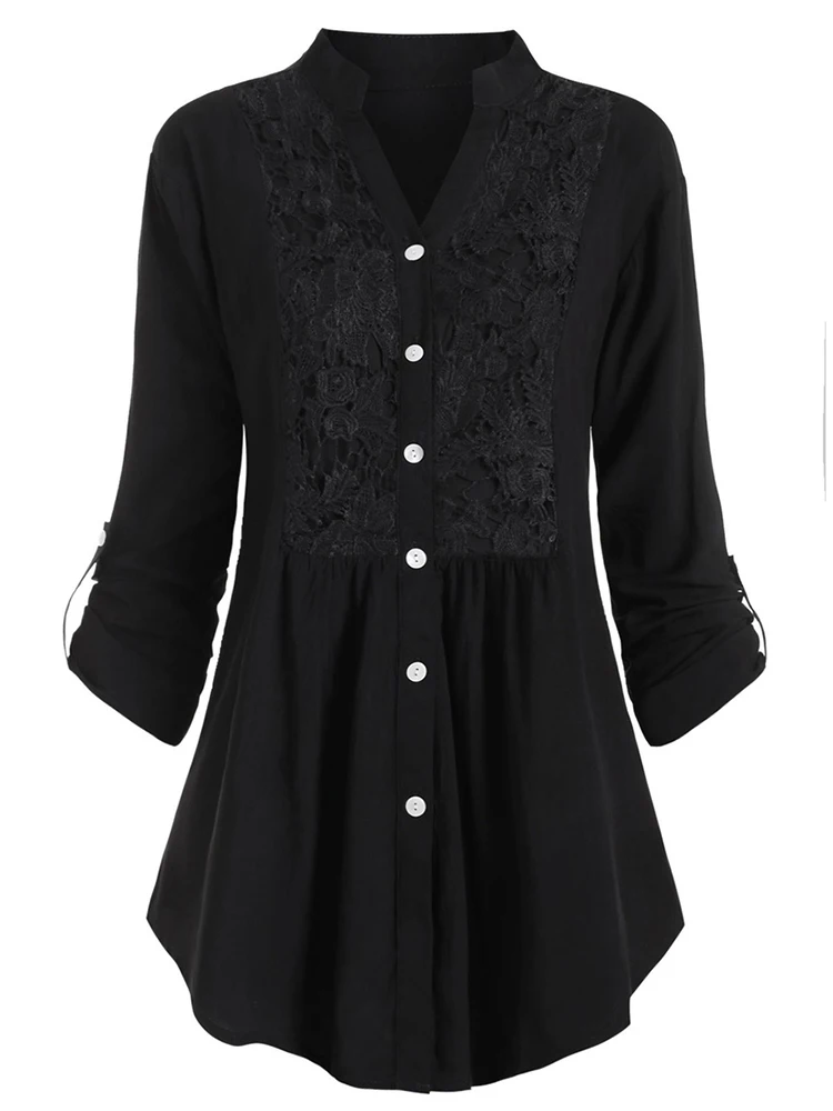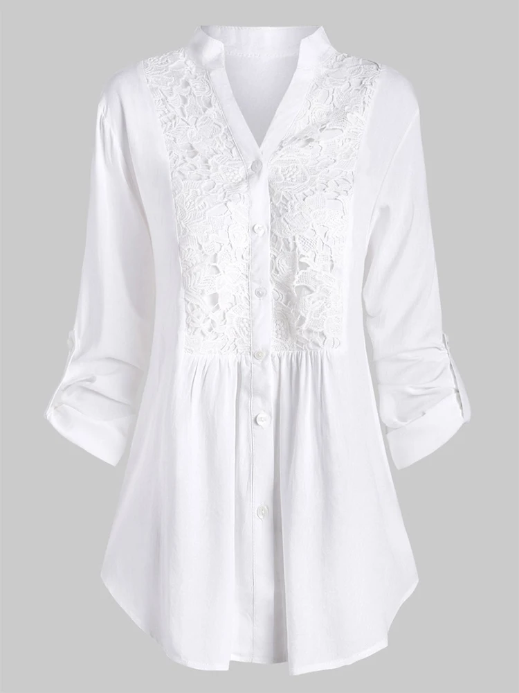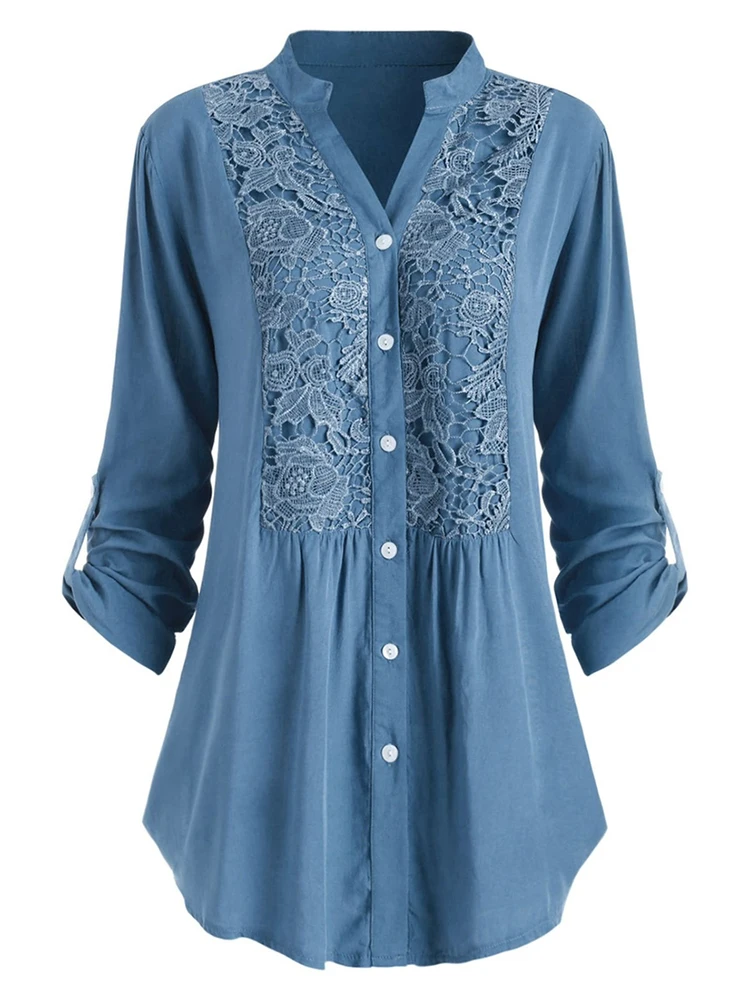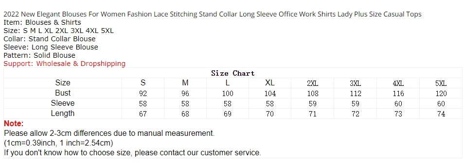2022 New Elegant Blouses For Women Fashion Lace Stitching Stand Collar Long Sleeve Office Work Shirts Lady Plus Size Casual Tops