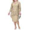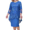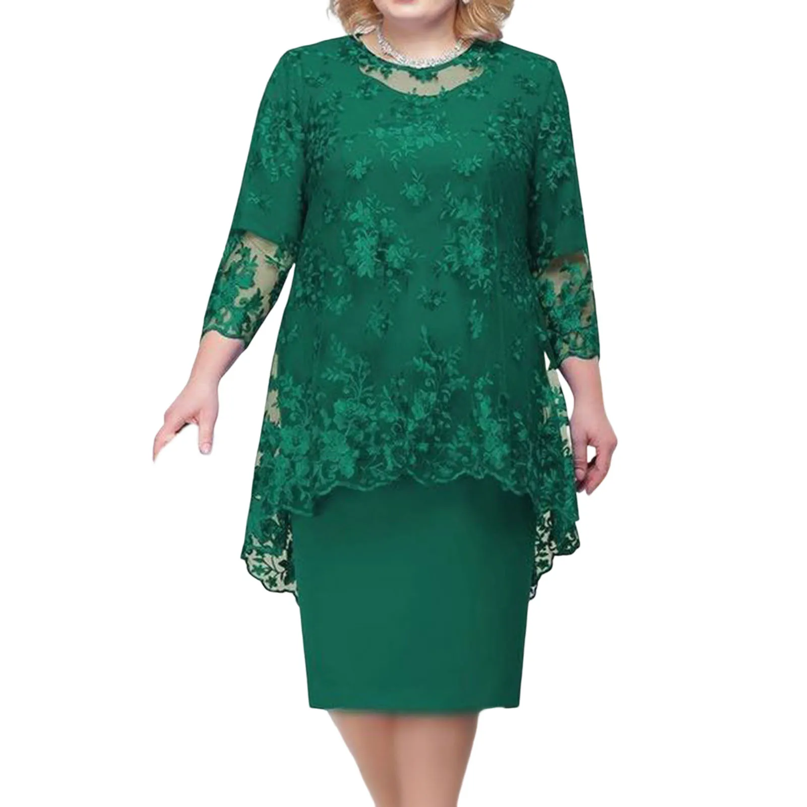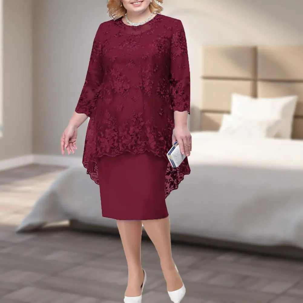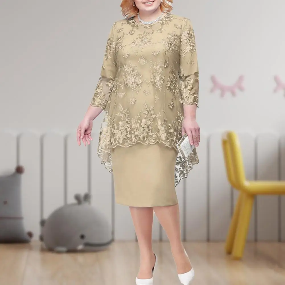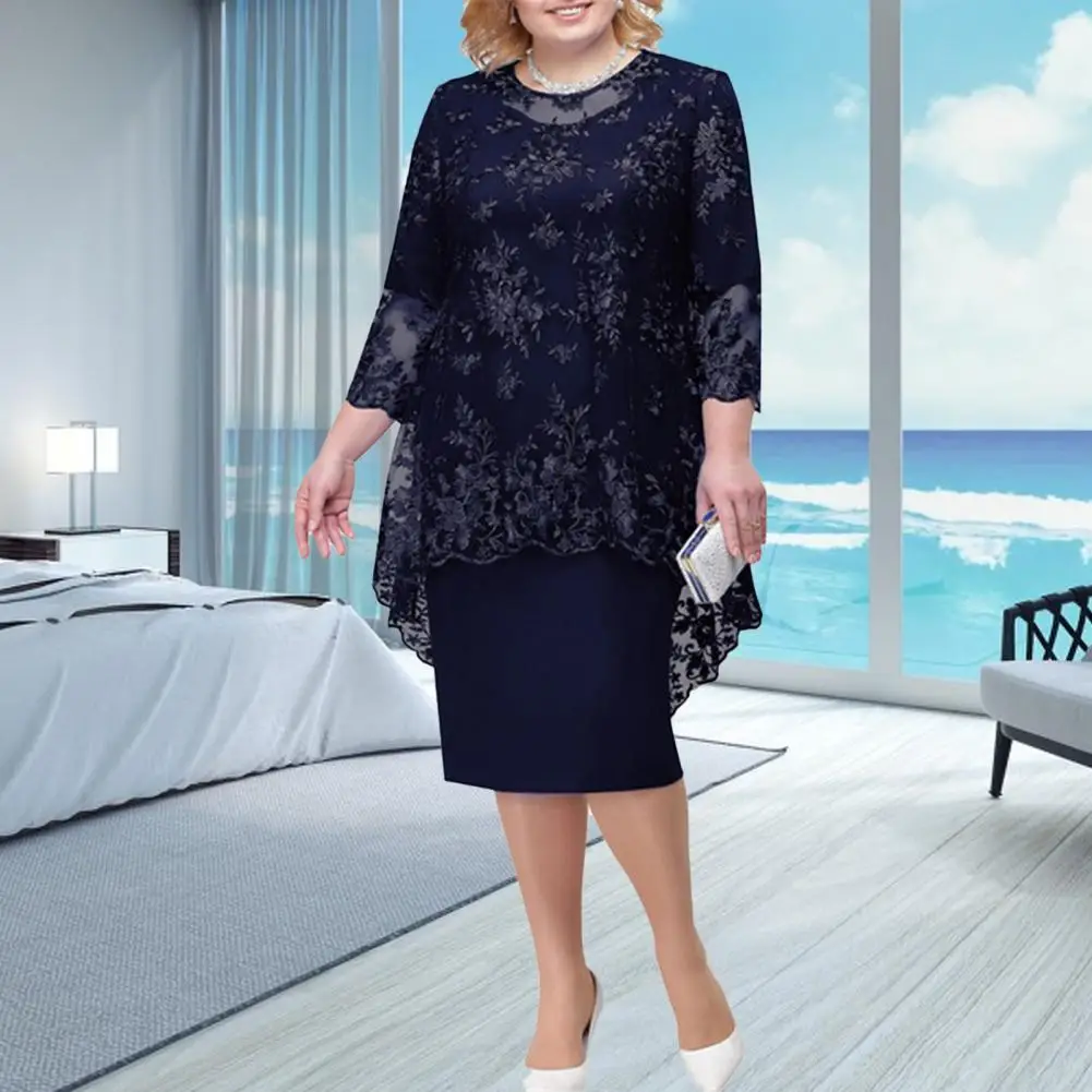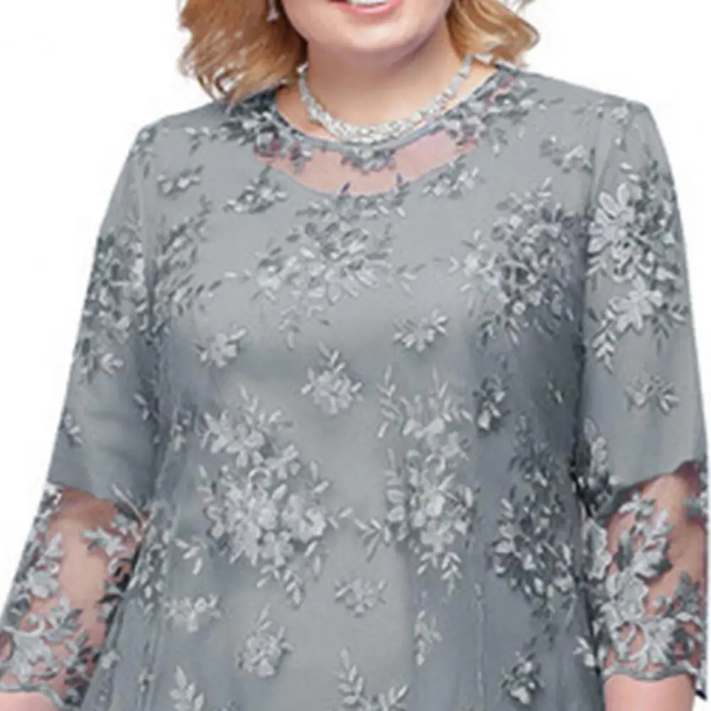 O-neck High-Waist Plus Size Midi Dress Embroidery Lace 3/4 Sleeve Lady Evening Dress Female Clothing