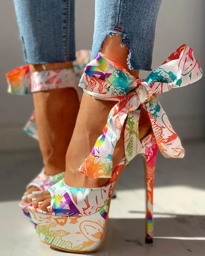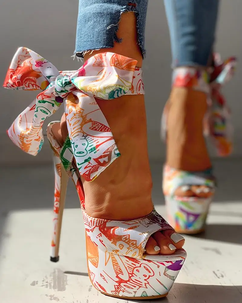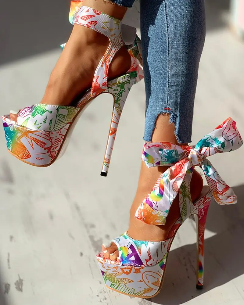 2022 sexy shoes Print super thin high heels Shoes sandals women Summer Party platform ankle-wrap Woman sandals female