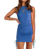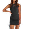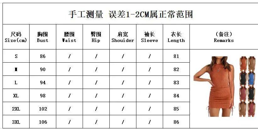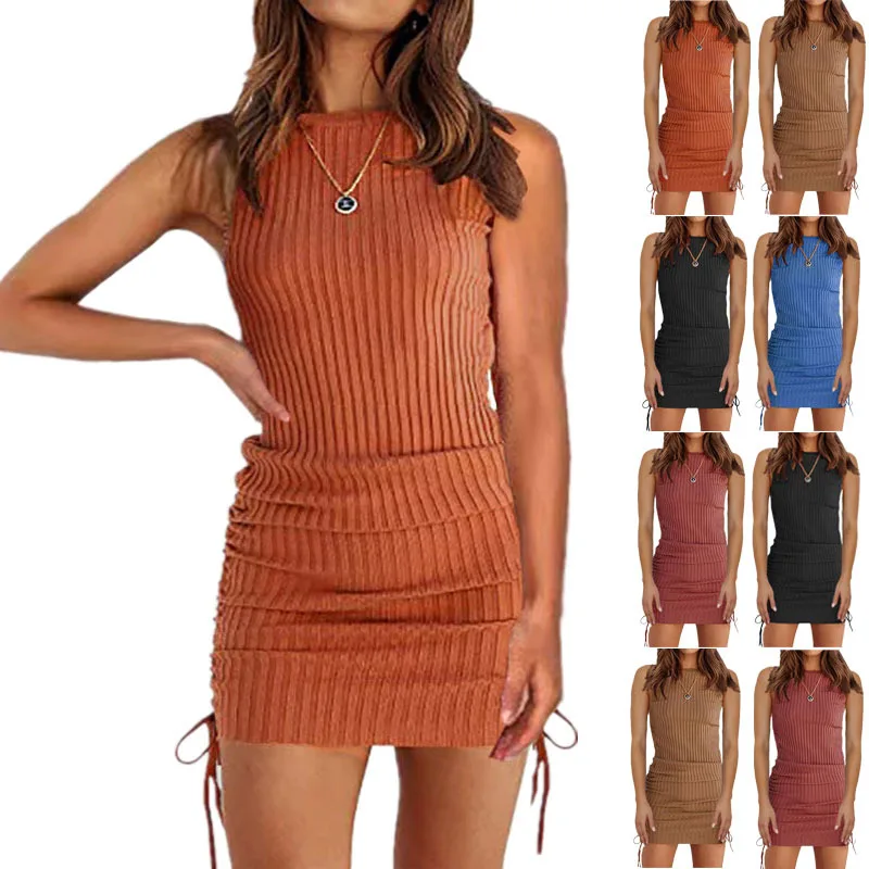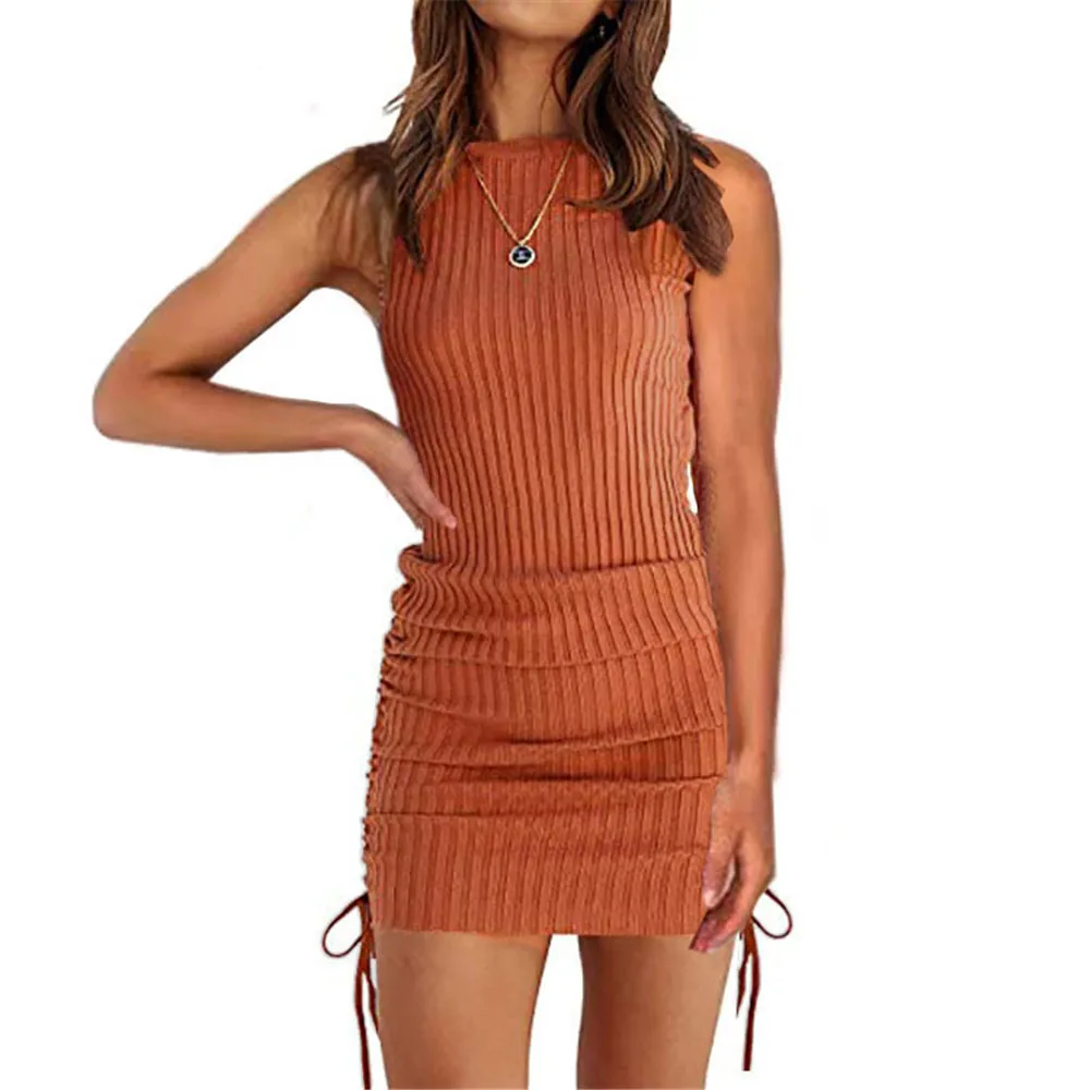 2022 Spring And Summer New Ladies Mini Skirt Solid Color Round Neck Ribbed Vest Knitted Drawstring Llong Sleeve Sexy Dress