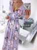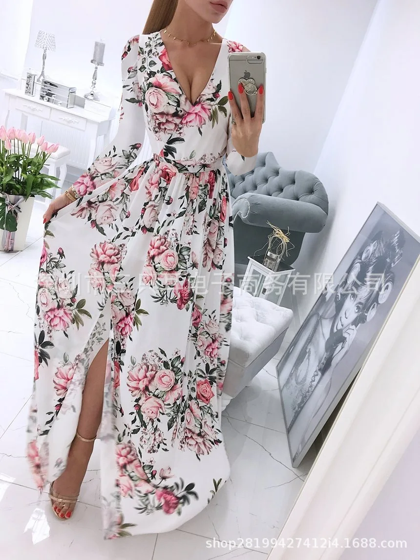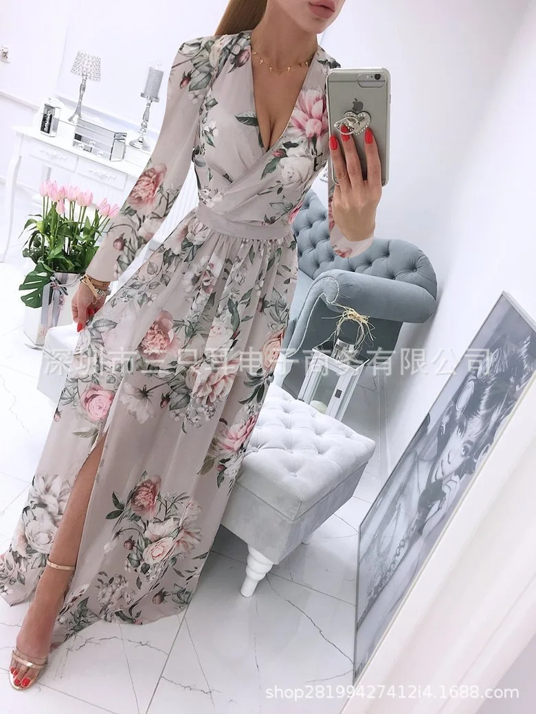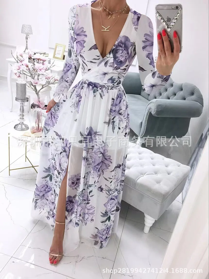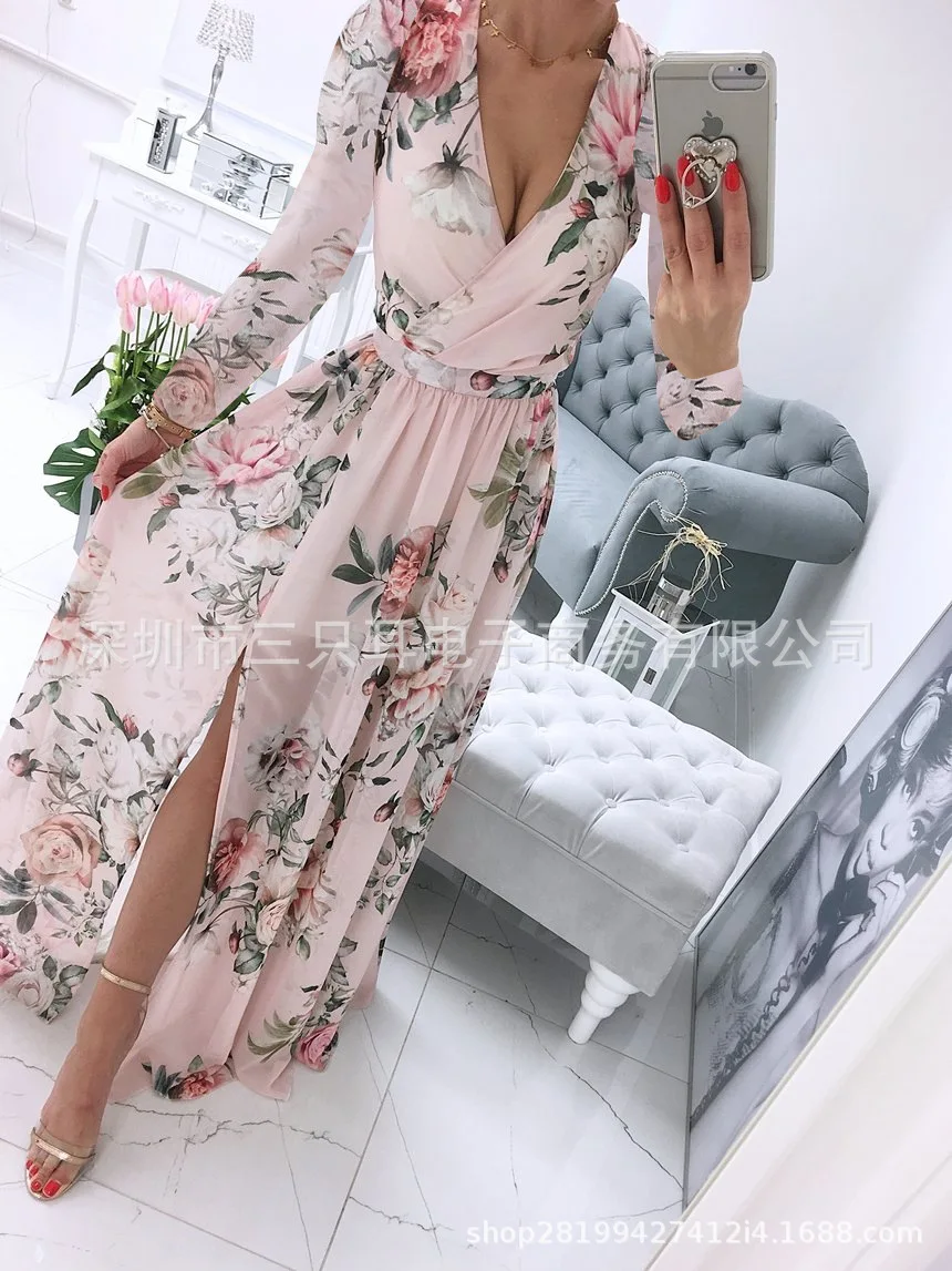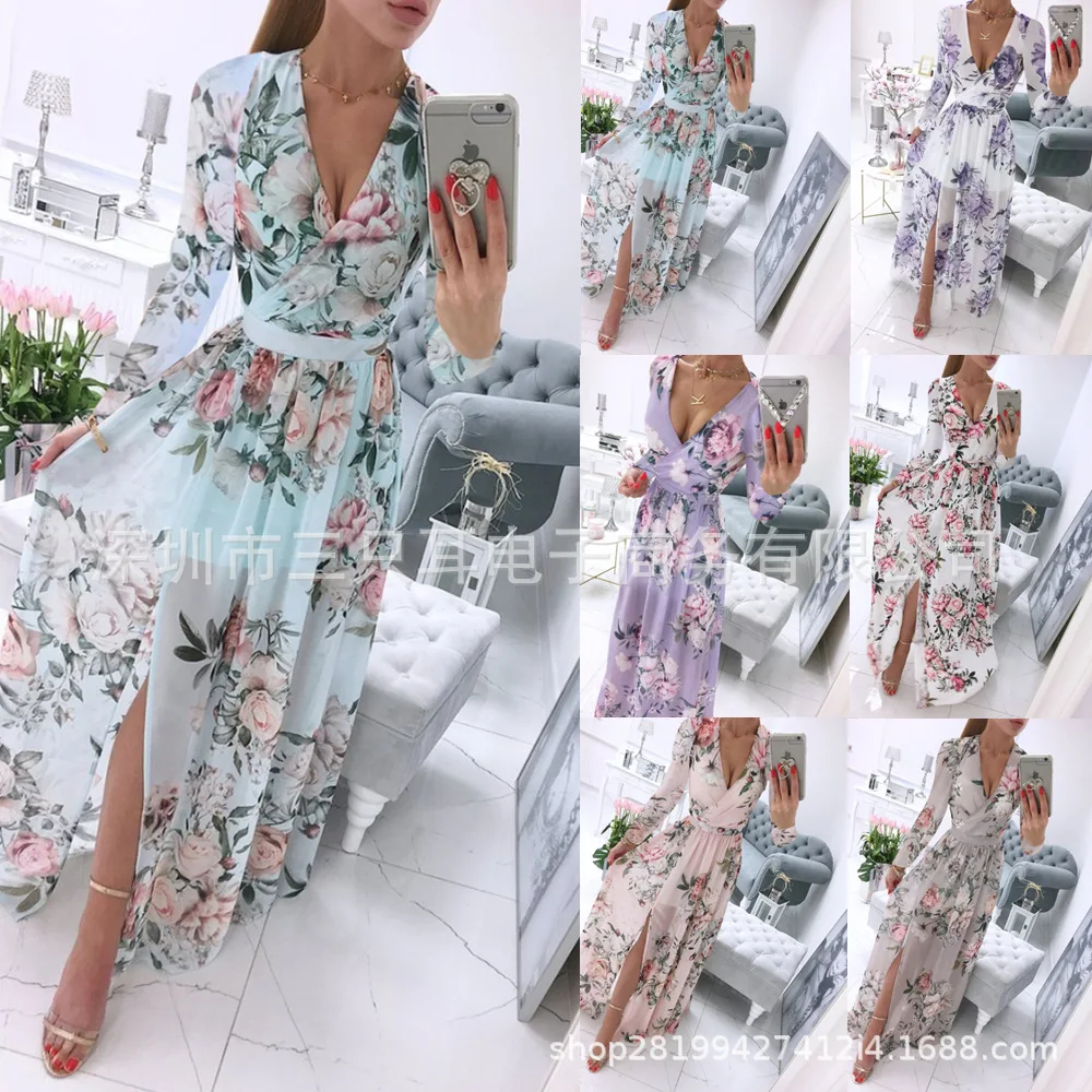 2022 Spring Summer Long Sleeve V-Neck Chiffon Printed Bohemian Dress For Women Slim High Waist Split Irregular Pullover Dresses