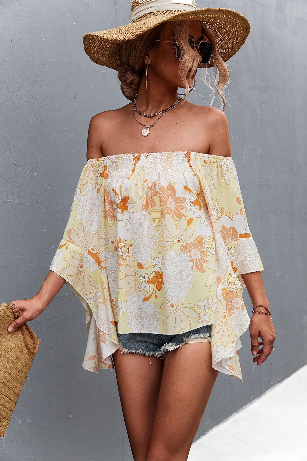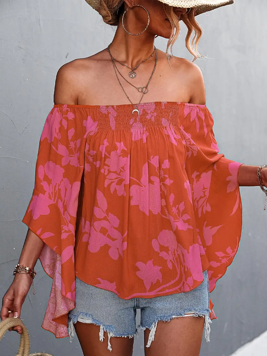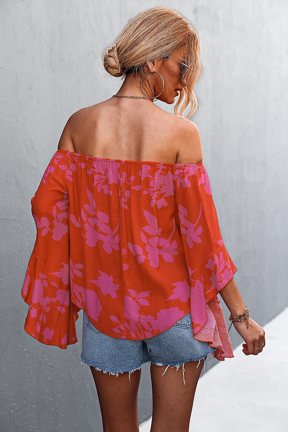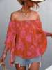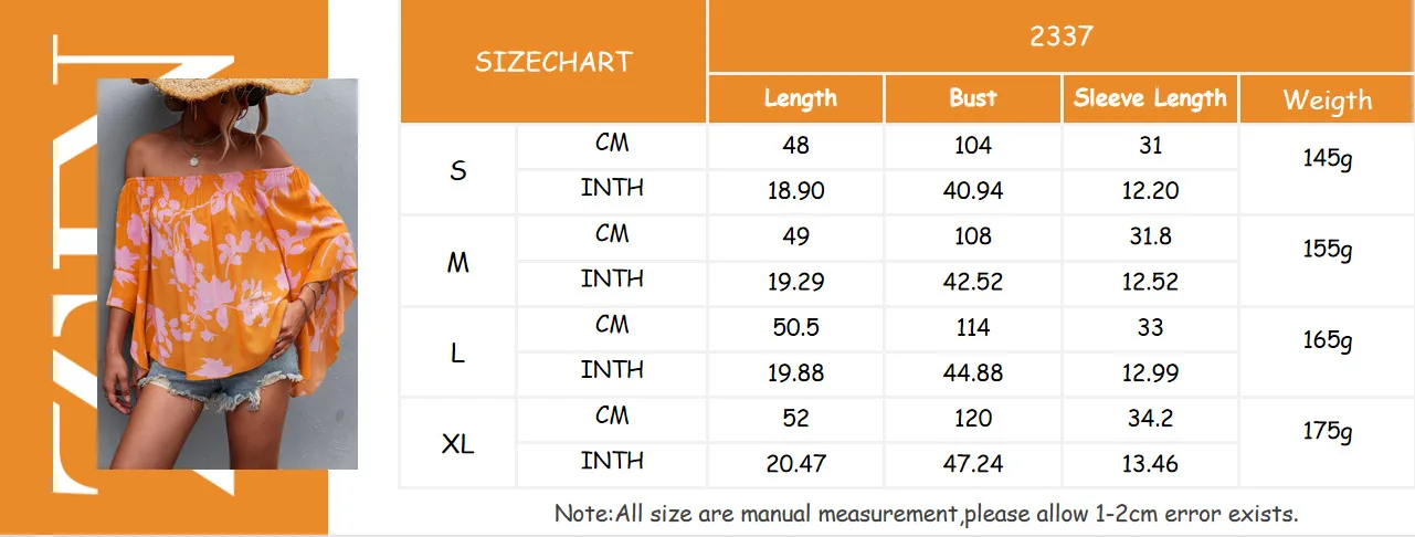 2022 Spring Summer New Irregular Sexy One-shoulder Bell-sleeve Printed Top Women Stylish Off Shoulder Pullover Patchwork Shirt