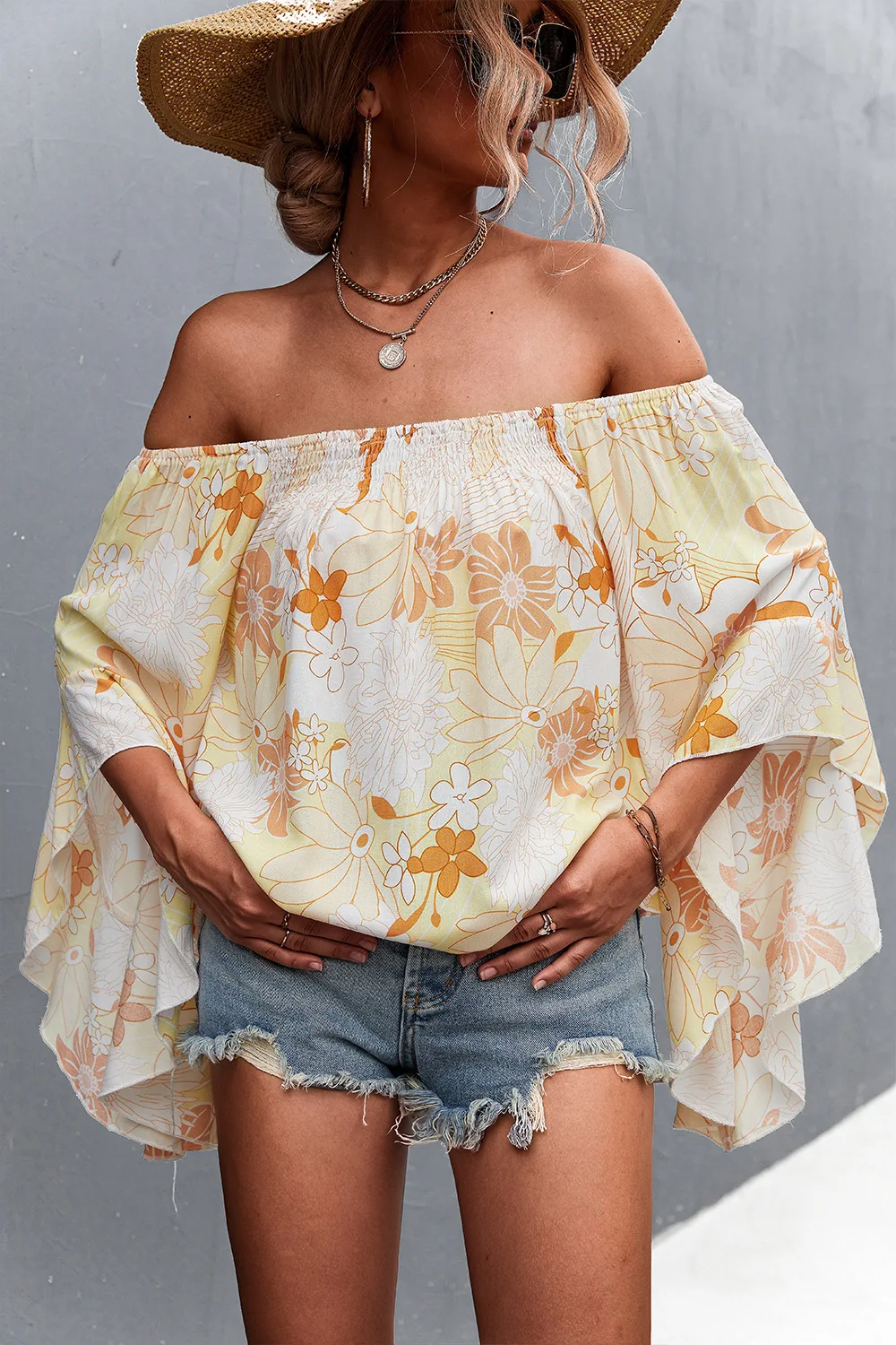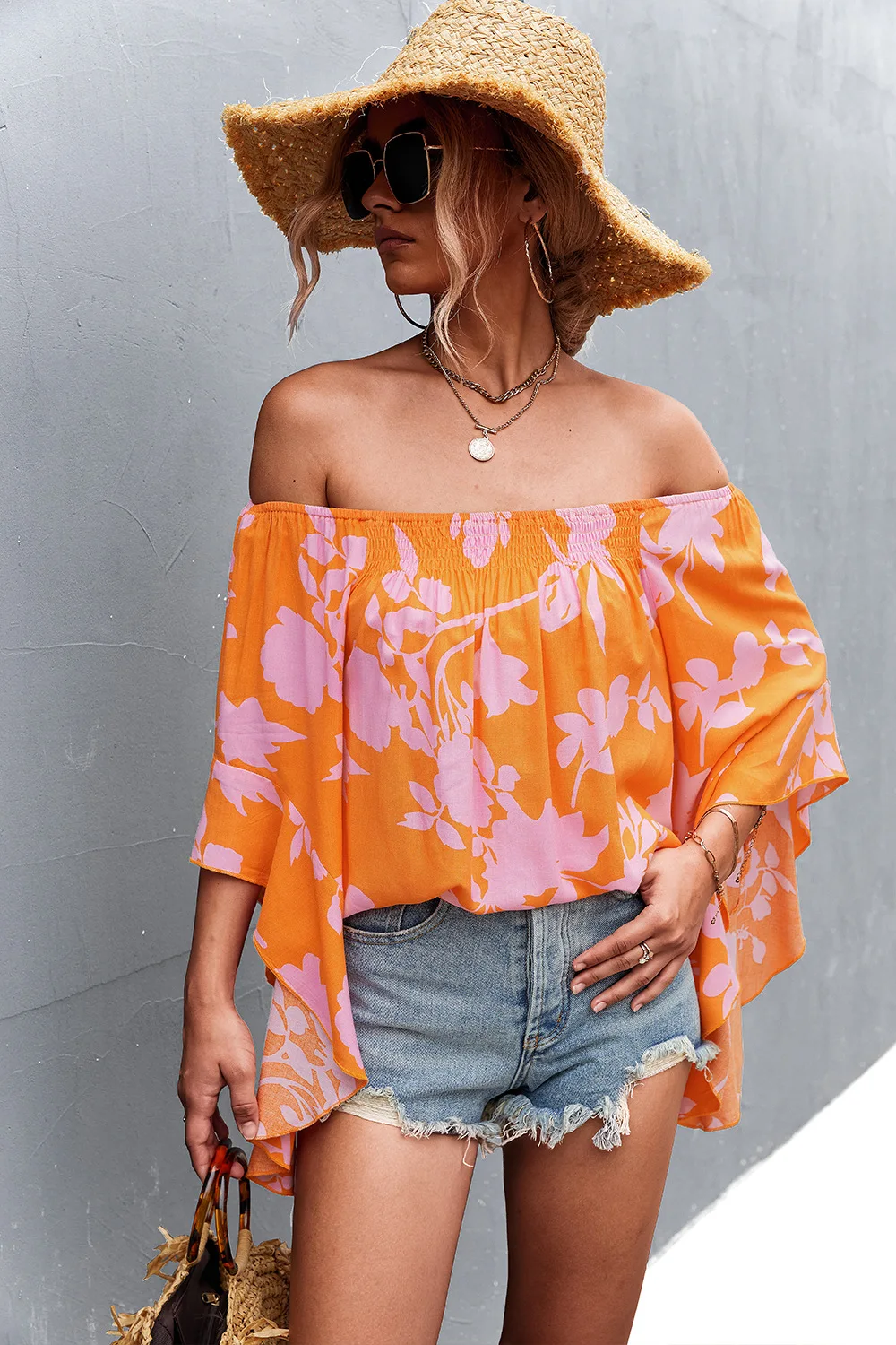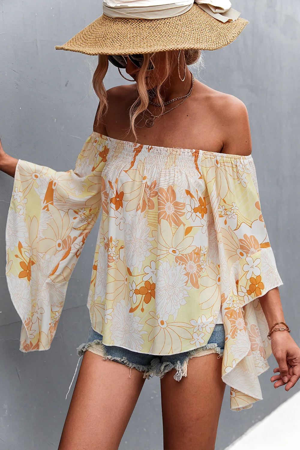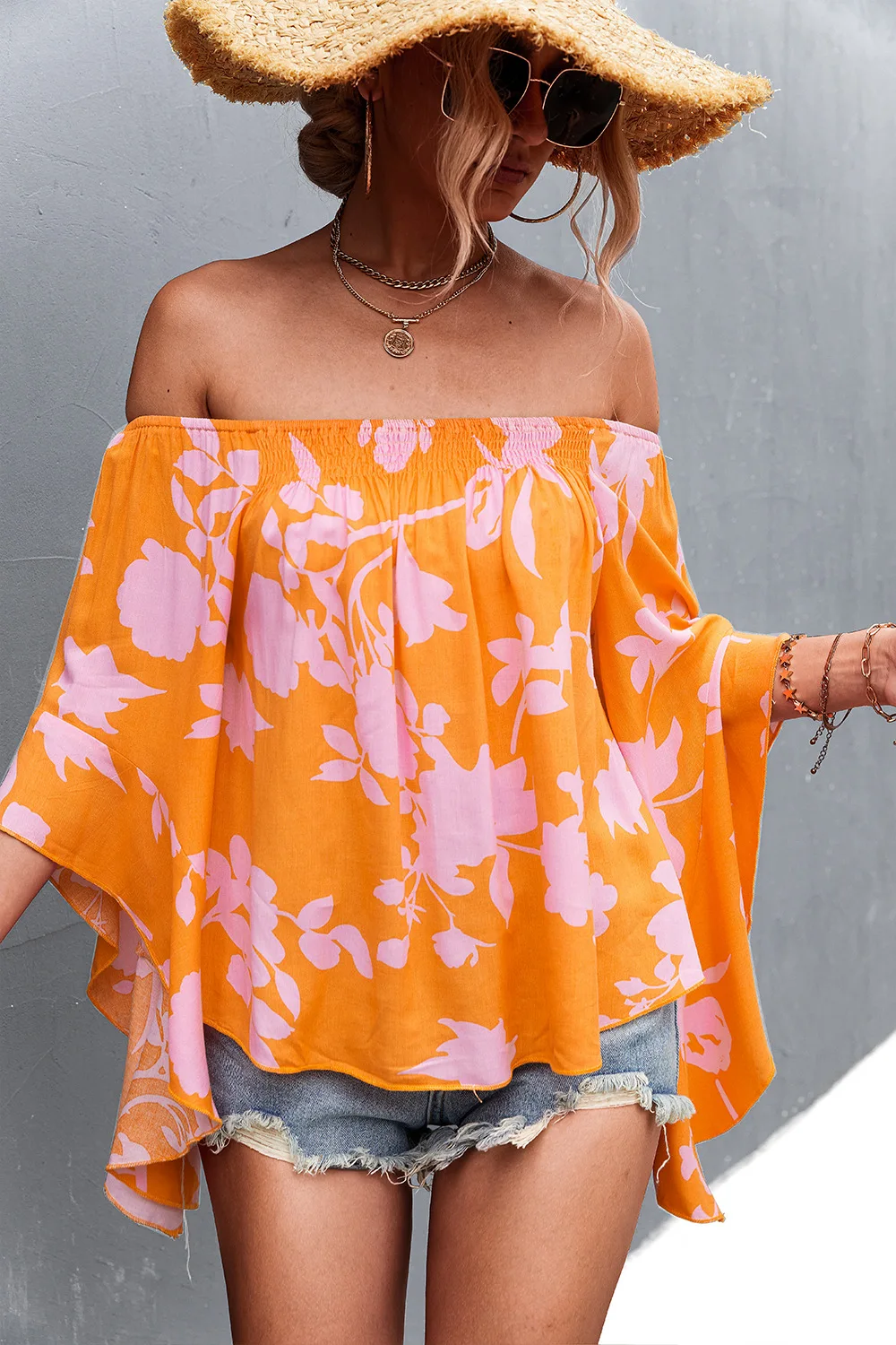 2022 Spring Summer New Irregular Sexy One-shoulder Bell-sleeve Printed Top Women Stylish Off Shoulder Pullover Patchwork Shirt