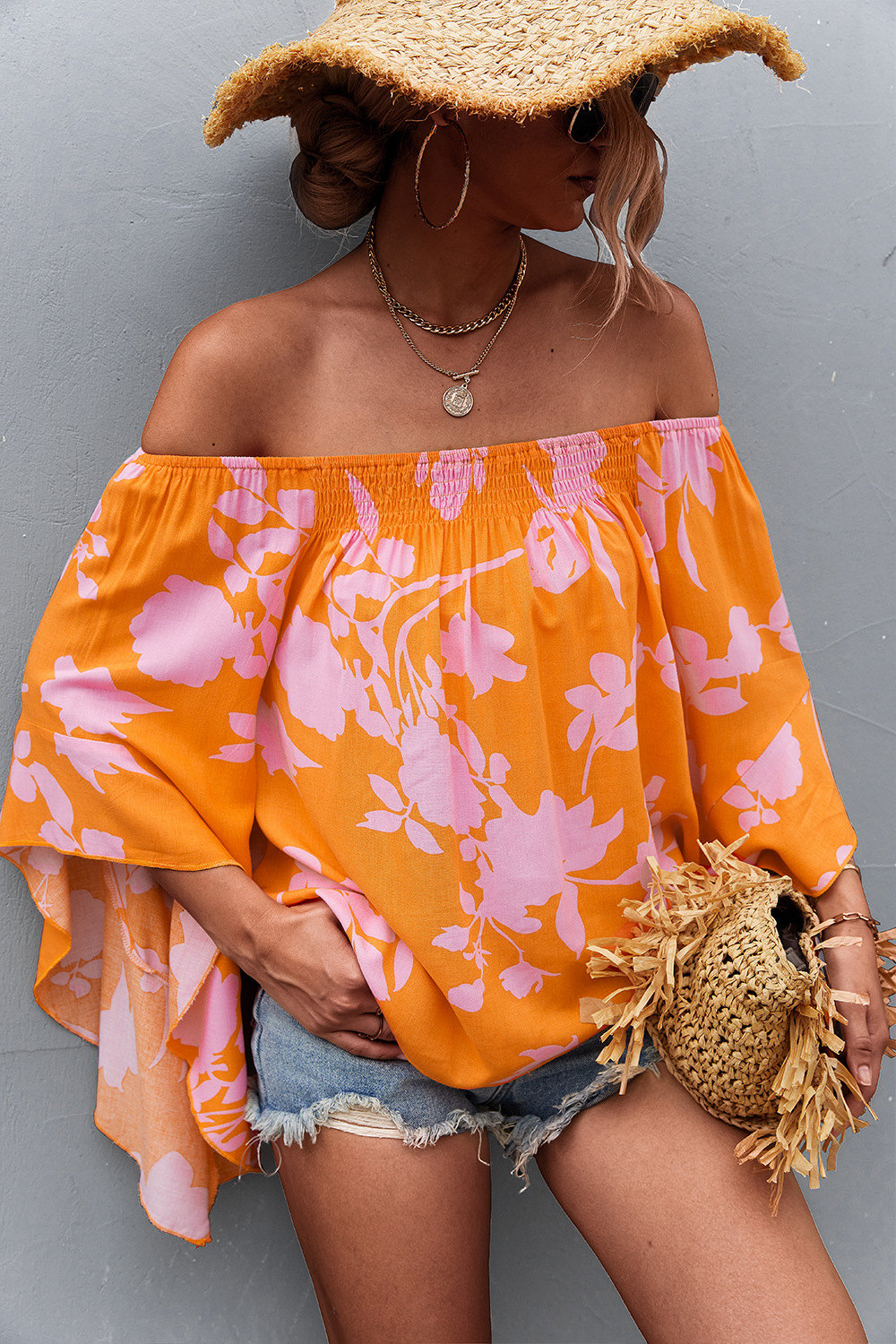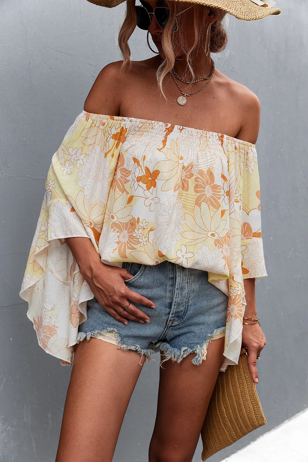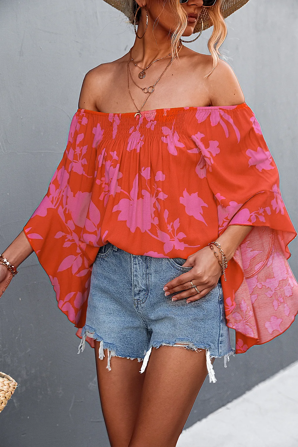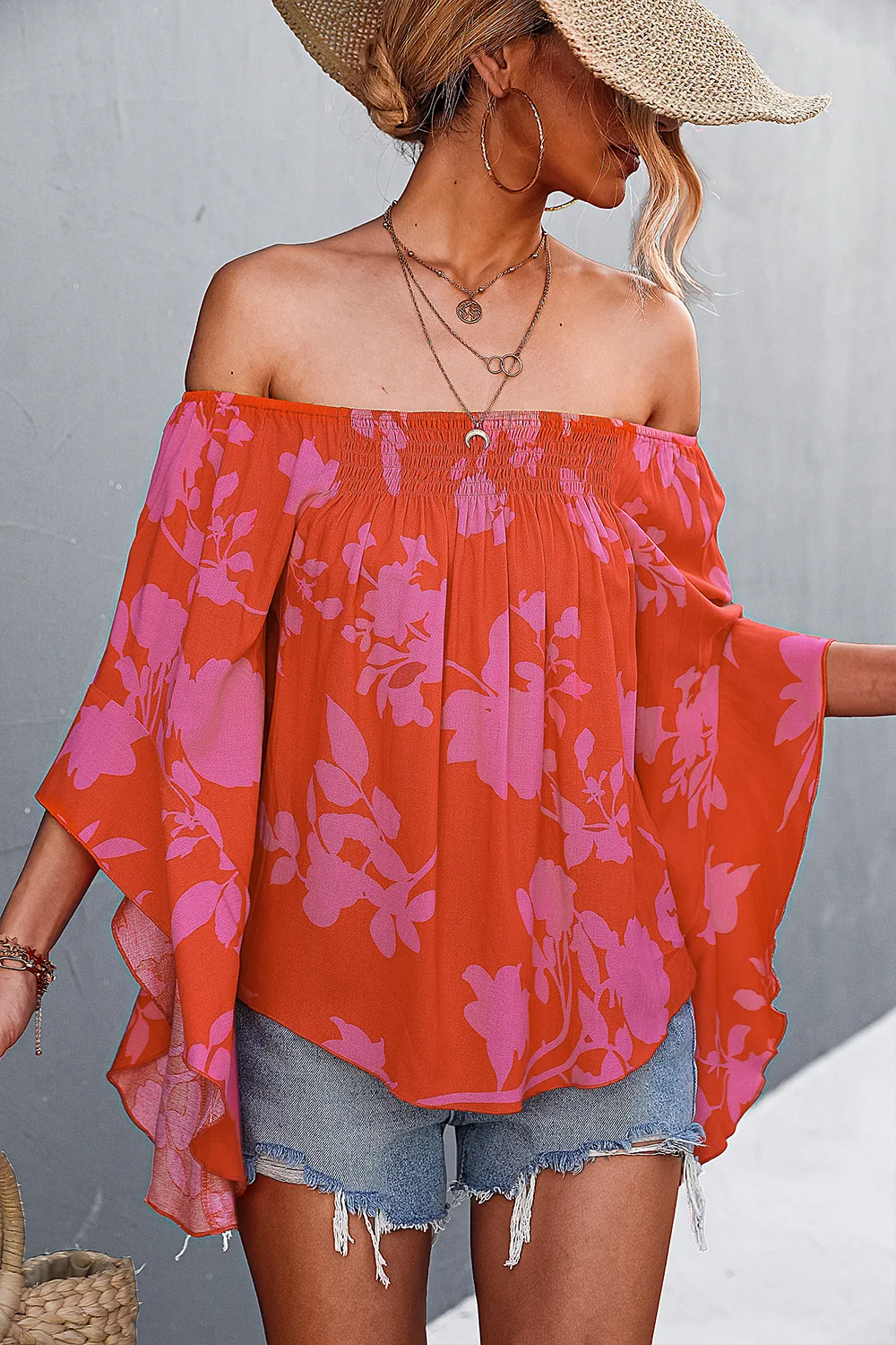 2022 Spring Summer New Irregular Sexy One-shoulder Bell-sleeve Printed Top Women Stylish Off Shoulder Pullover Patchwork Shirt