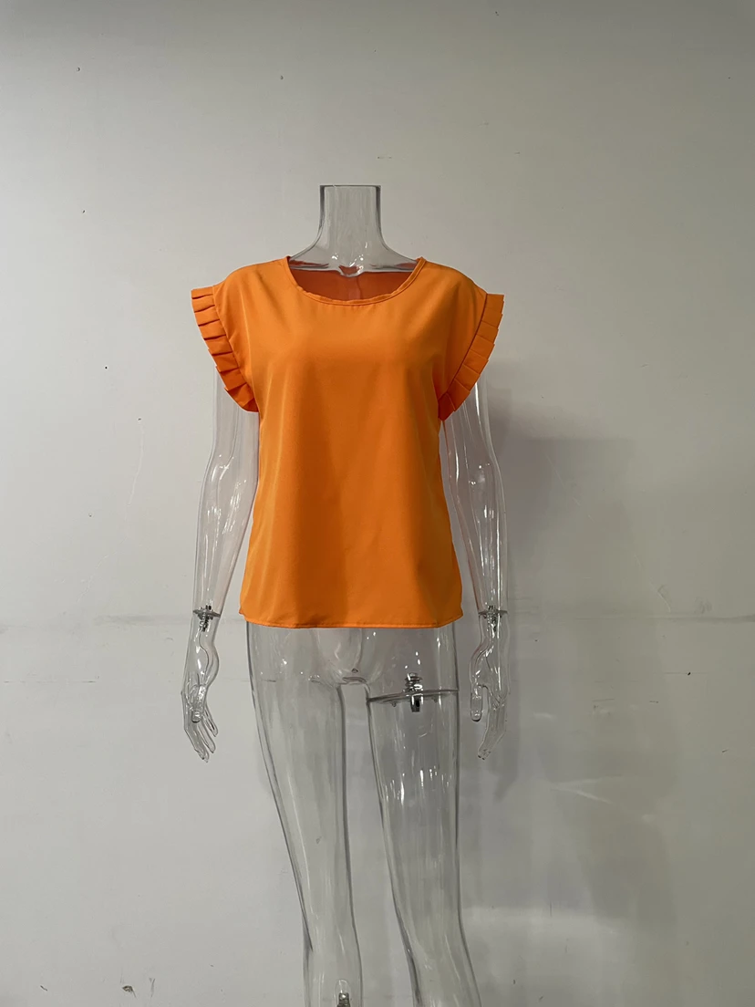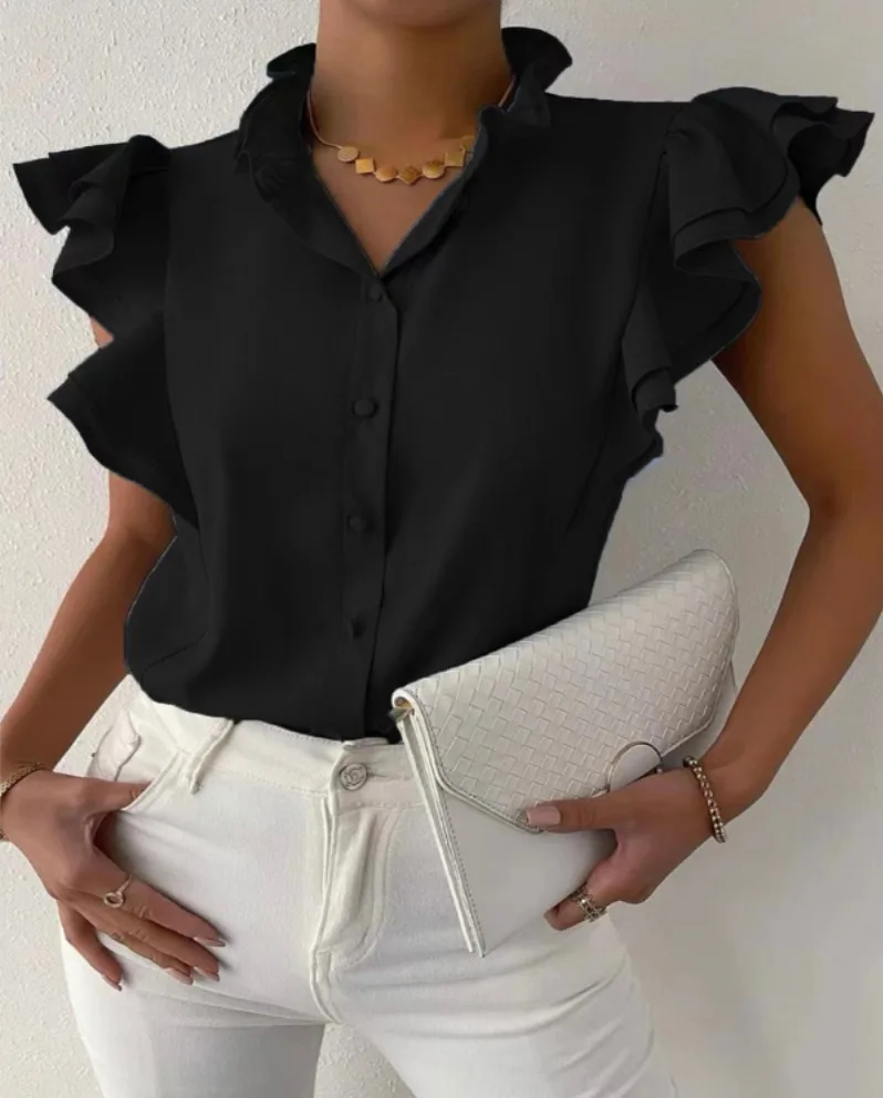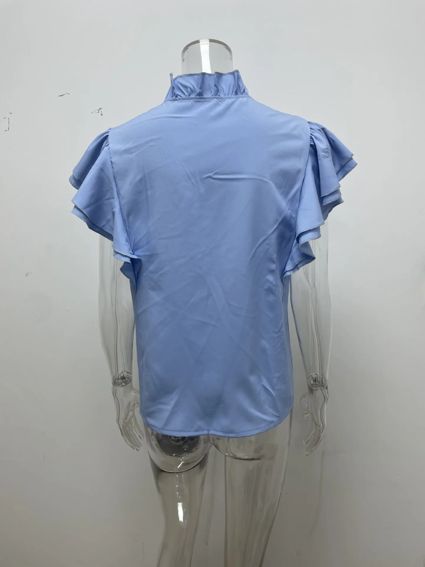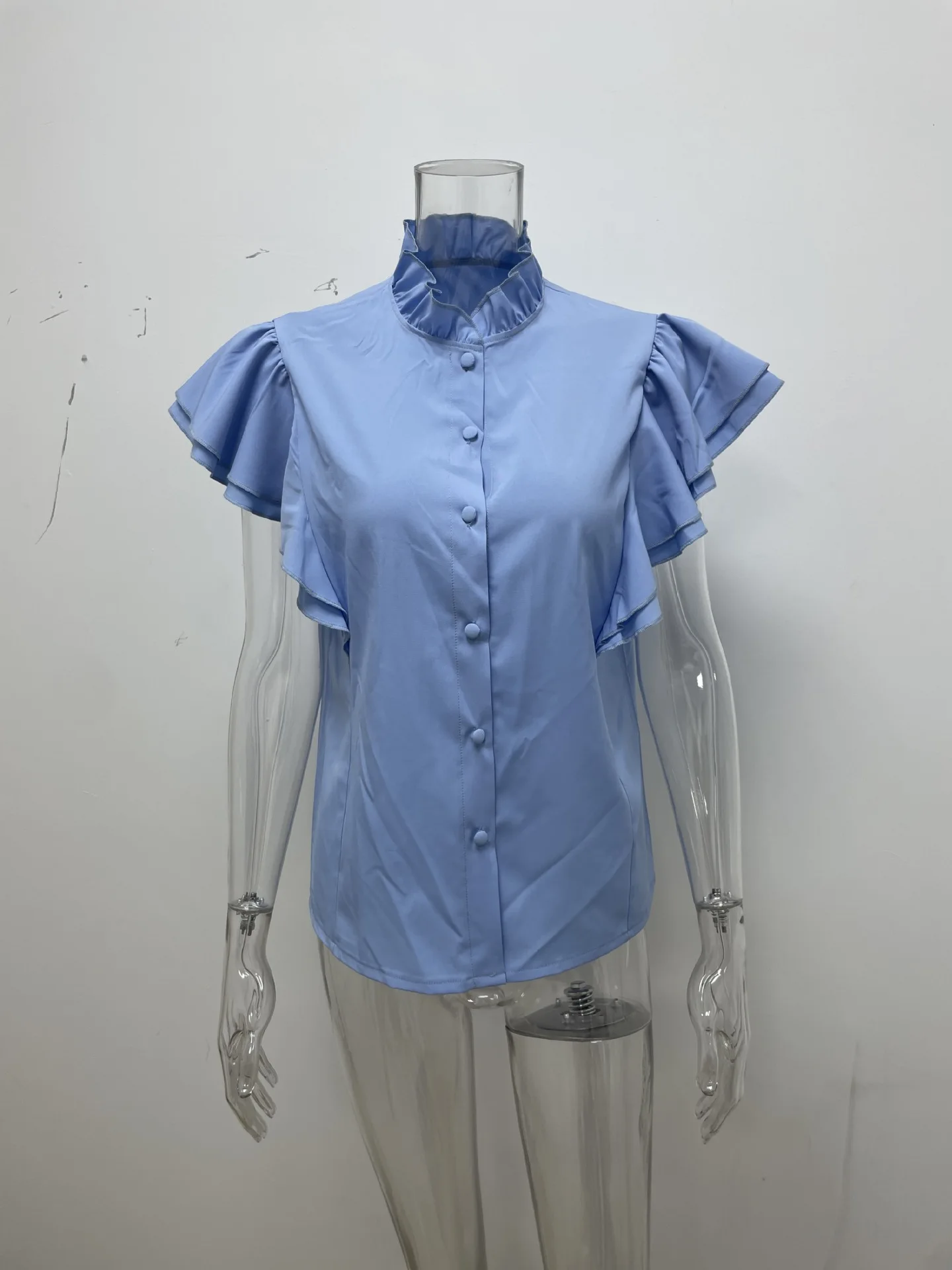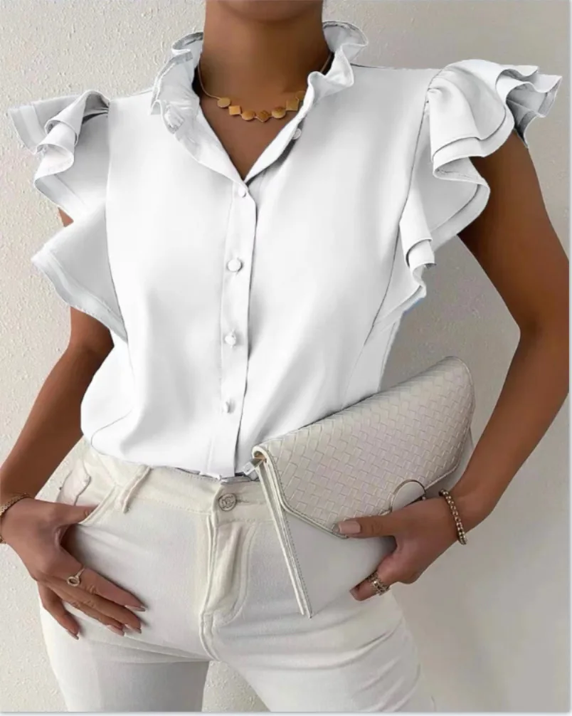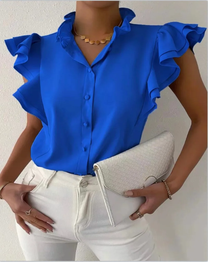 2022 Summer Casual Solid Button Blouse Shirts Fashion V-Neck Tops Ladies Spring Elegant V-Neck Butterfly Sleeve Blusa Streetwear