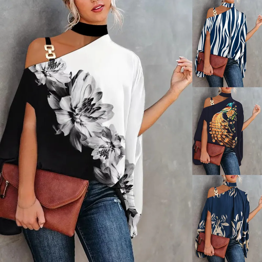 2022 Summer Halter Printed Shirt Ladies Loose Bat Sleeve Shirts Women Irregular Hollow Out Pullover Blouse Top Femme Blusas
