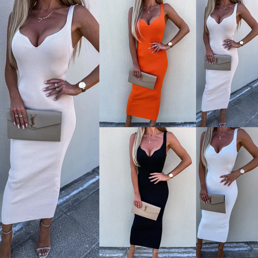 2022 Summer High Elastic Vest Robe Vestidos Elegantes Para Mujer Sexy Dress V-neck Sleeveless Slim Fit Hip Slim Maxi Dress Femme