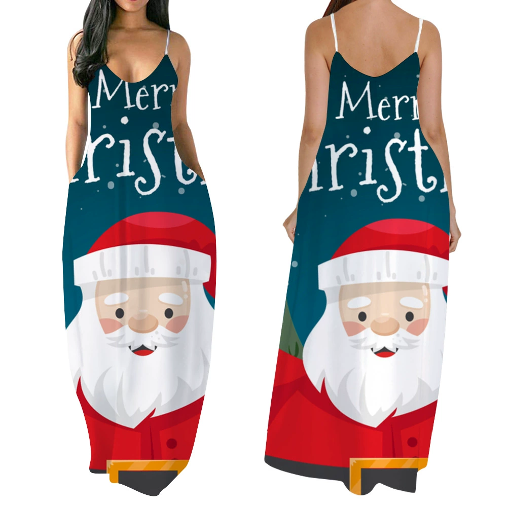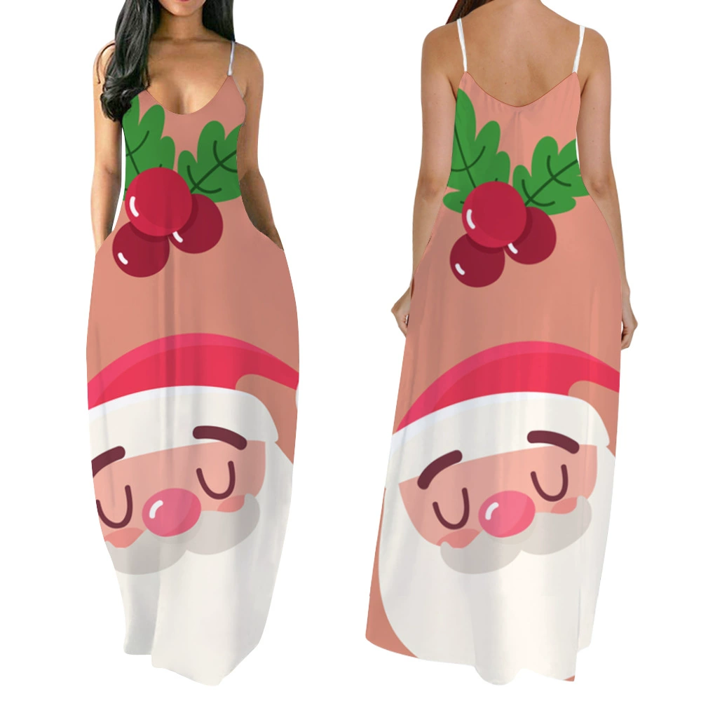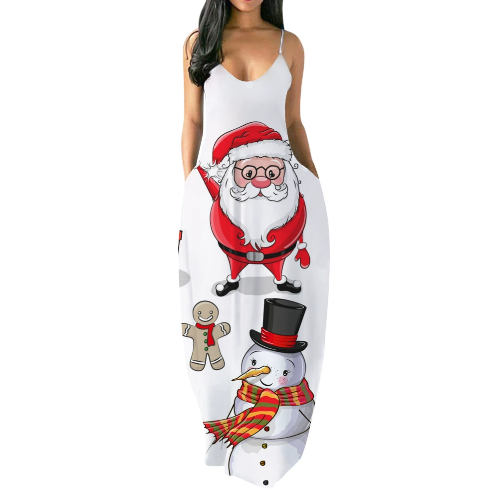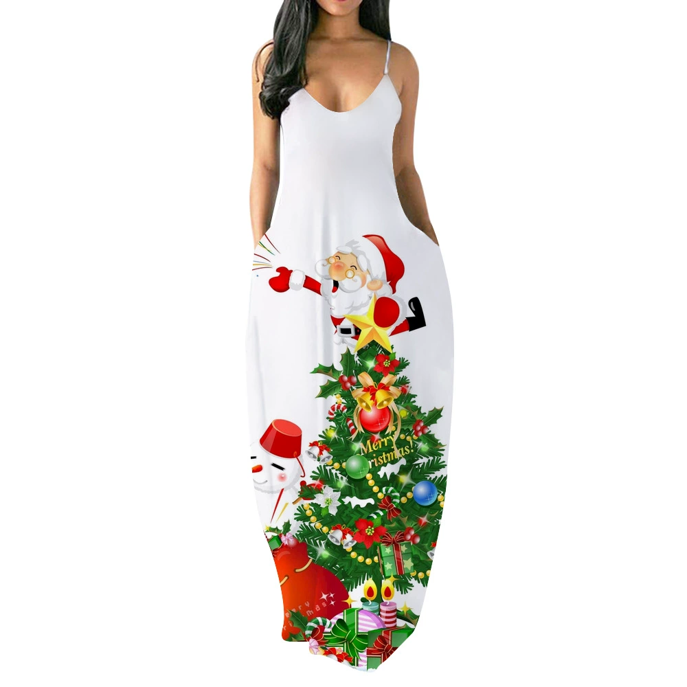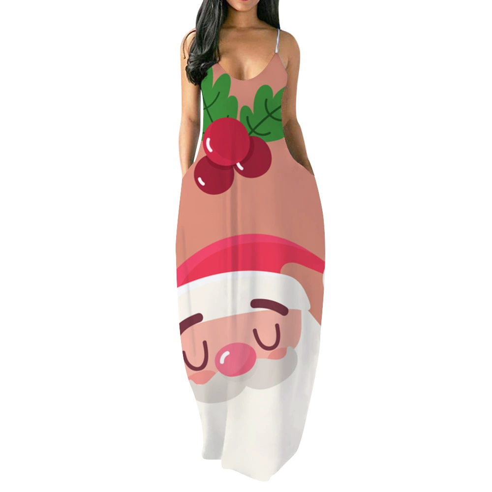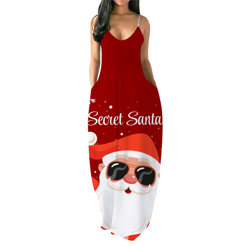 2022 Summer New Ladies Robe Dress Sexy Sling Santa Claus 3D Digital Printing O Neck Insert Pocket Multicolor Casual Long Dress