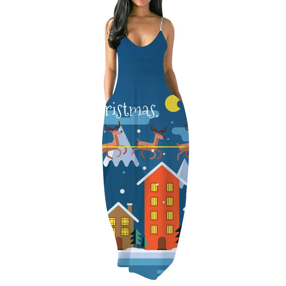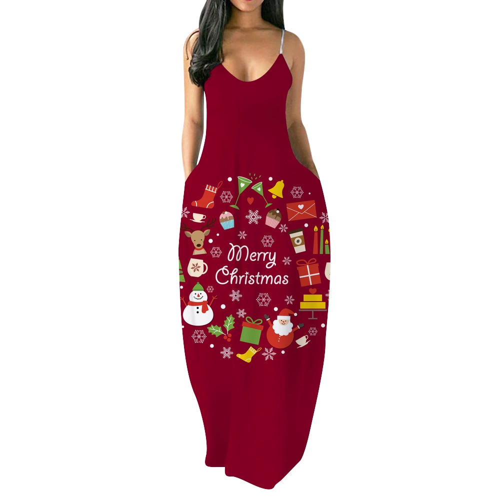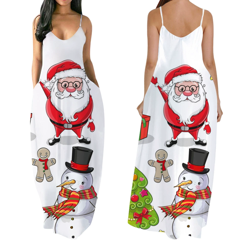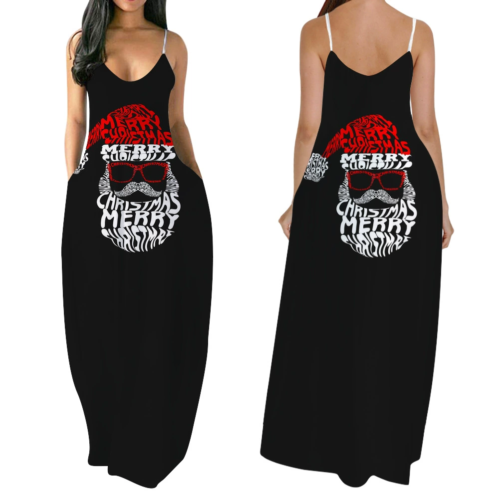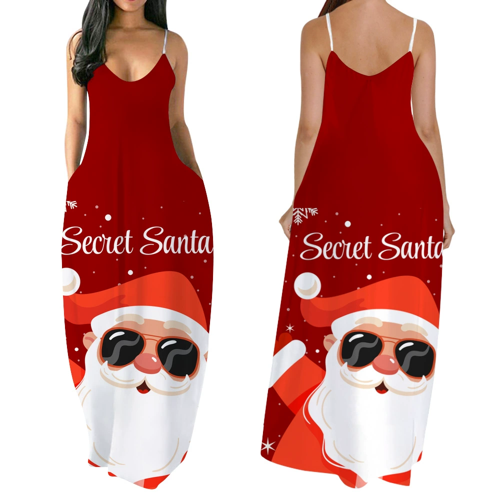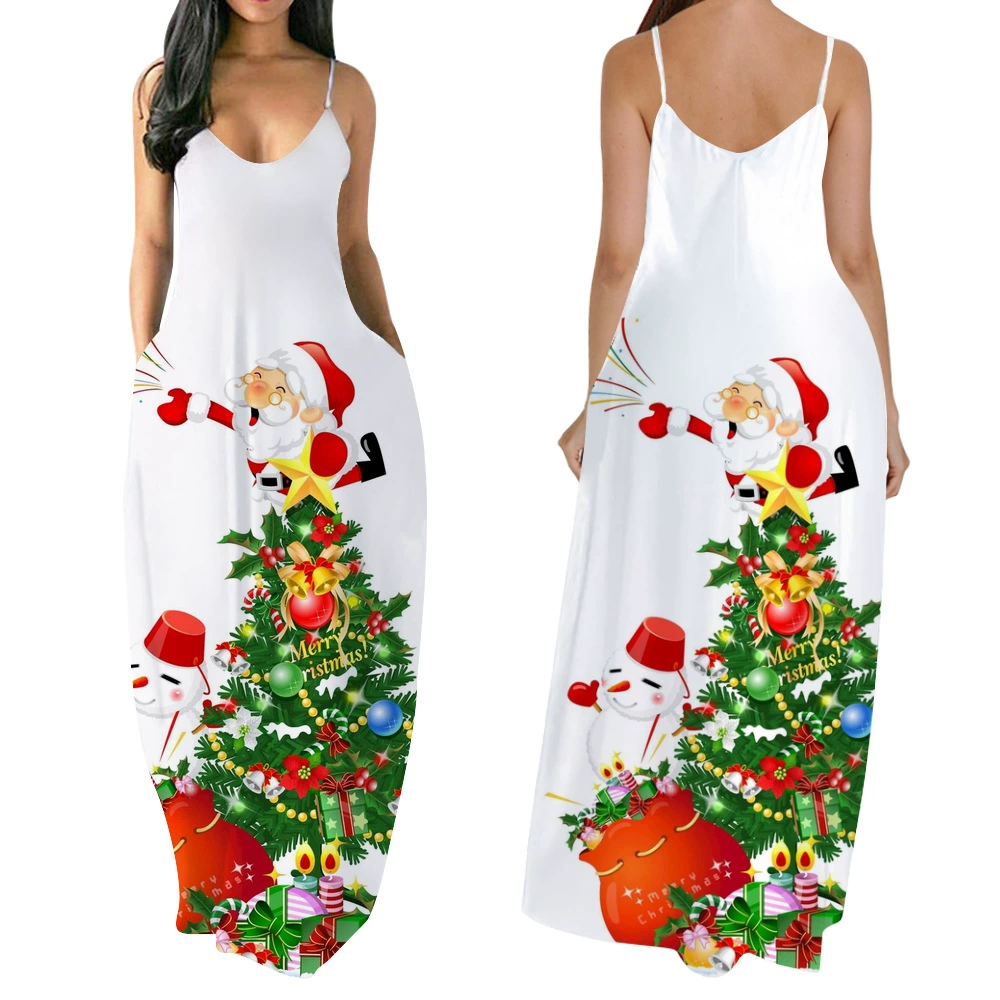 2022 Summer New Ladies Robe Dress Sexy Sling Santa Claus 3D Digital Printing O Neck Insert Pocket Multicolor Casual Long Dress