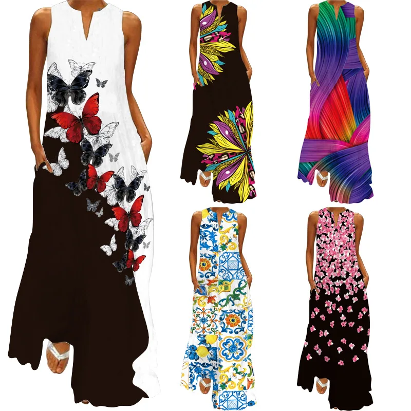 2022 Summer New Retro Long Dress V-neck Multicolor Long Sexy Sleeveless Dress Fashionable Elegant 3D Printed Maxi Dresses Women