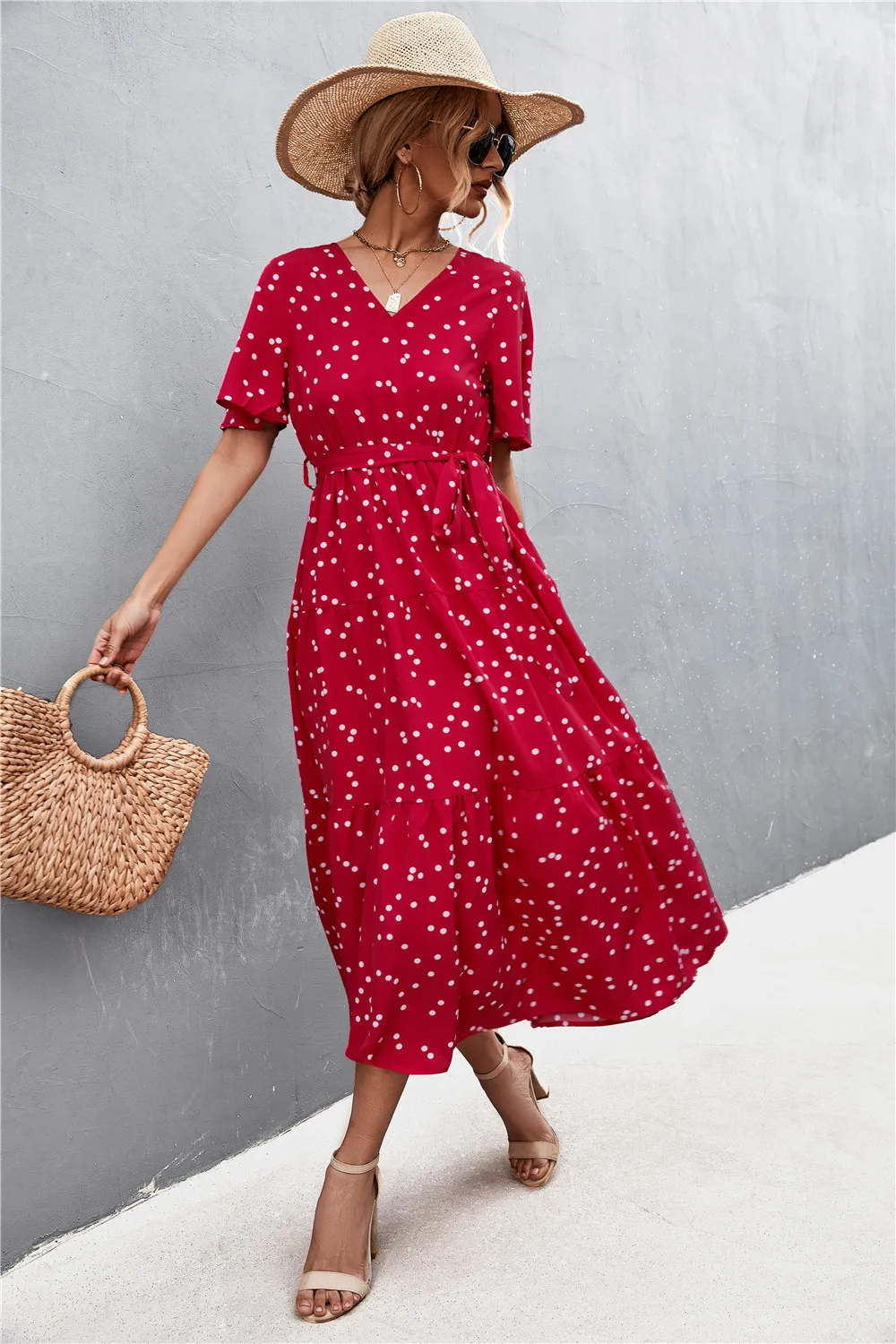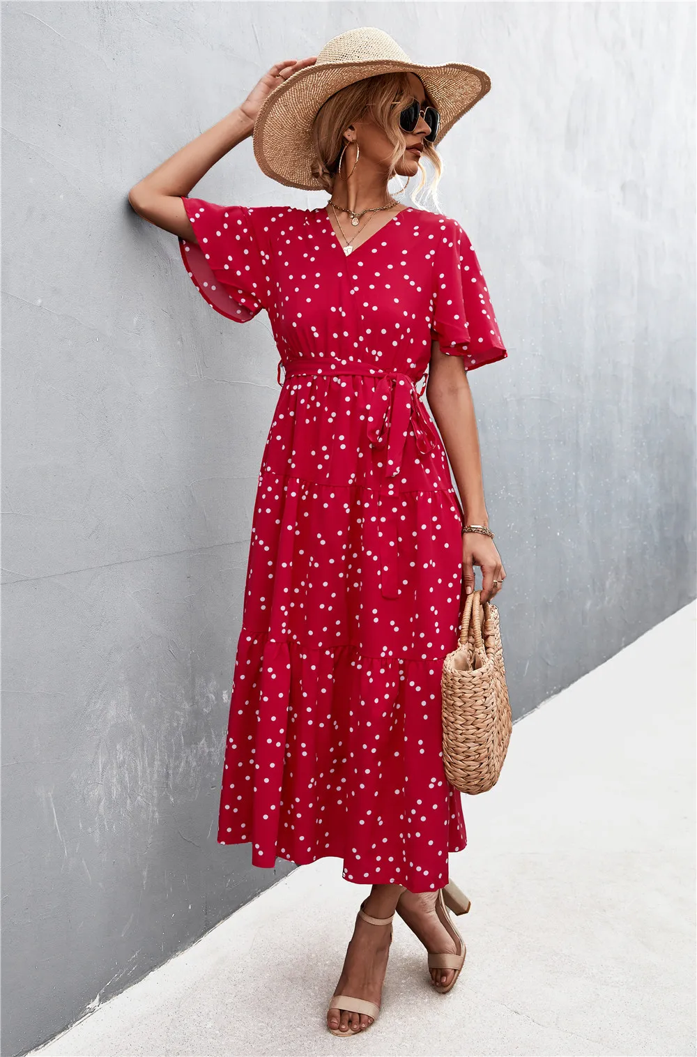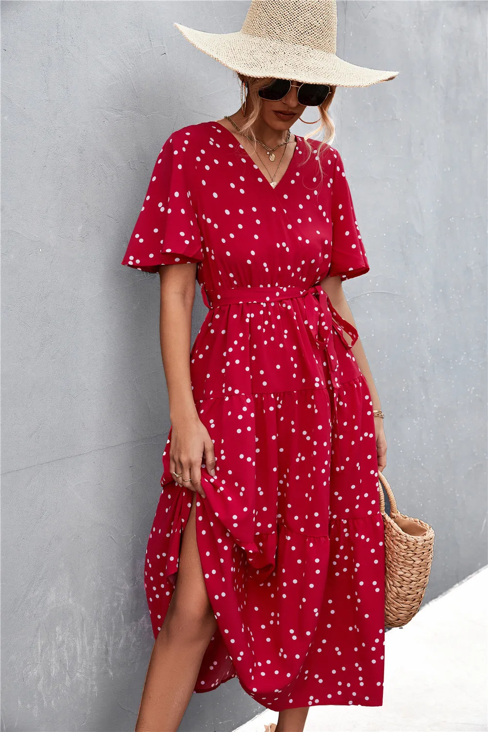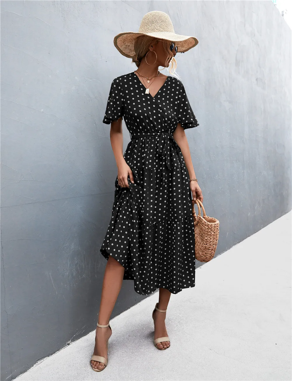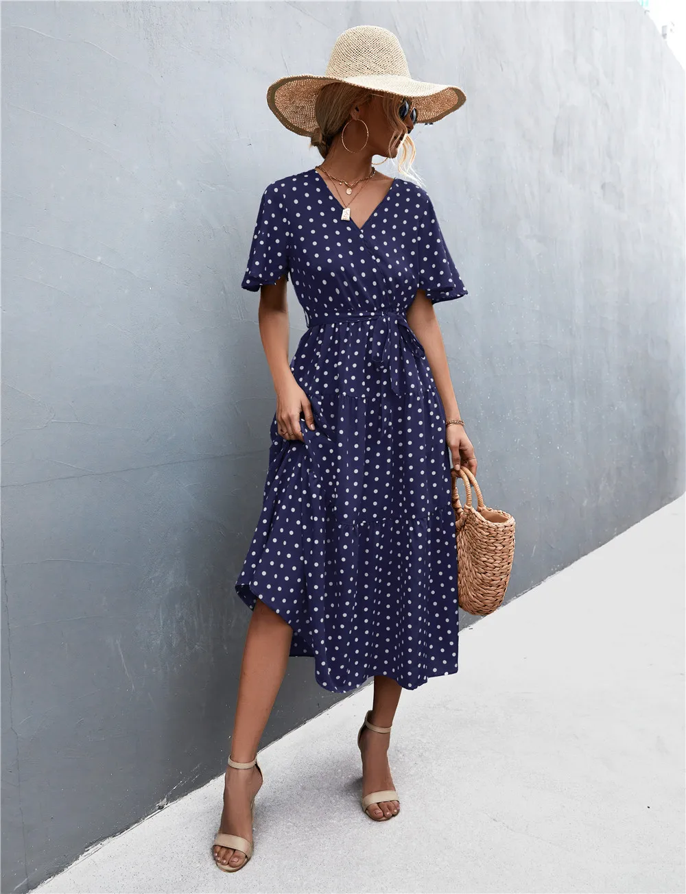 2022 Summer New Women V-neck Cross Polka Dot Floral Dress Strappy Long Dress Fashion Boho Pullover High Waist Maxi Dresses Robe