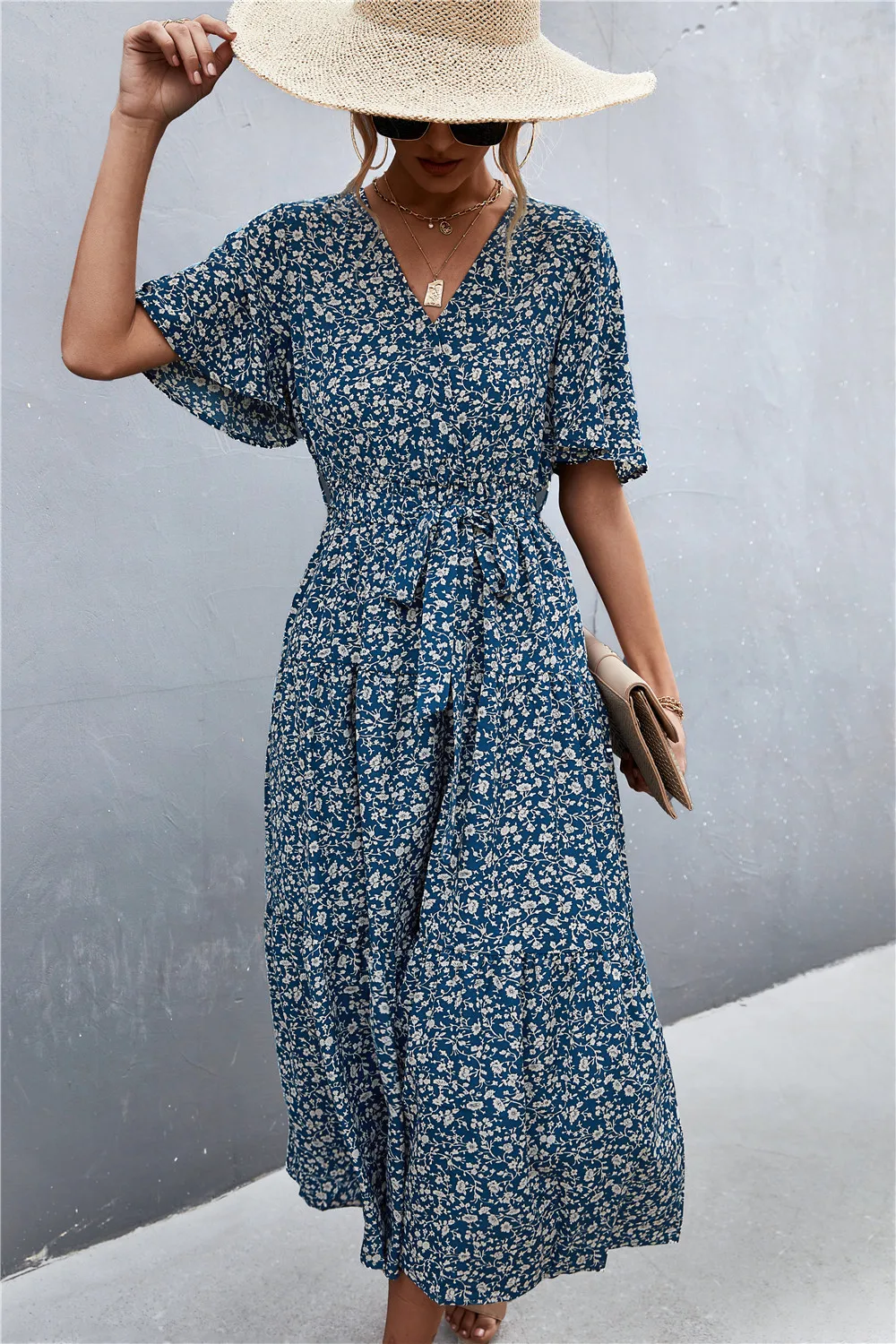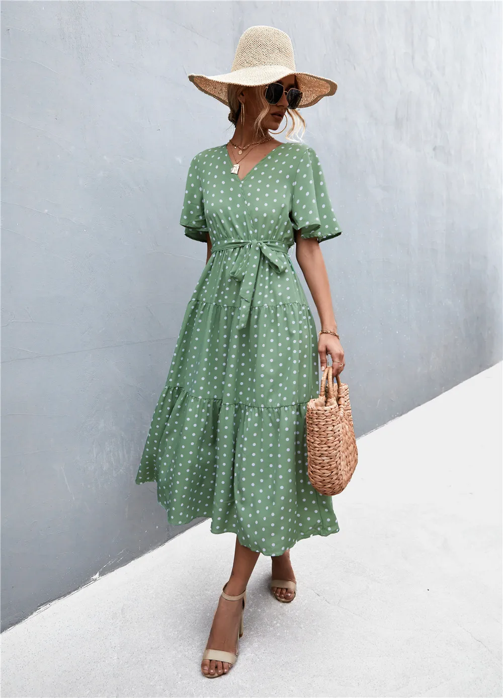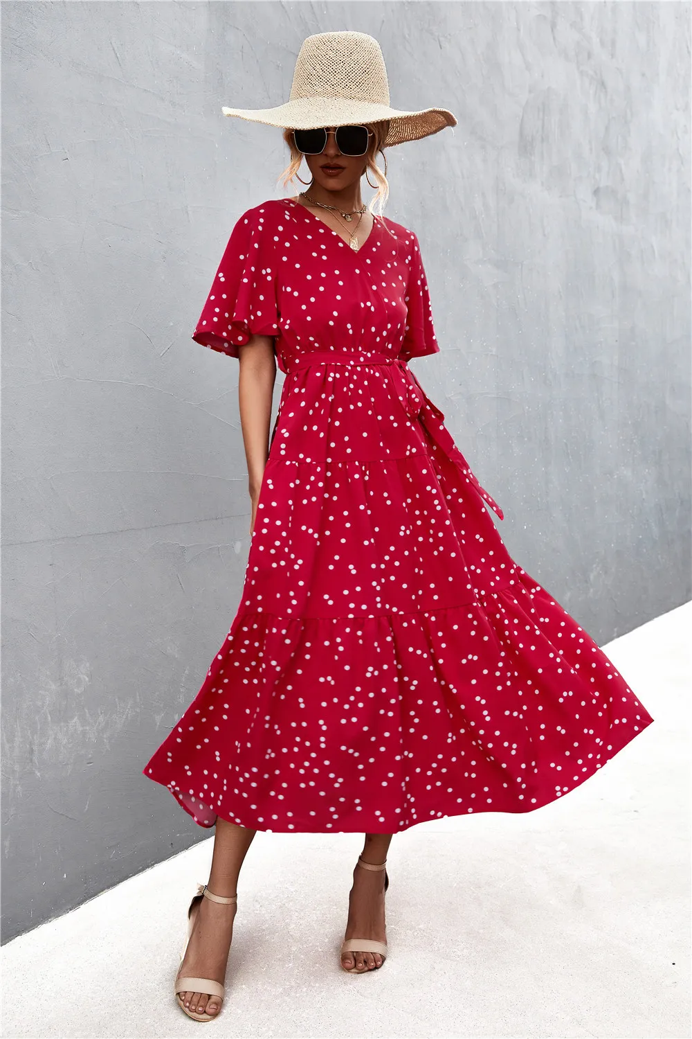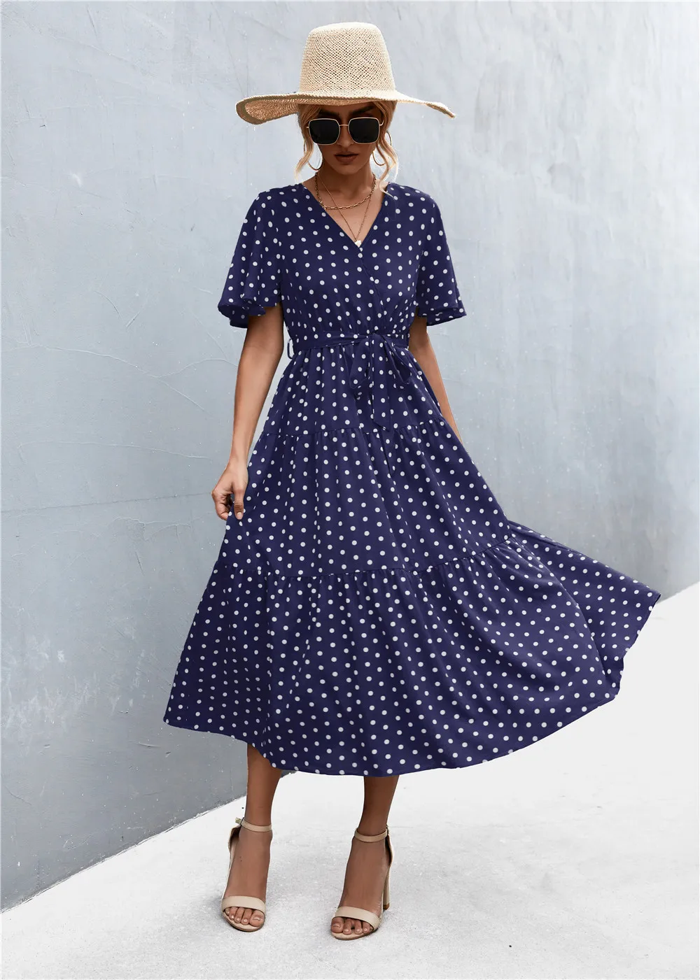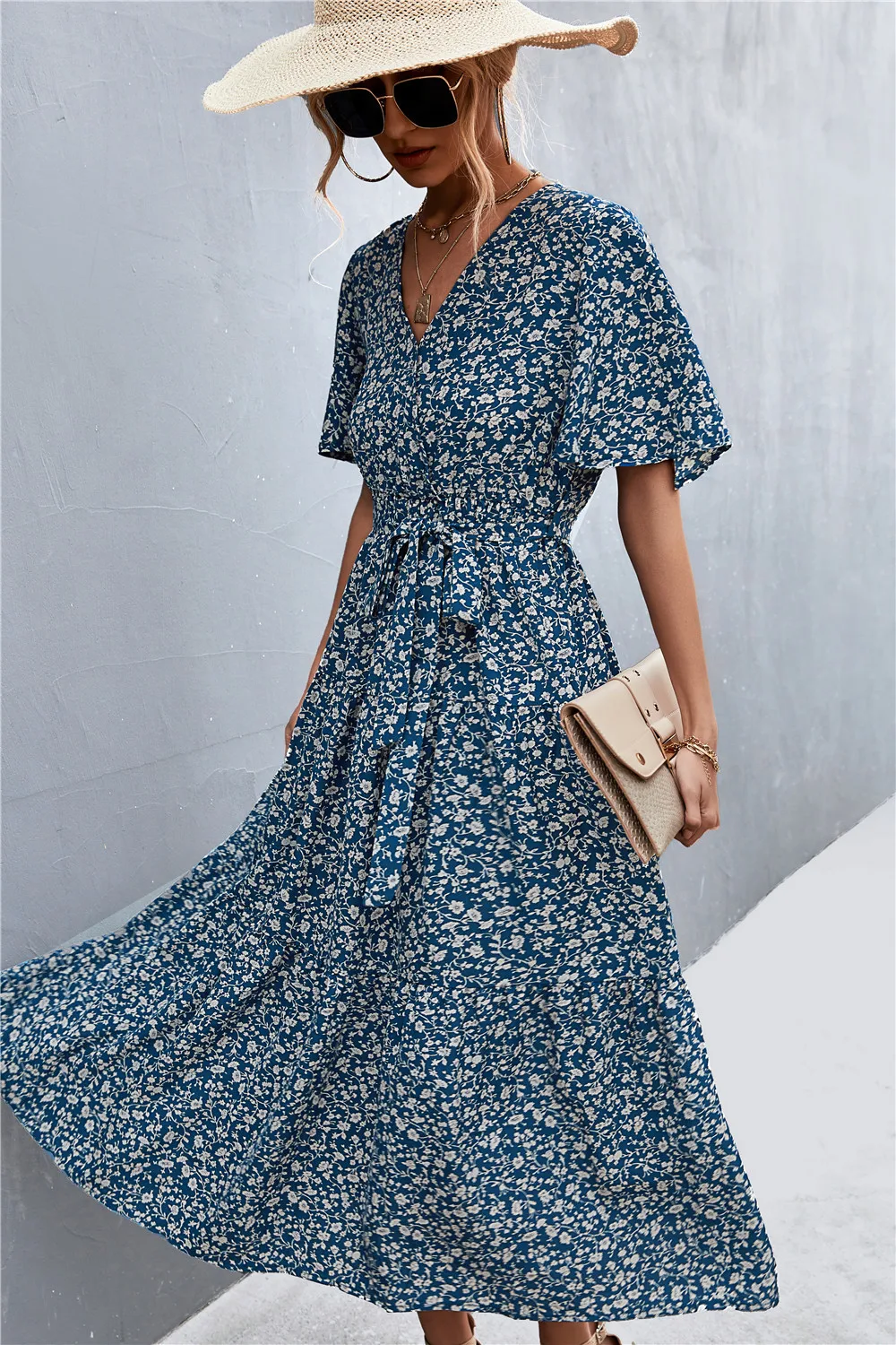 2022 Summer New Women V-neck Cross Polka Dot Floral Dress Strappy Long Dress Fashion Boho Pullover High Waist Maxi Dresses Robe