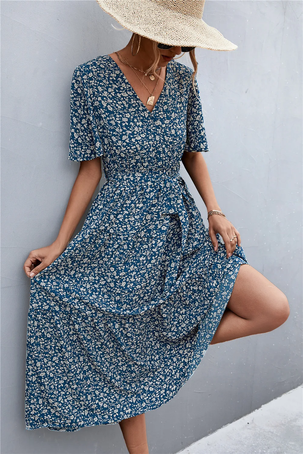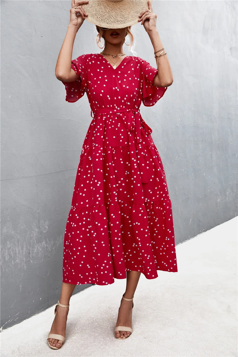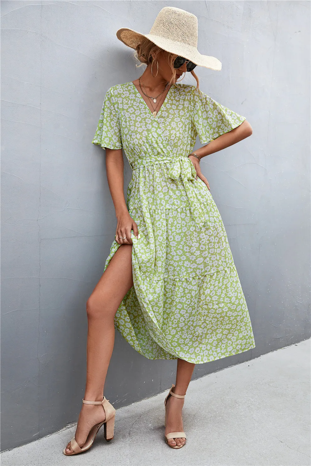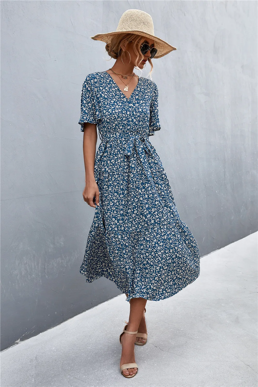2022 Summer New Women V-neck Cross Polka Dot Floral Dress Strappy Long Dress Fashion Boho Pullover High Waist Maxi Dresses Robe