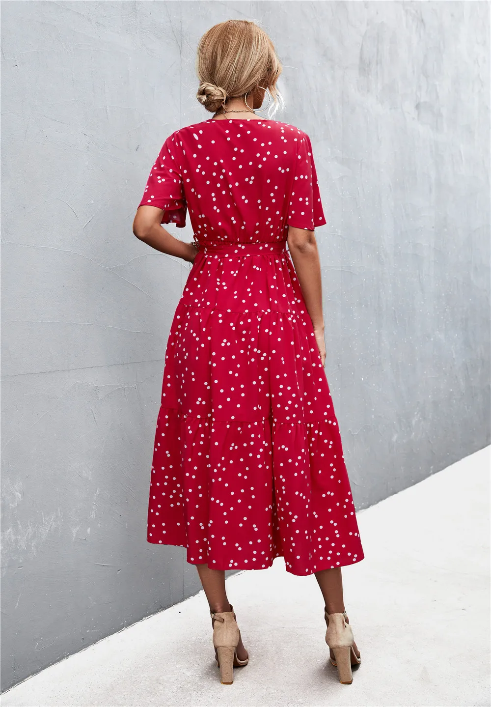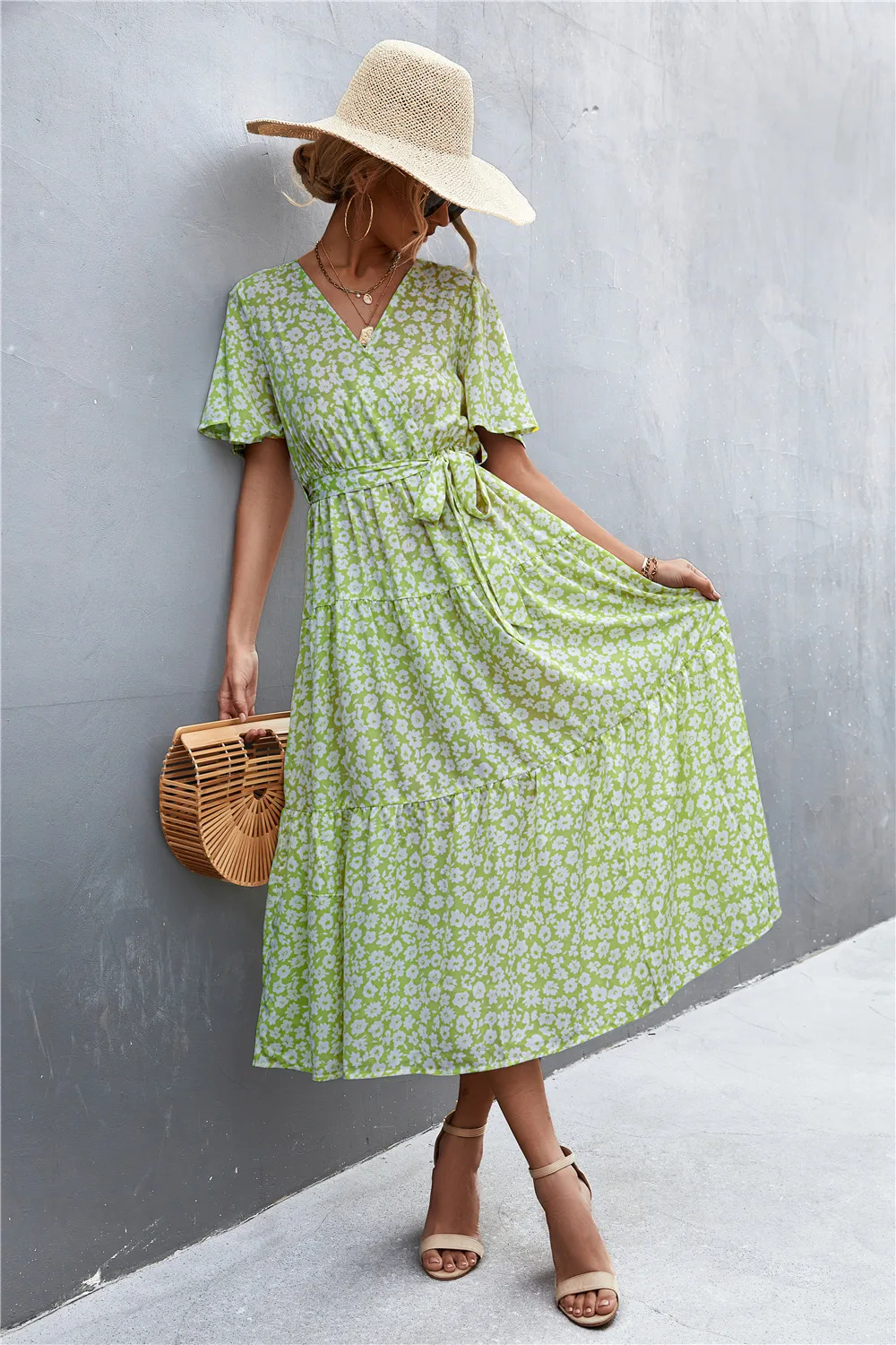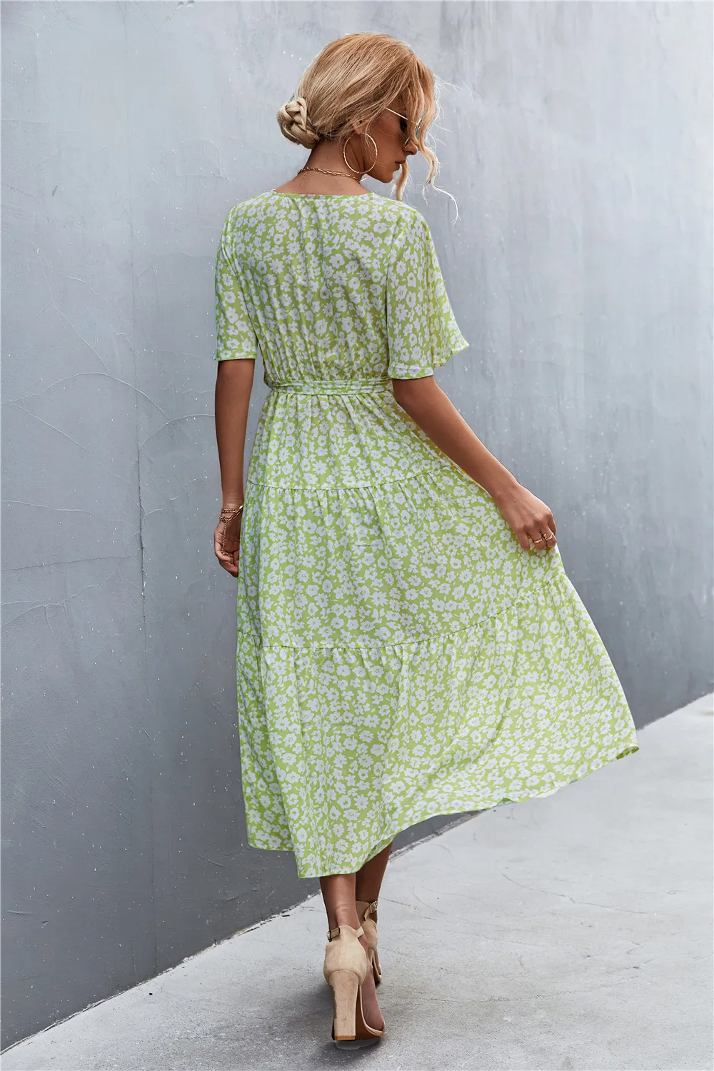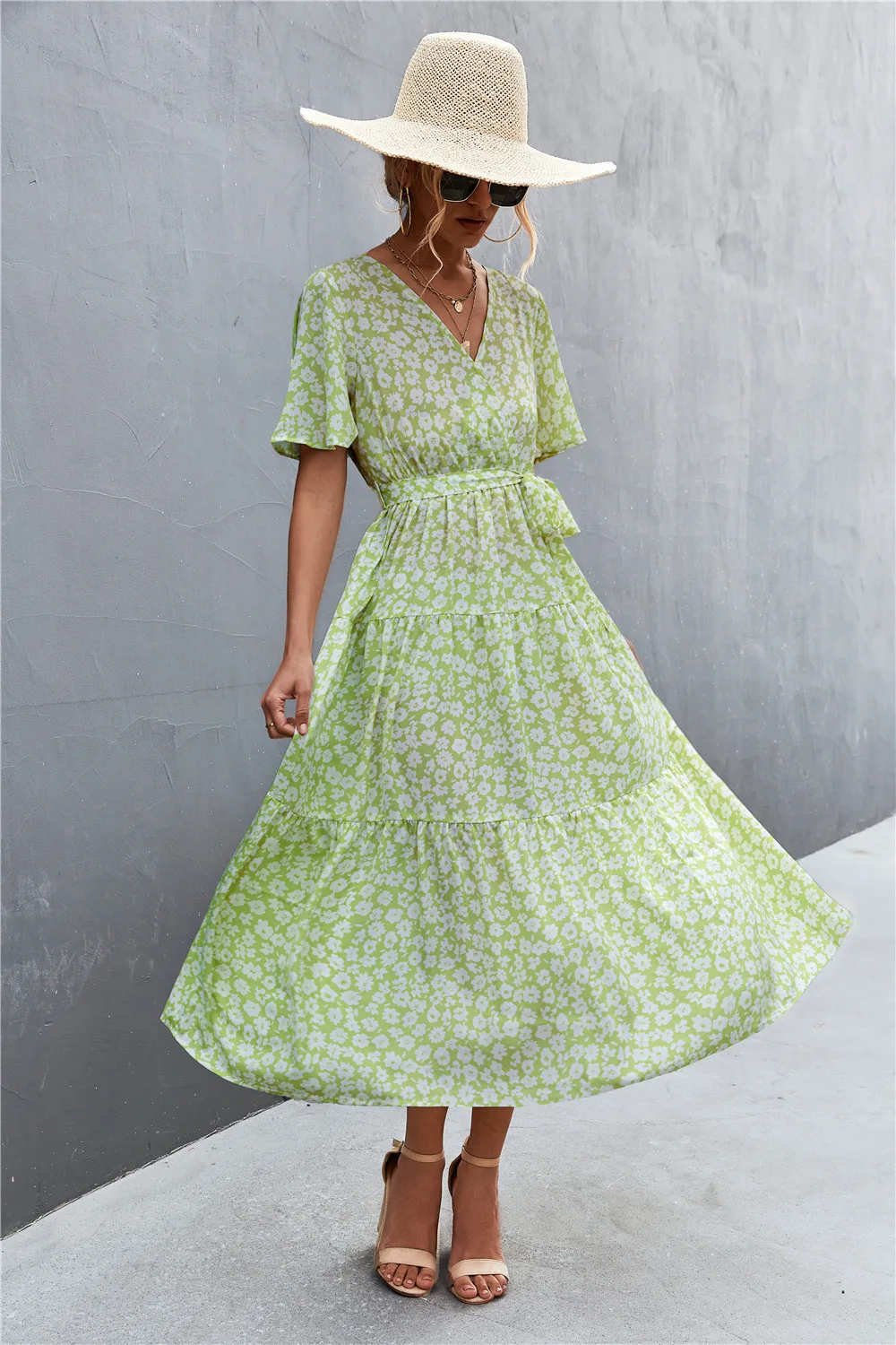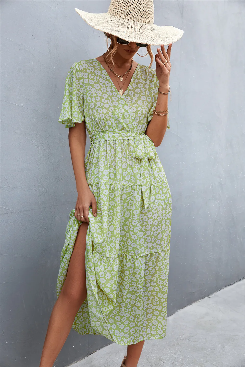 2022 Summer New Women V-neck Cross Polka Dot Floral Dress Strappy Long Dress Fashion Boho Pullover High Waist Maxi Dresses Robe