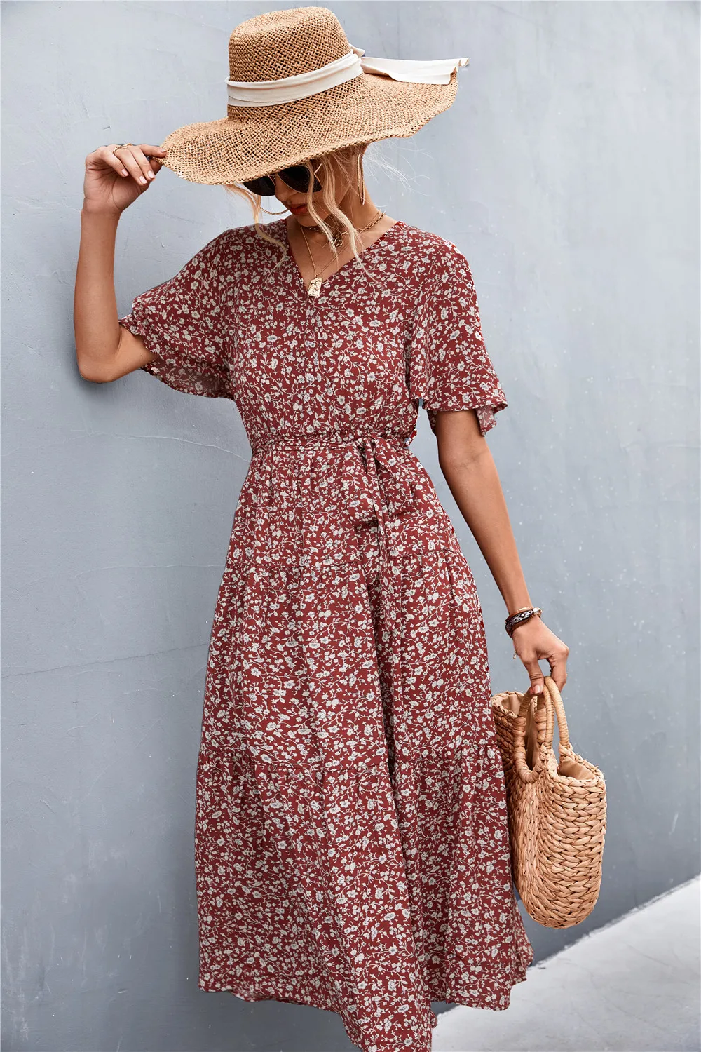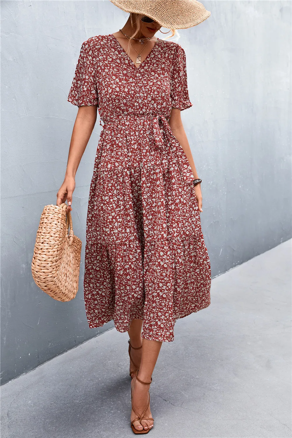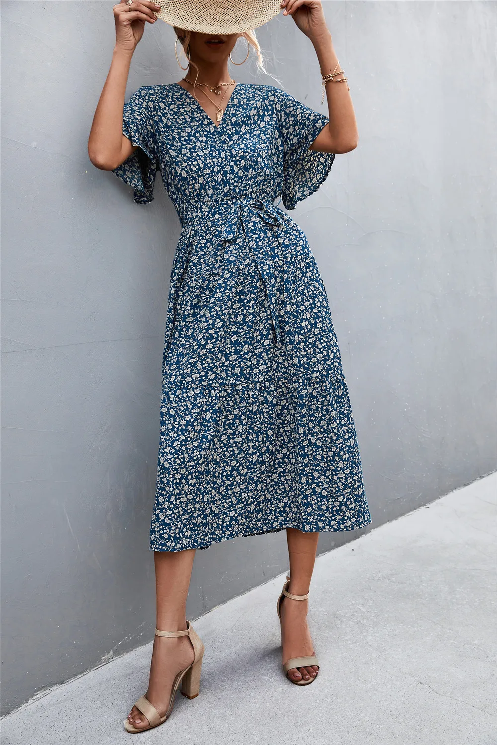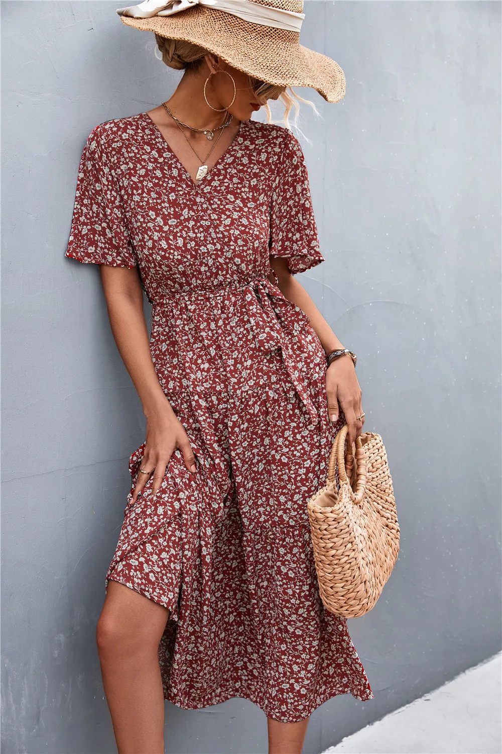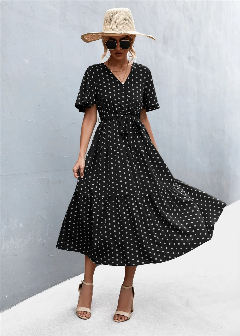 2022 Summer New Women V-neck Cross Polka Dot Floral Dress Strappy Long Dress Fashion Boho Pullover High Waist Maxi Dresses Robe